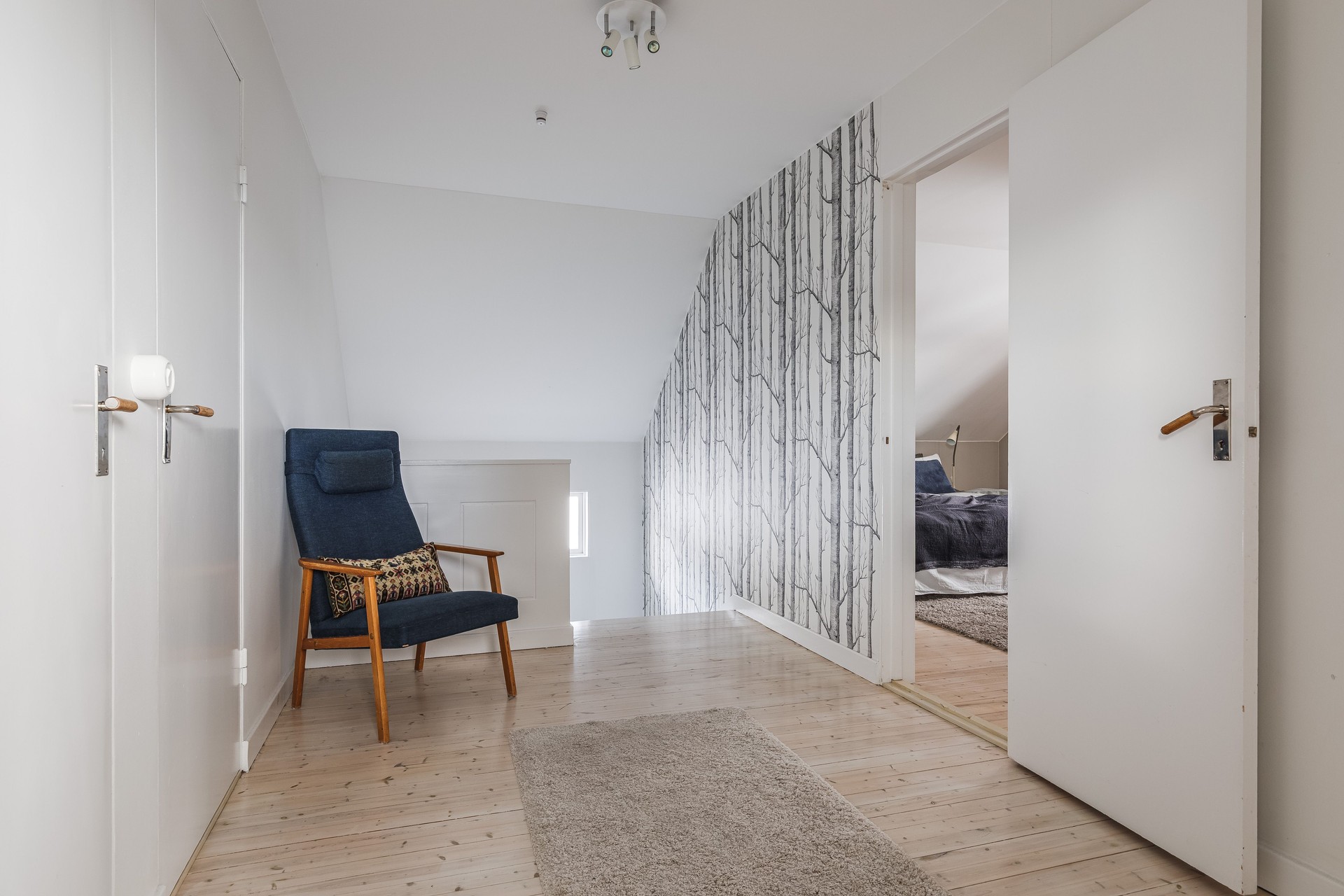 En fin trätrappa leder vidare upp till övervåningen som inleder med ett hallrum varifrån alla fyra sovrummen och badrummet nås. Trägolv, målade skivor på väggar och i tak.