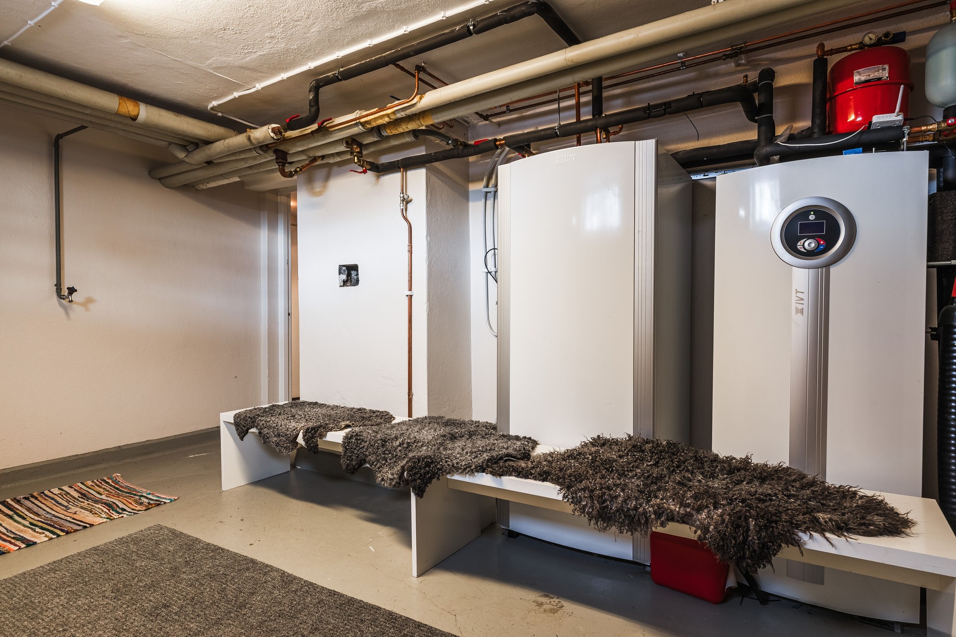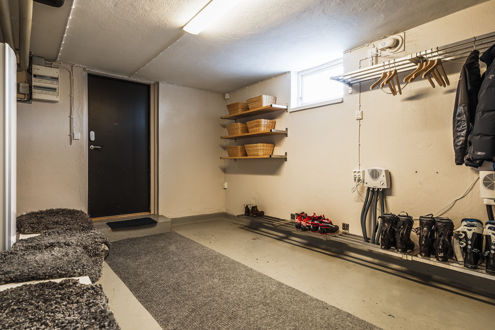 I källarvåningens groventré finns gott om utrymme för pjäxor, skor och vinterkläder. Rummet har sittbänkar, hyllförvaring och torkskåp. I samma rum finns även husets bergvärmepanna och ackumulatortank. Betonggolv.
