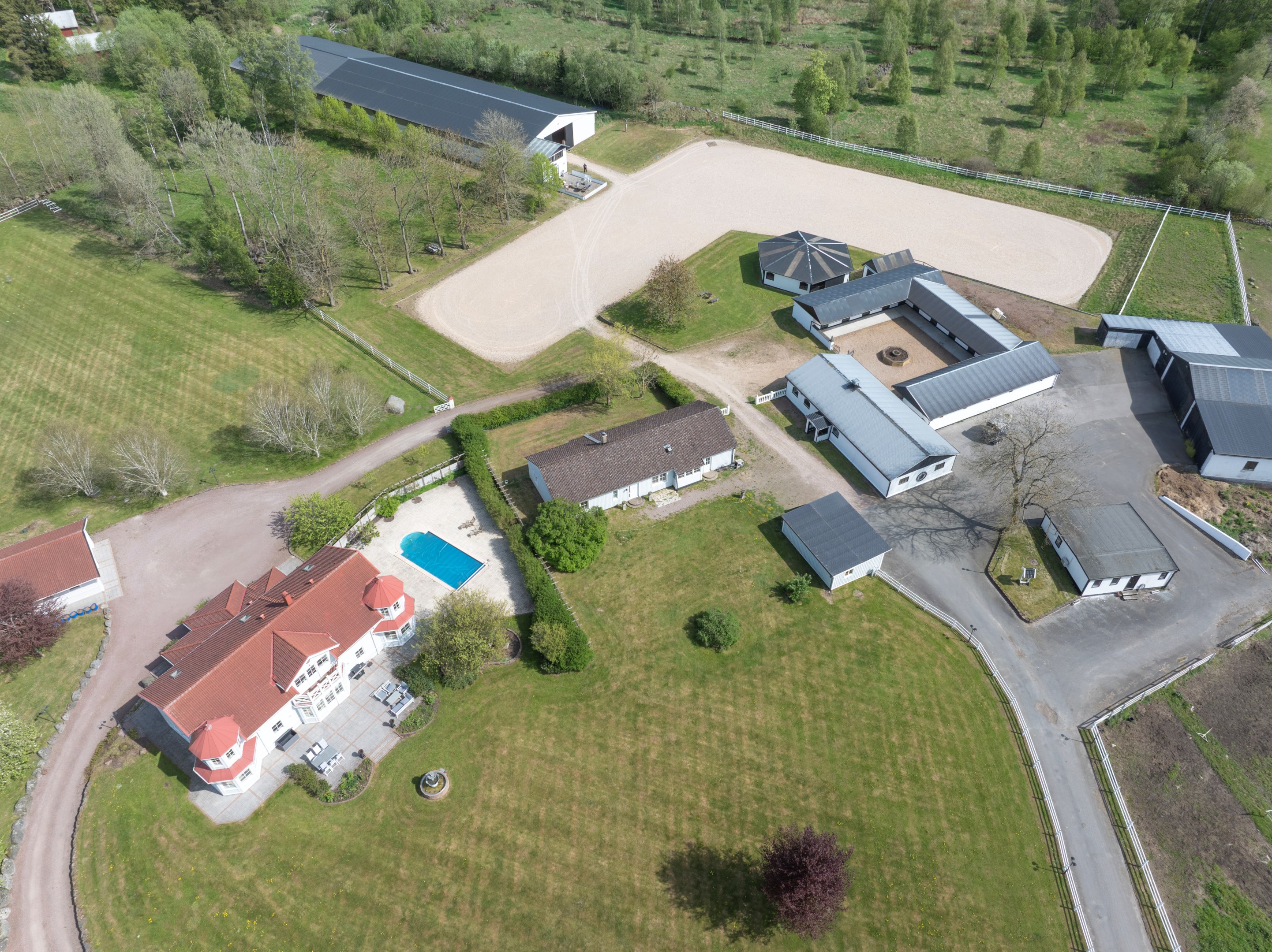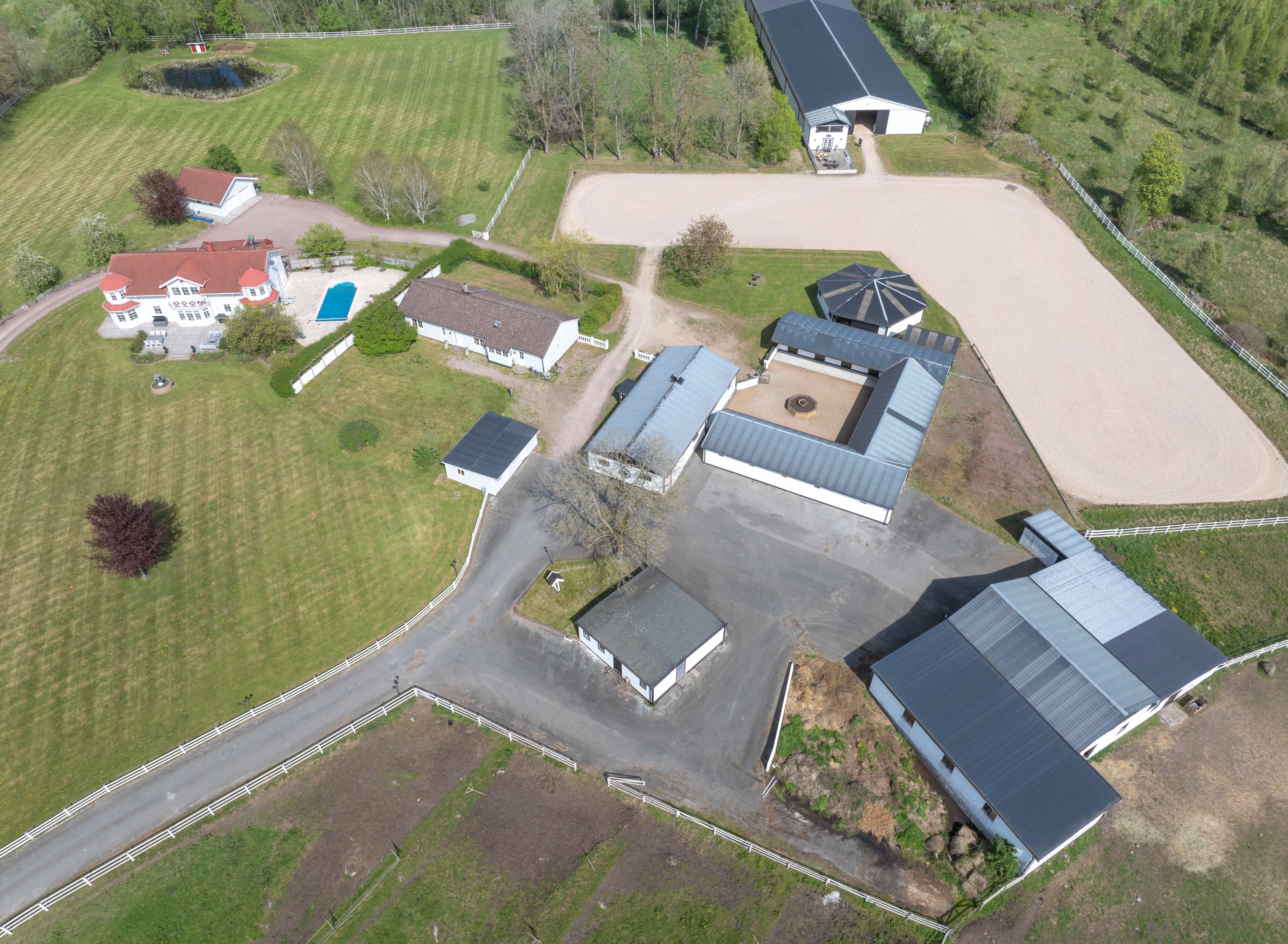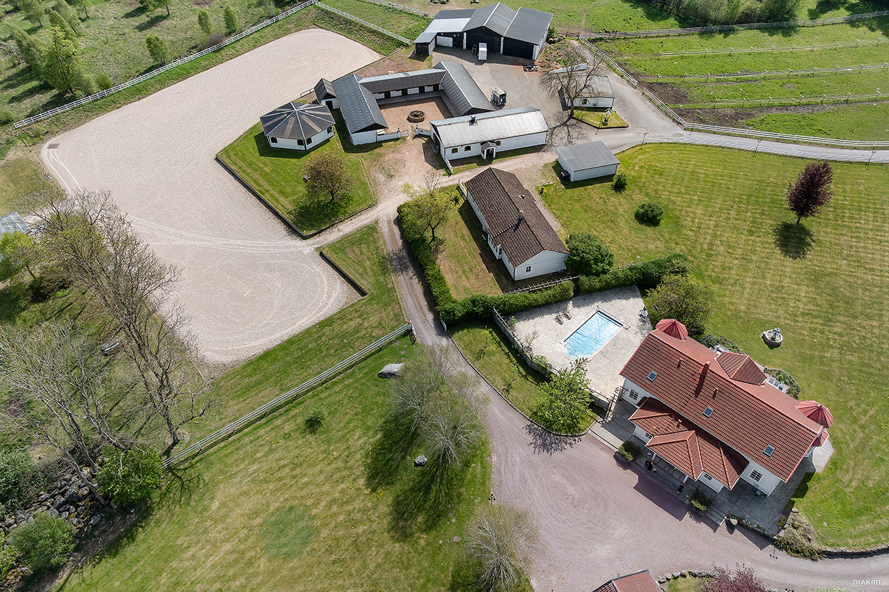 I det natursköna skånska landskapet strax utanför Linderöd väntar Springfield Farm – en av Sveriges mest välutrustade hästanläggningar, med ett läge och en helhet som sällan erbjuds. Här möts elegans, funktion och högklassig hästhållning i ett unikt koncept för dig som söker det bästa – vare sig du är ryttare, uppfödare, entreprenör eller vill investera i framtidens ridsportverksamhet. Med anor från elitryttarfamiljen Zetterman har gården varit hem för flera av landets främsta ryttare och är byggd för professionell hästhållning på högsta nivå. Fastigheten omfattar ca 18,4 hektar välskött mark och erbjuder stora möjligheter för vidareutveckling – exempelvis avstyckning, bostadsutveckling, eller etablering av träningsverksamhet för både ridsport och trav. Boende med elegans, komfort och gästutrymme Huvudbyggnaden om ca 390 kvm bär tydlig karaktär av både exklusivitet och värme, med klassiska detaljer, porch-veranda och genomgående kvalitativa materialval. Entréplanet bjuder på ett generöst vardagsrum, matsal, TV-rum samt ett Ballingslöv-kök i körsbärsträ – fullt utrustat och perfekt för både vardagsliv och representation. Badrummet är helkaklat med klinkergolv. En trappa upp väntar tre rymliga sovrum, varav ett med eget badrum, walk-in closet, ett allrum med balkong och ytterligare ett badrum. Det separata gästhuset om ca 168 kvm erbjuder ytterligare tre sovrum, vardagsrum med öppen spis, kök, badrum, gästtoalett, bastu och en praktisk groventré med tvättstuga. Perfekt för uthyrning, gäster eller personalboende. En komplett och genomtänkt hästanläggning Springfield Farm är utformad för att möta högt ställda krav. Här finns totalt 25 boxar fördelade på tre stallbyggnader – det största är ett U-format utestall med 15 boxar, och två mindre stall med sex respektive två boxar samt två sjukboxar. För träning året runt erbjuds ett imponerande ridhus om 20x75 meter med fiberunderlag. Den ljusa och luftiga konstruktionen skapar en inspirerande miljö både för träning och tävling. Intill ridhuset ligger Springfield Inn – en fullt isolerad loungebyggnad med bar och social yta samt panoramafönster mot ridbanan. Perfekt för att ta emot gäster, hålla möten, arrangera event eller följa träningen i lugn och ro. Utomhus finns två ridbanor – 80x27 meter och 50x30 meter – båda med fiberunderlag i högsta kvalitet. Dessutom finns en takförsedd skrittmaskin, ett skrittband i separat byggnad, stort maskingarage med hög port, två sjukboxar och god logistik för både träning och vård av hästar. Den öppna marken ger fantastiska möjligheter för att skapa träningsslingor, galoppbanor och ytterligare infrastruktur – vilket gör gården lika lämpad för trav som ridsport. Strategiskt läge med internationell räckvidd Gården ligger med perfekt tillgång till E22, vilket ger utmärkta pendlingsmöjligheter och smidiga transporter. Närheten till Öresundsbron, Malmö Airport och färjorna från Trelleborg och Ystad gör platsen idealisk även för dig med verksamhet eller tävlingsverksamhet i Danmark och övriga Europa. En investering i framtiden – och i livskvalitet Flexibelt markinnehav med möjlighet till avstyckning Fastigheten omfattar totalt fem fastighetsbeteckningar: Linderöd 32:1, Linderöd 4:2, Linderöd 3:14, Linderöd 5:46 samt Linderöd 3:49. Detta skapar goda förutsättningar för den som önskar sälja av delar av marken, genomföra avstyckning el Springfield Farm är mer än en fastighet – det är en komplett livsstil med oändliga möjligheter. En plats där passion för hästar, professionell utveckling och harmoniskt boende förenas i en och samma helhet. Oavsett om du söker en stark bas för din verksamhet eller vill skapa en drömgård att växa i, är detta en chans som inte ofta återkommer. Välkommen att uppleva Springfield Farm – ett unikt erbjudande i hjärtat av Skåne.