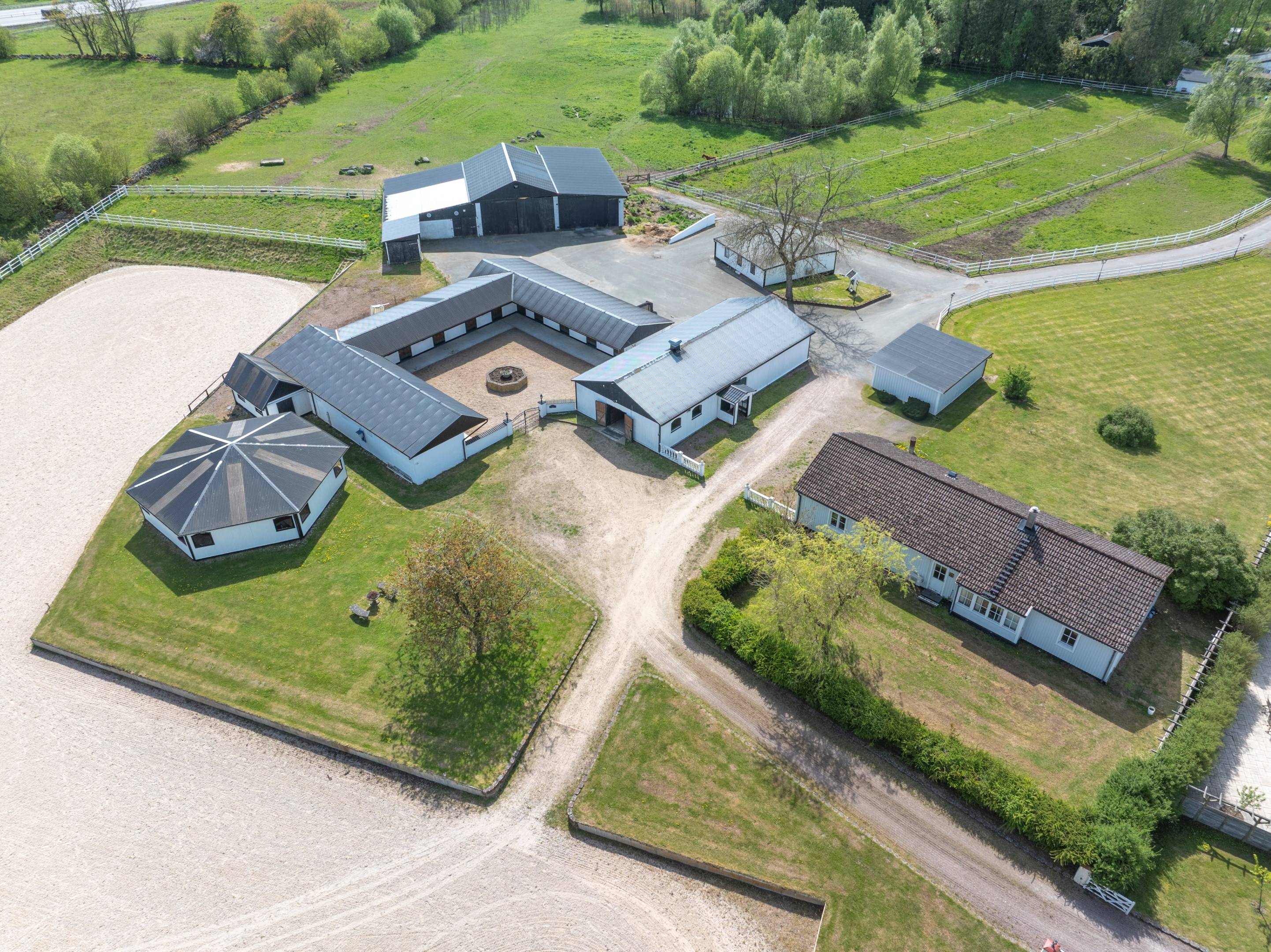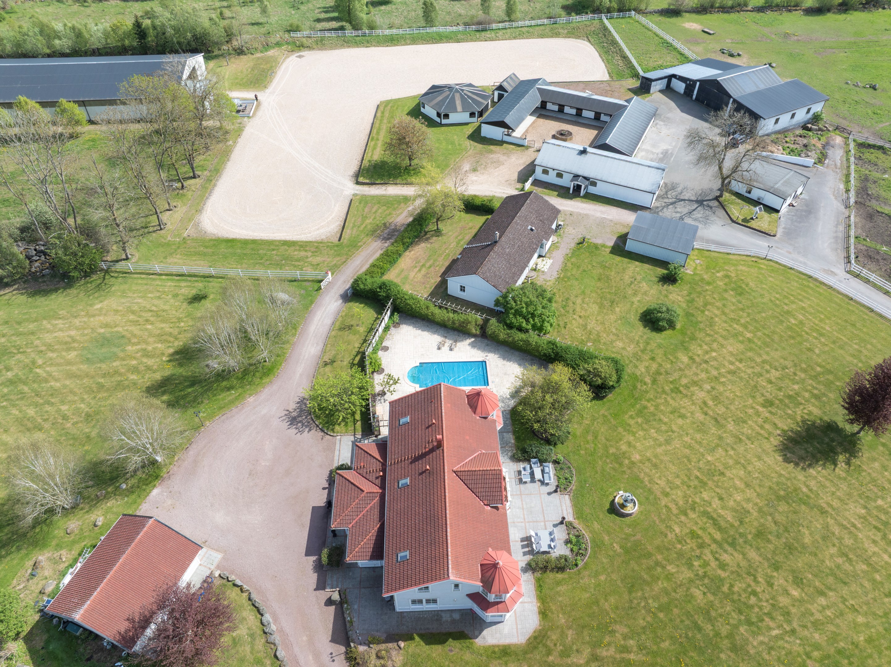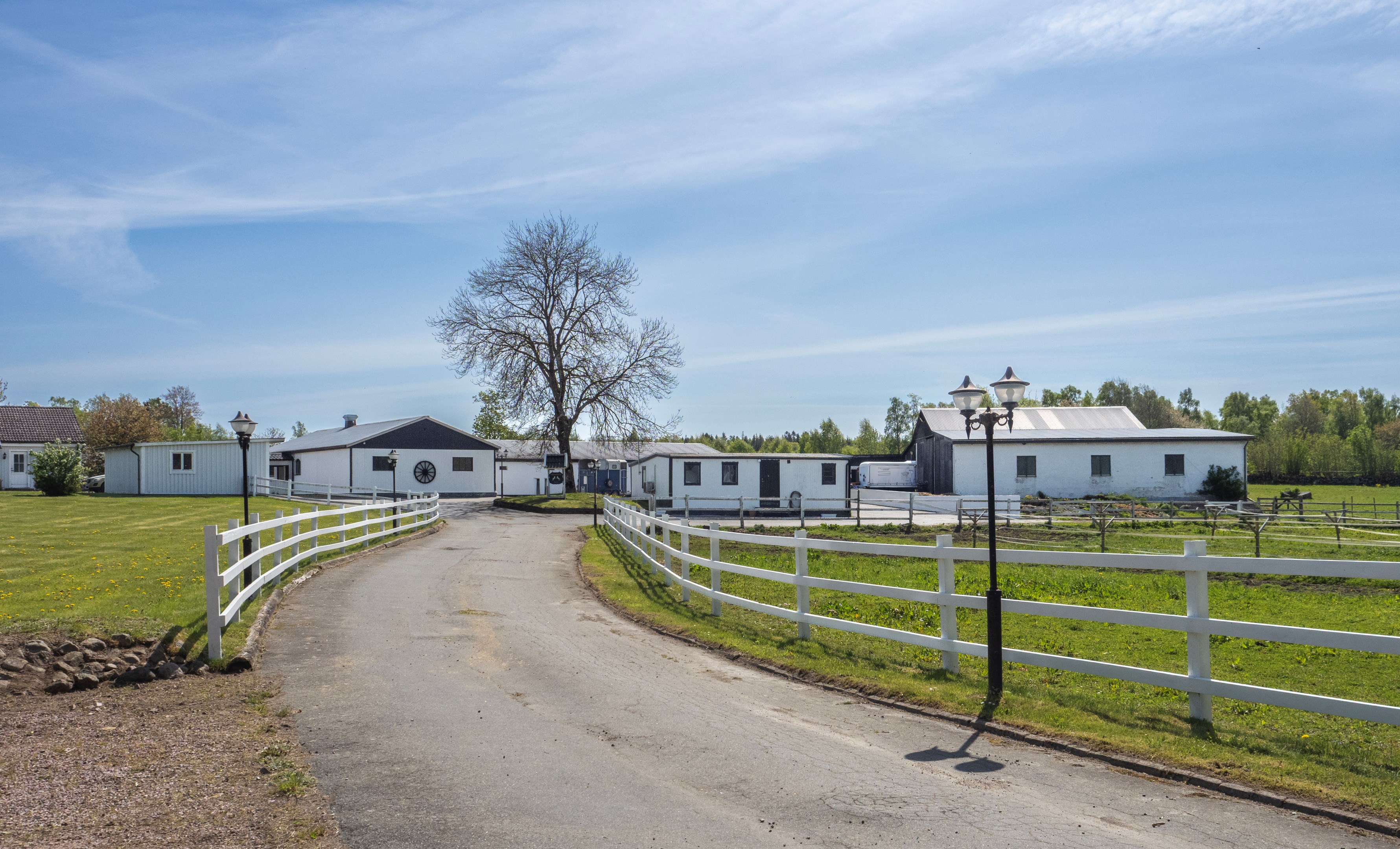 I det natursköna skånska landskapet strax utanför Linderöd väntar Springfield Farm – en av Sveriges mest välutrustade hästanläggningar, med ett läge och en helhet som sällan erbjuds. Här möts elegans, funktion och högklassig hästhållning i ett unikt koncept för dig som söker det bästa – vare sig du är ryttare, uppfödare, entreprenör eller vill investera i framtidens ridsportverksamhet. Med anor från elitryttarfamiljen Zetterman har gården varit hem för flera av landets främsta ryttare och är byggd för professionell hästhållning på högsta nivå. Fastigheten omfattar ca 18,4 hektar välskött mark och erbjuder stora möjligheter för vidareutveckling – exempelvis avstyckning, bostadsutveckling, eller etablering av träningsverksamhet för både ridsport och trav. Boende med elegans, komfort och gästutrymme Huvudbyggnaden om ca 390 kvm bär tydlig karaktär av både exklusivitet och värme, med klassiska detaljer, porch-veranda och genomgående kvalitativa materialval. Entréplanet bjuder på ett generöst vardagsrum, matsal, TV-rum samt ett Ballingslöv-kök i körsbärsträ – fullt utrustat och perfekt för både vardagsliv och representation. Badrummet är helkaklat med klinkergolv. En trappa upp väntar tre rymliga sovrum, varav ett med eget badrum, walk-in closet, ett allrum med balkong och ytterligare ett badrum. Det separata gästhuset om ca 168 kvm erbjuder ytterligare tre sovrum, vardagsrum med öppen spis, kök, badrum, gästtoalett, bastu och en praktisk groventré med tvättstuga. Perfekt för uthyrning, gäster eller personalboende. En komplett och genomtänkt hästanläggning Springfield Farm är utformad för att möta högt ställda krav. Här finns totalt 25 boxar fördelade på tre stallbyggnader – det största är ett U-format utestall med 15 boxar, och två mindre stall med sex respektive två boxar samt två sjukboxar. För träning året runt erbjuds ett imponerande ridhus om 20x75 meter med fiberunderlag. Den ljusa och luftiga konstruktionen skapar en inspirerande miljö både för träning och tävling. Intill ridhuset ligger Springfield Inn – en fullt isolerad loungebyggnad med bar och social yta samt panoramafönster mot ridbanan. Perfekt för att ta emot gäster, hålla möten, arrangera event eller följa träningen i lugn och ro. Utomhus finns två ridbanor – 80x27 meter och 50x30 meter – båda med fiberunderlag i högsta kvalitet. Dessutom finns en takförsedd skrittmaskin, ett skrittband i separat byggnad, stort maskingarage med hög port, två sjukboxar och god logistik för både träning och vård av hästar. Den öppna marken ger fantastiska möjligheter för att skapa träningsslingor, galoppbanor och ytterligare infrastruktur – vilket gör gården lika lämpad för trav som ridsport. Strategiskt läge med internationell räckvidd Gården ligger med perfekt tillgång till E22, vilket ger utmärkta pendlingsmöjligheter och smidiga transporter. Närheten till Öresundsbron, Malmö Airport och färjorna från Trelleborg och Ystad gör platsen idealisk även för dig med verksamhet eller tävlingsverksamhet i Danmark och övriga Europa. En investering i framtiden – och i livskvalitet Flexibelt markinnehav med möjlighet till avstyckning Fastigheten omfattar totalt fem fastighetsbeteckningar: Linderöd 32:1, Linderöd 4:2, Linderöd 3:14, Linderöd 5:46 samt Linderöd 3:49. Detta skapar goda förutsättningar för den som önskar sälja av delar av marken, genomföra avstyckning el Springfield Farm är mer än en fastighet – det är en komplett livsstil med oändliga möjligheter. En plats där passion för hästar, professionell utveckling och harmoniskt boende förenas i en och samma helhet. Oavsett om du söker en stark bas för din verksamhet eller vill skapa en drömgård att växa i, är detta en chans som inte ofta återkommer. Välkommen att uppleva Springfield Farm – ett unikt erbjudande i hjärtat av Skåne.