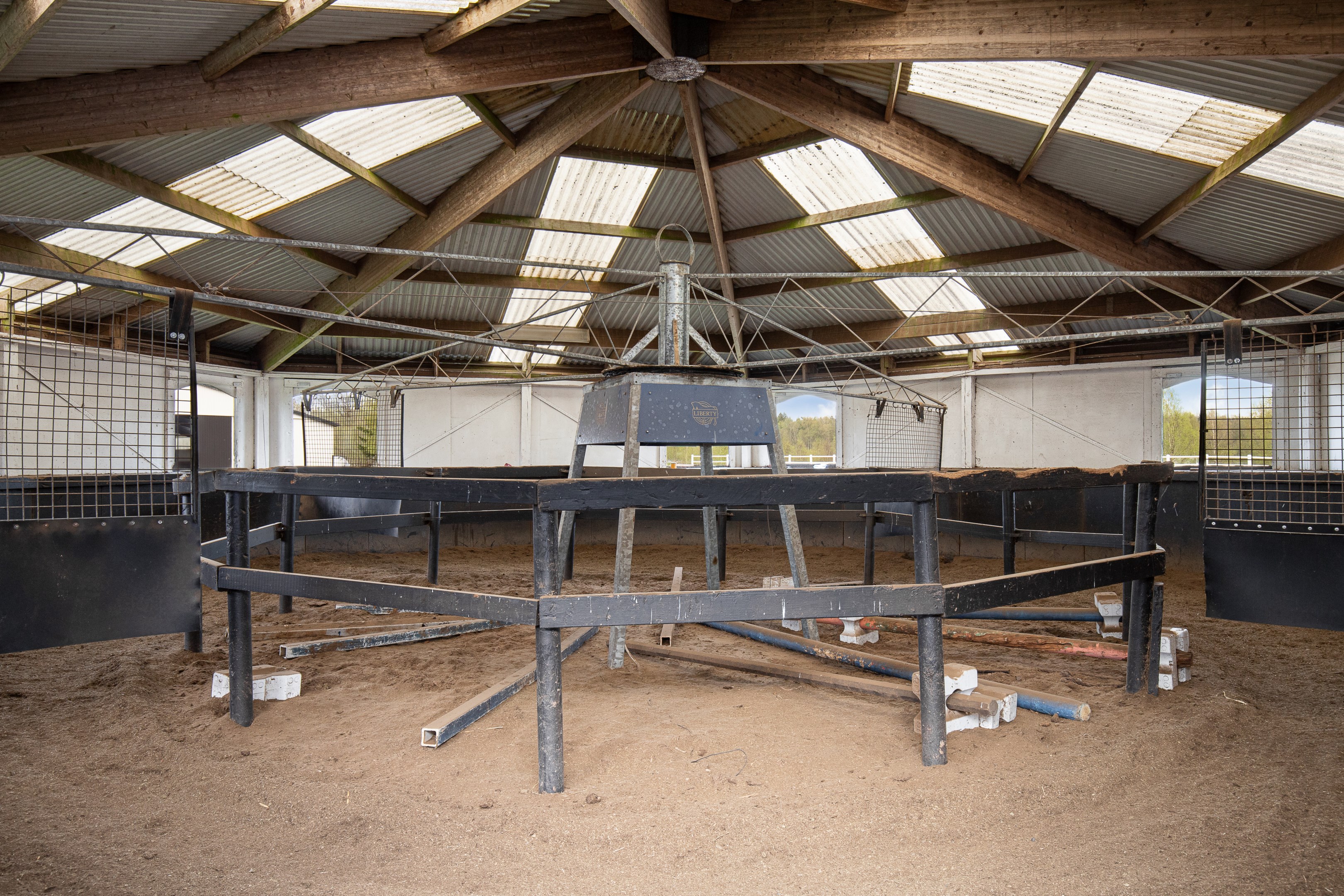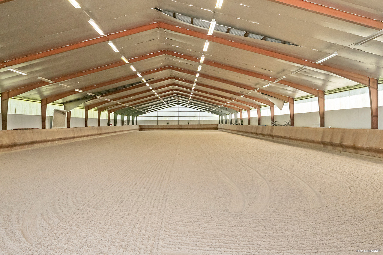 Ridhuset har plåtväggar under plåttak och mäter cirka 20 x 75 meter. Sarg (Expåra). I anslutning till ridhuset finns en isolerad tillbyggnad med två rum som används som bar. Underlag från: De Grondslag -