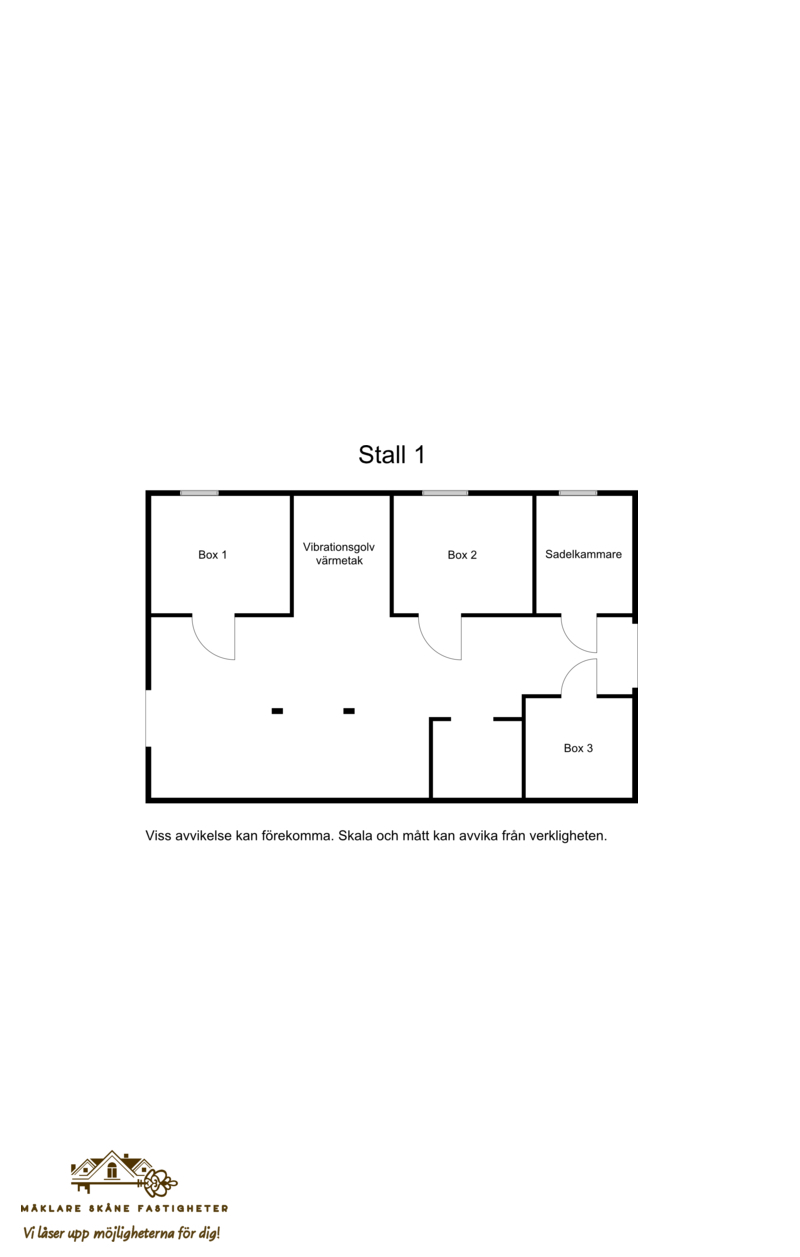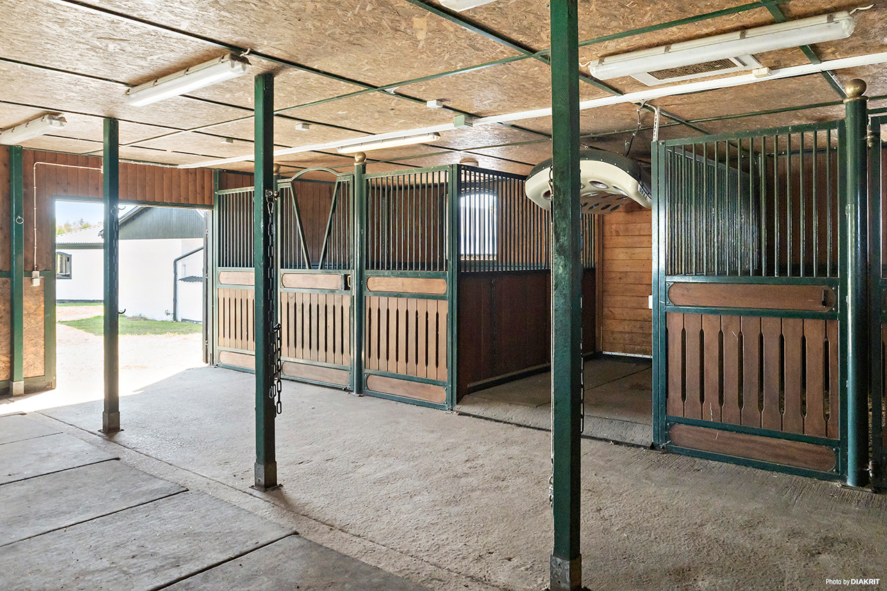 Stall 1 Stallet har plåtväggar under plåttak och innehåller två hästboxar, en sadelkammare, tre uppställningsplatser, spolspilta, solarium och vibrationsgolv, samt ett tvättrum. -