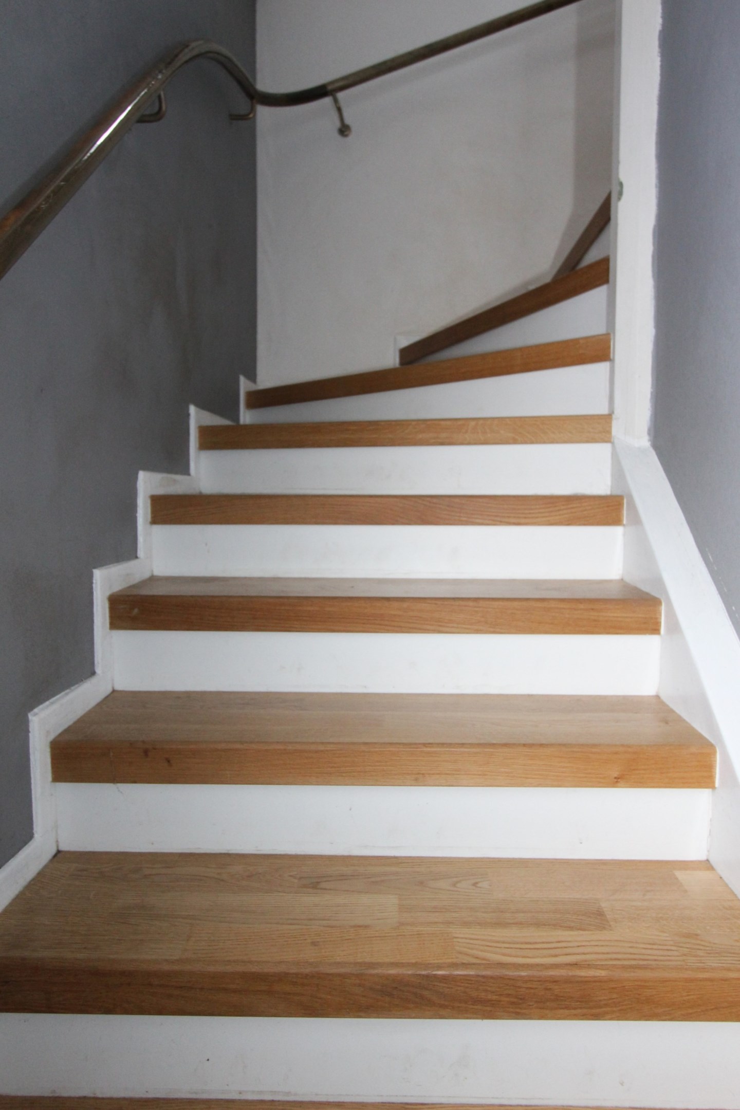 Trappan upp är nyrenoverad och har nu fått nya steg i ek. Den leder oss upp till en möblerbar hall med 1 takfönster, snedtak, plastmatta.