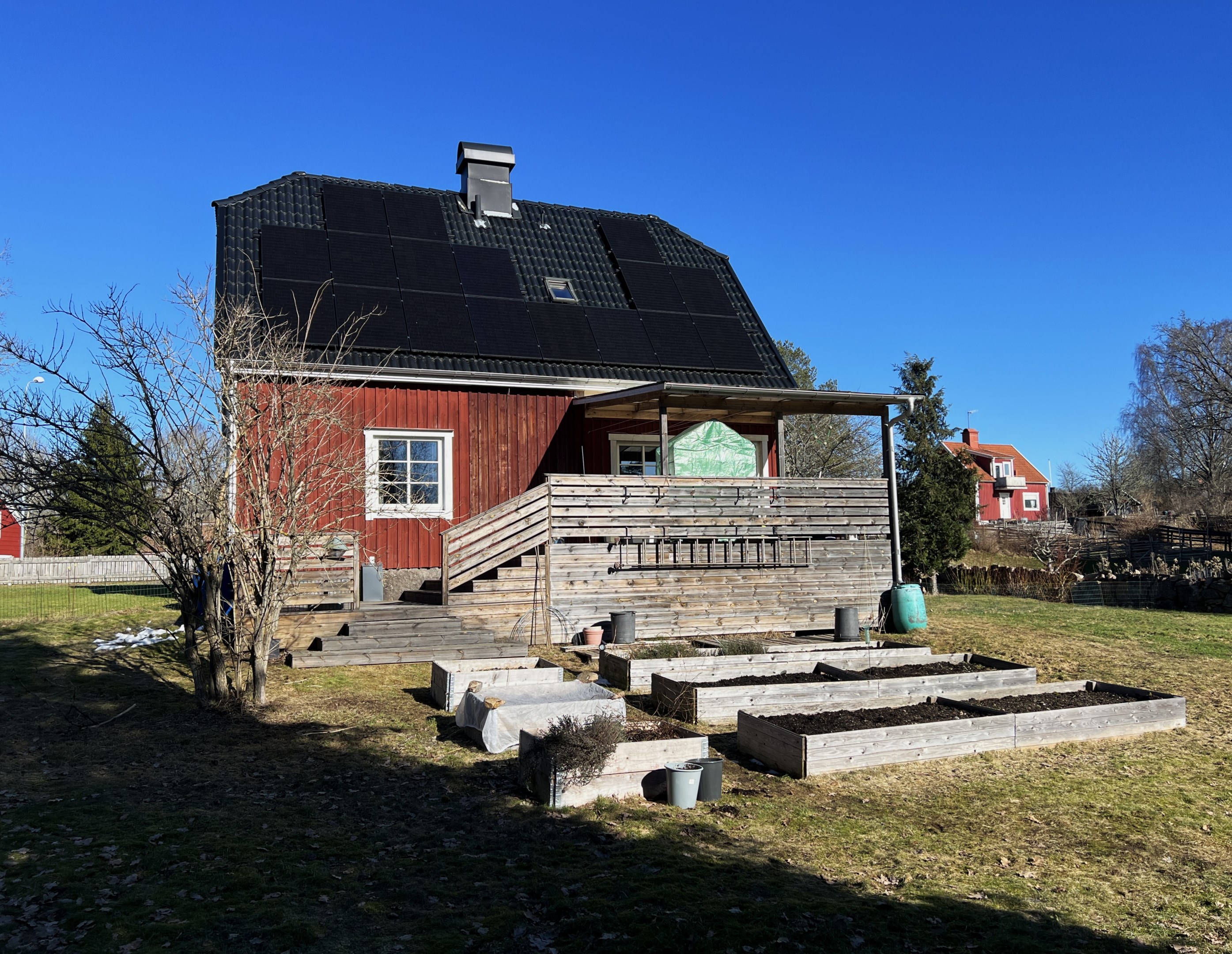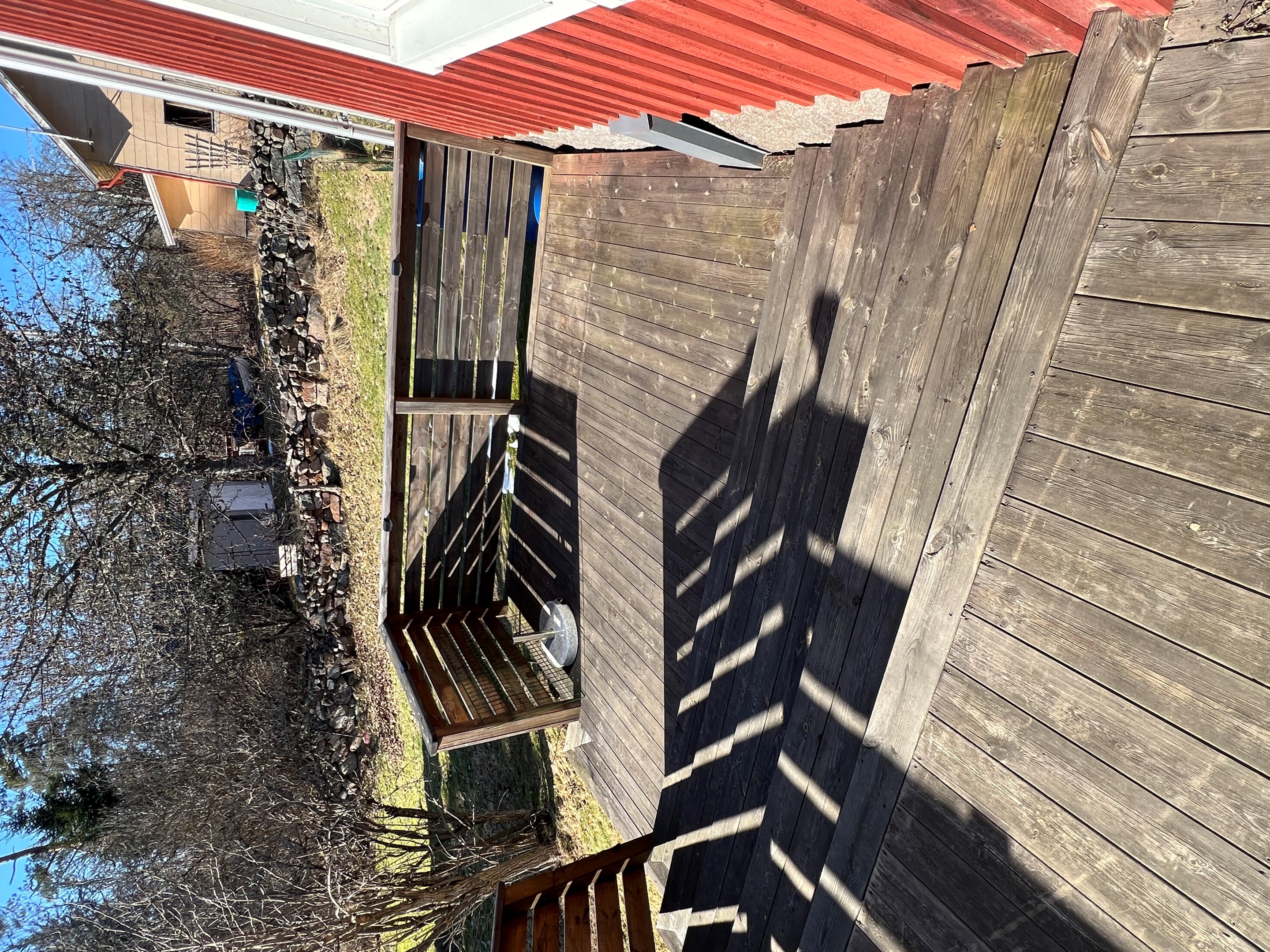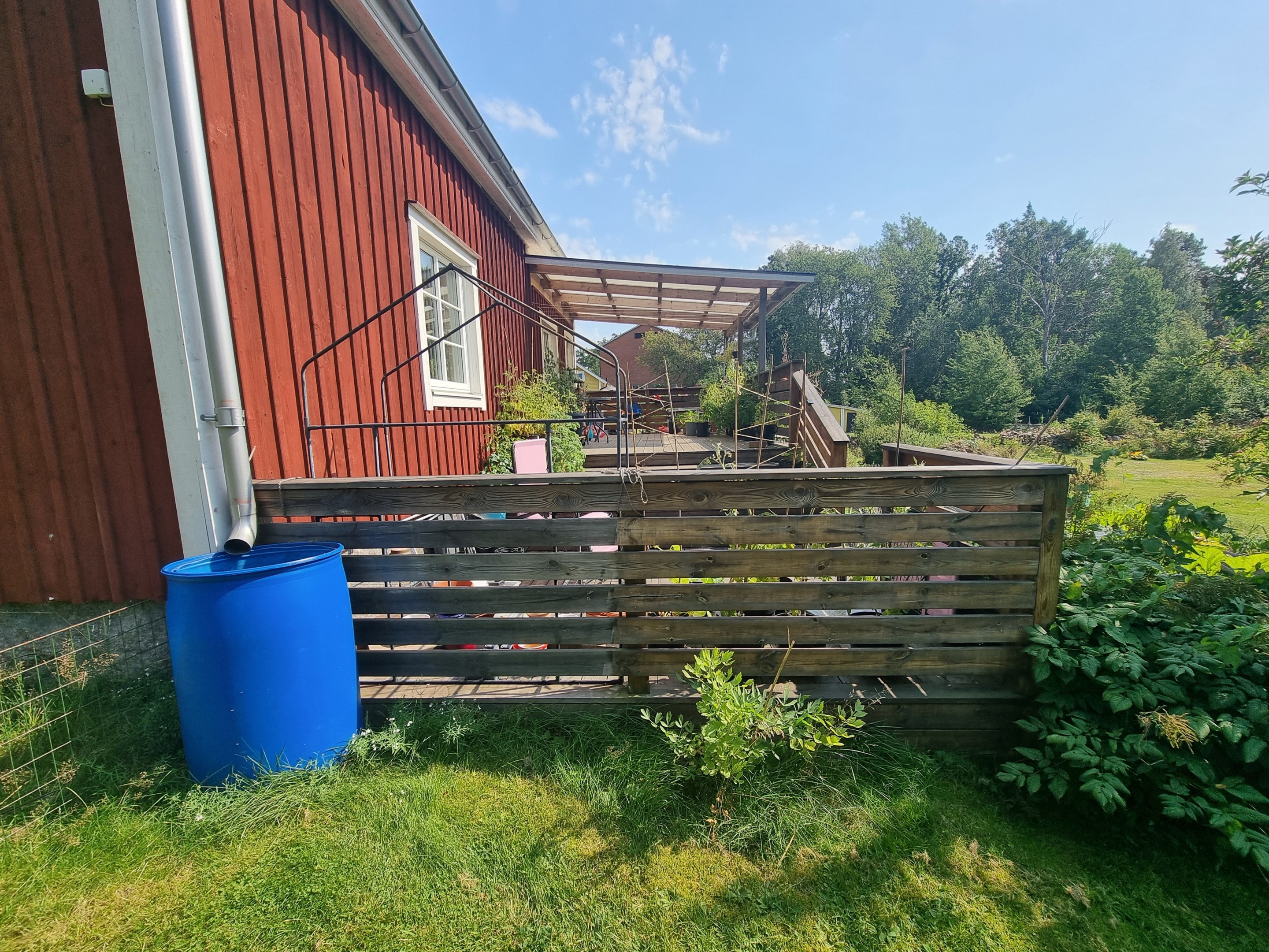 Veranda på framsidan och så det fina uterummet som täcker baksidan. Kanalplasttak på halva. Öppen del några trappsteg ner. Trätrall.