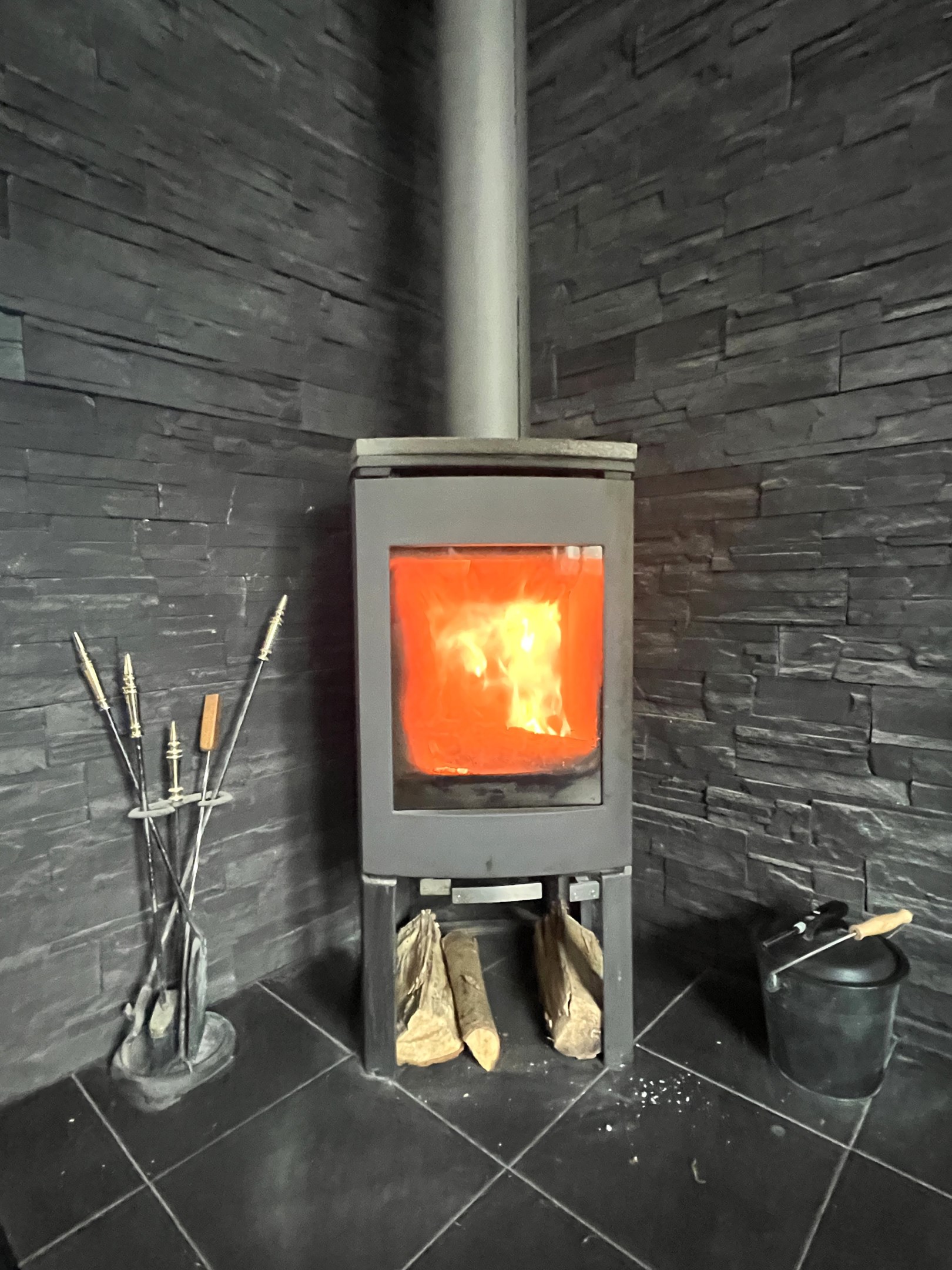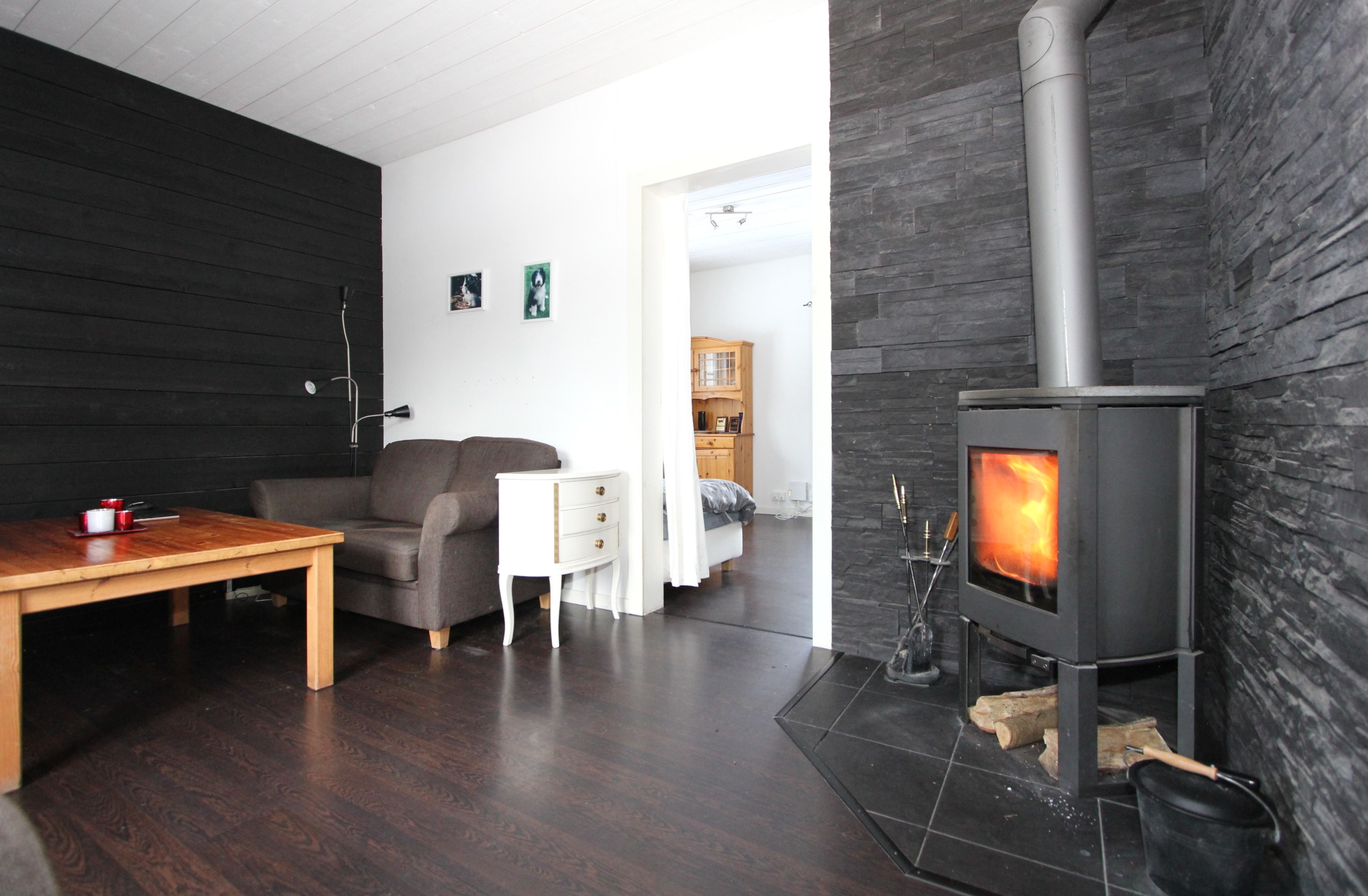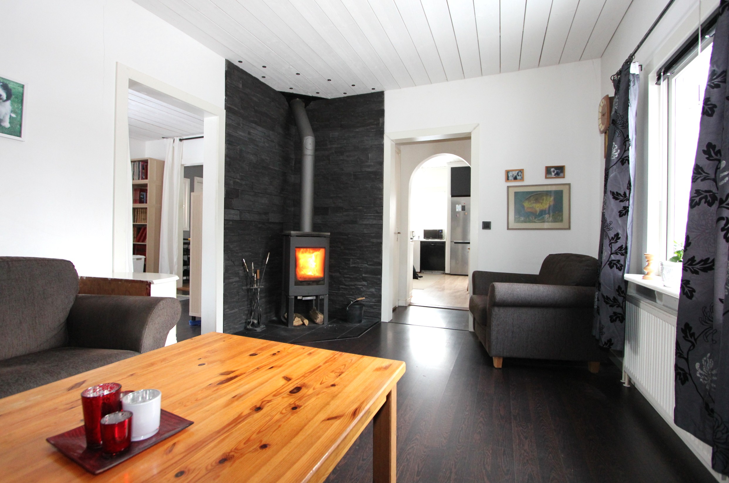 Bredvid ligger vardagsrummet där den härliga Jötulkaminen står som sprider så god värme. Klinker bakom och under kaminen. Även här är det mörklaserat trägolv. Trätak med infällda spotar över kaminen, 1 fönster.