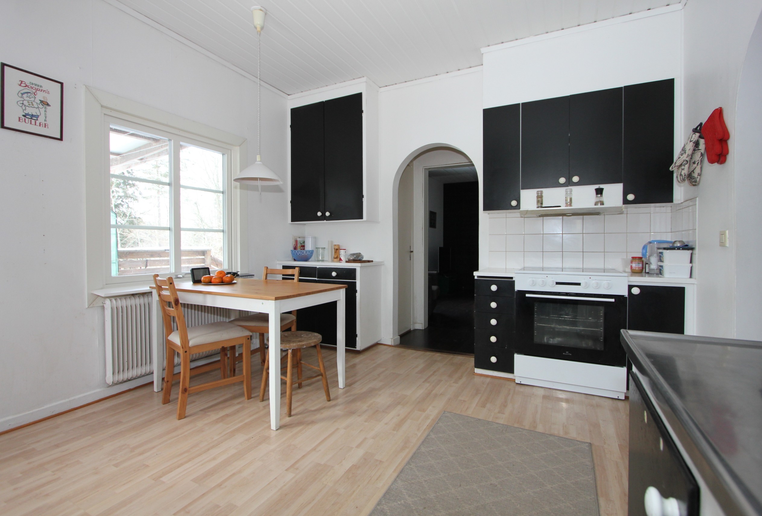Ett mysigt kök kommer därefter som även nås direkt från entréhallen. Här har den gamla skåpsinredningen behållits och ger en hemtrevlig karaktär. Kyl, frys, diskmaskin, spis och fläkt. 3 fönster samt utgång till det stora uterummet.