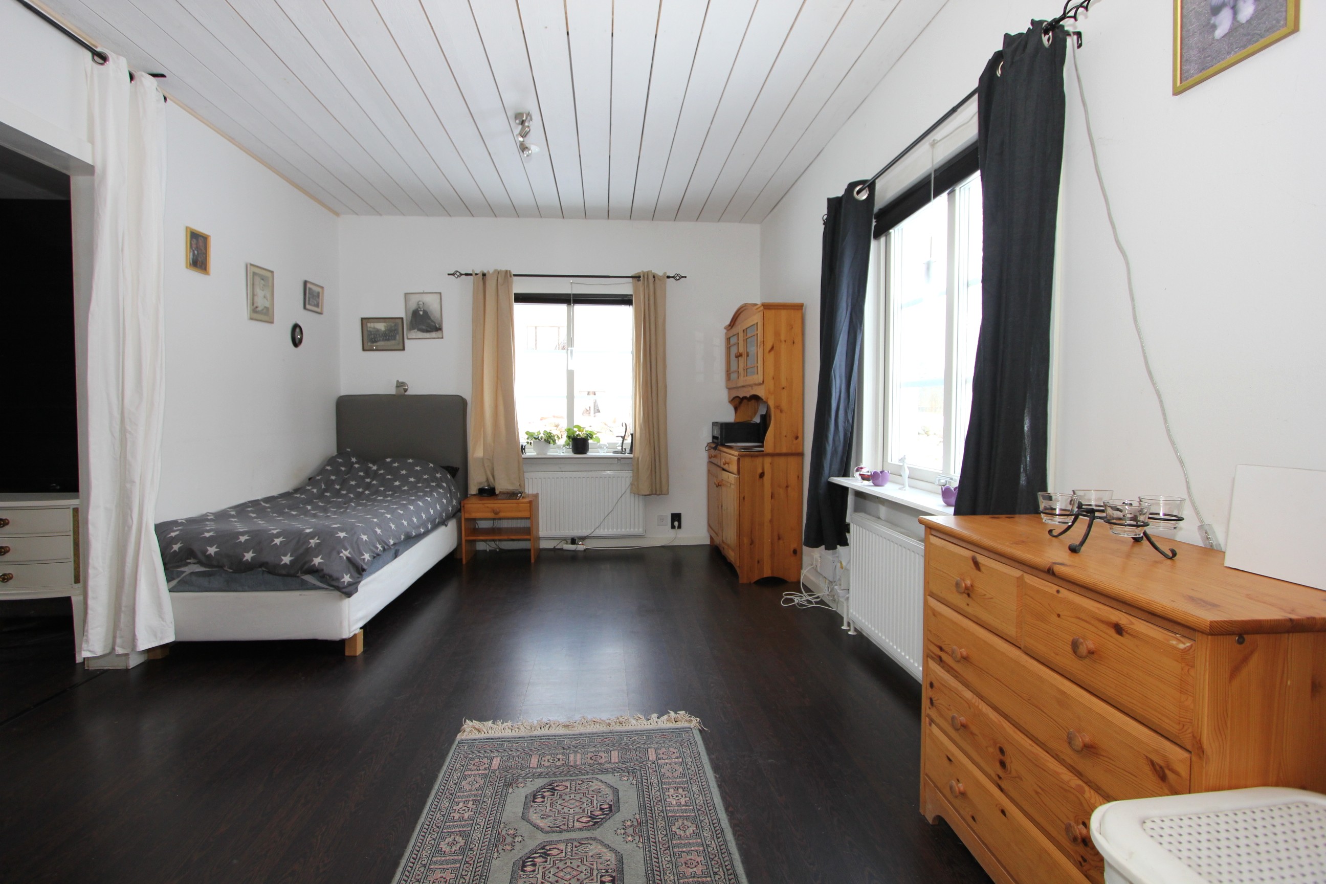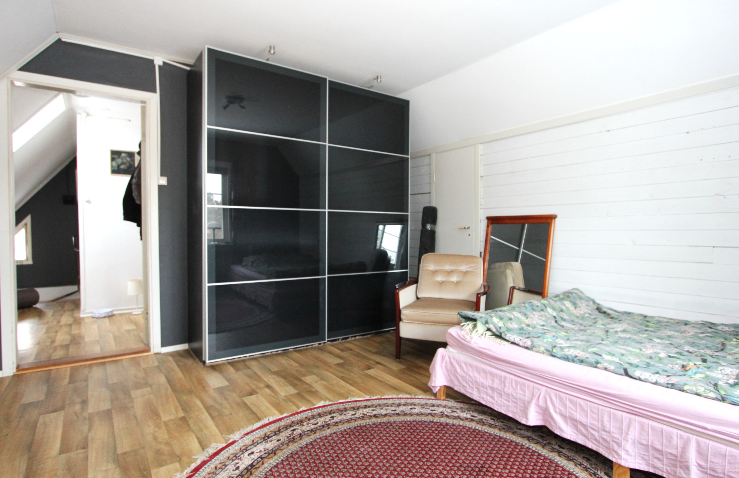 Rakt fram ligger sovrum 2 som är ett stort sovrum med 1 fönster, plastmatta, garderobsvägg med skjutdörrar, 2 praktiska kattvindar. Liggande målad råspont på två av väggarna.