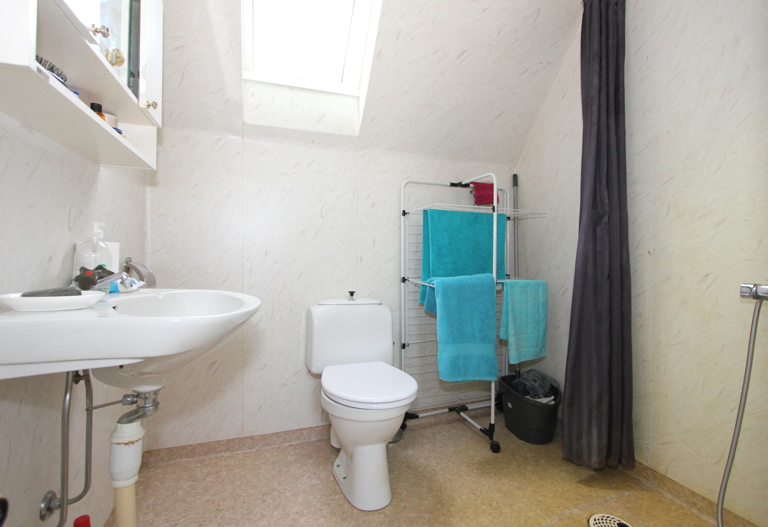 Badrummet renoverades -97 och har våtrumsmatta/tapet, dusch, toalett, tvättställ och takfönster.