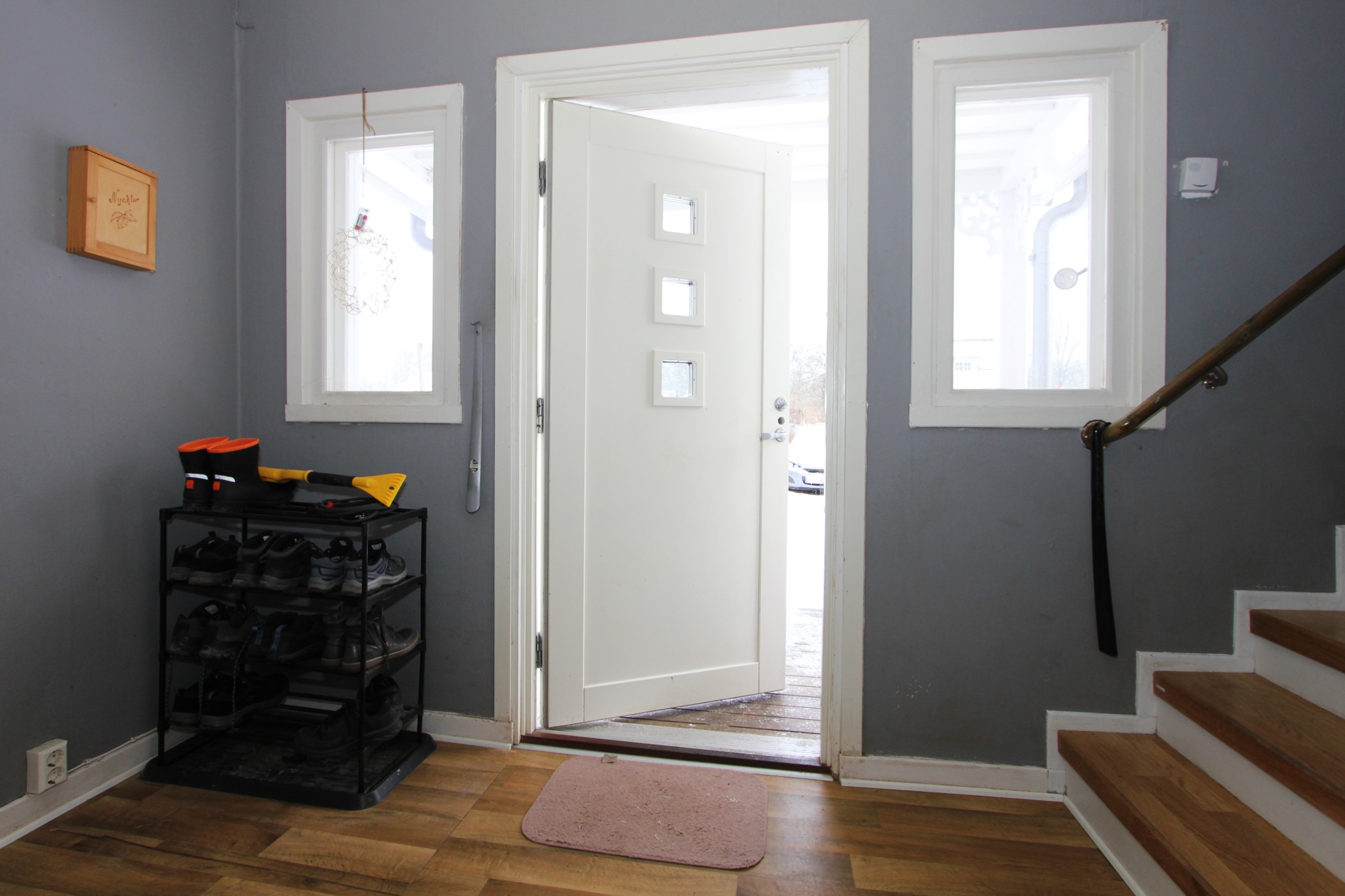 Morgonkaffet kan med glädje intas i solen på den överbyggda och trevliga verandan som välkomnar oss till detta mysiga hus. När vi öppnar dörren så kommer vi in i en entréhall med 2 fönster, plastmatta och klädförvaring. Trappa upp, källarnergång.