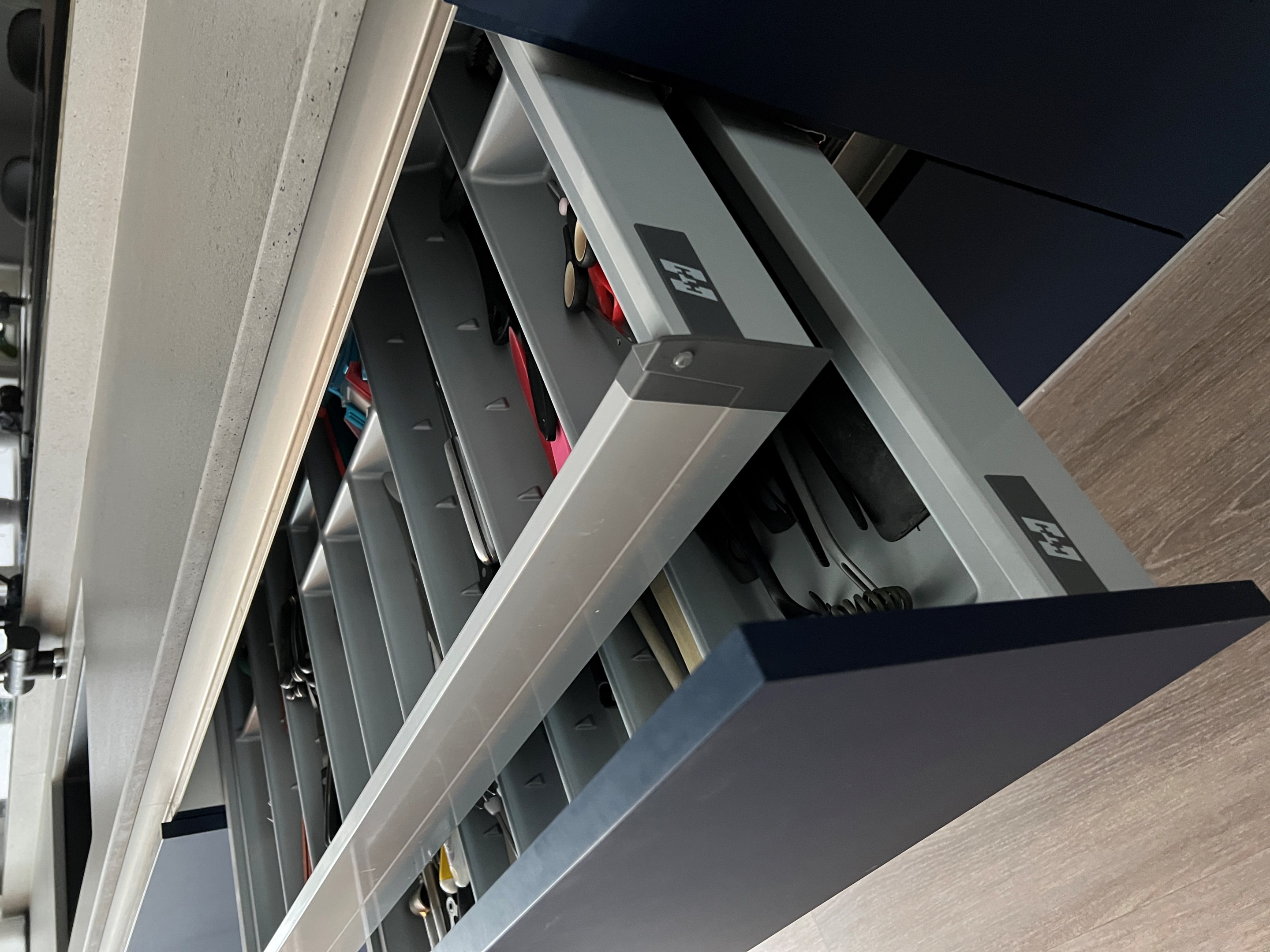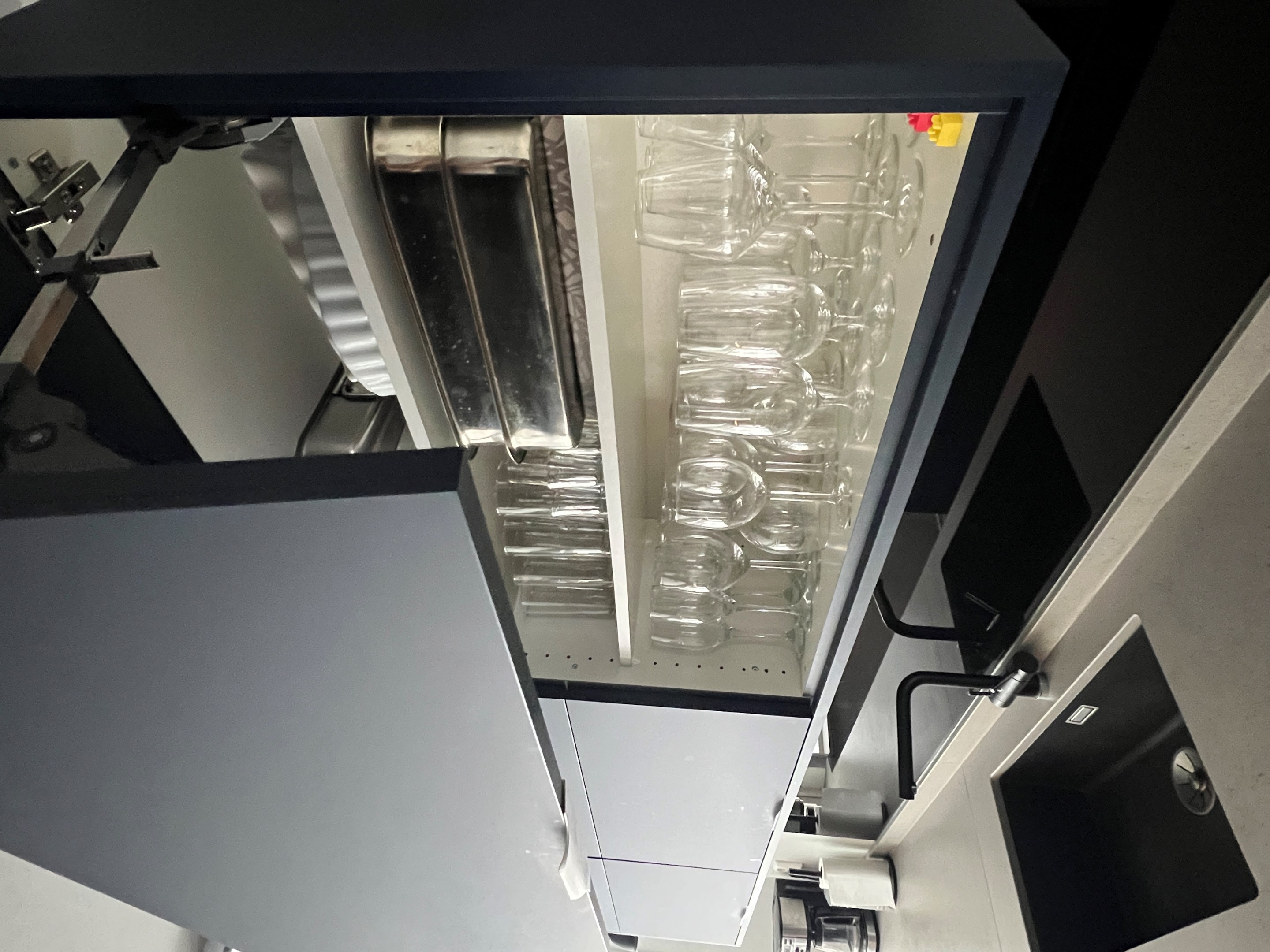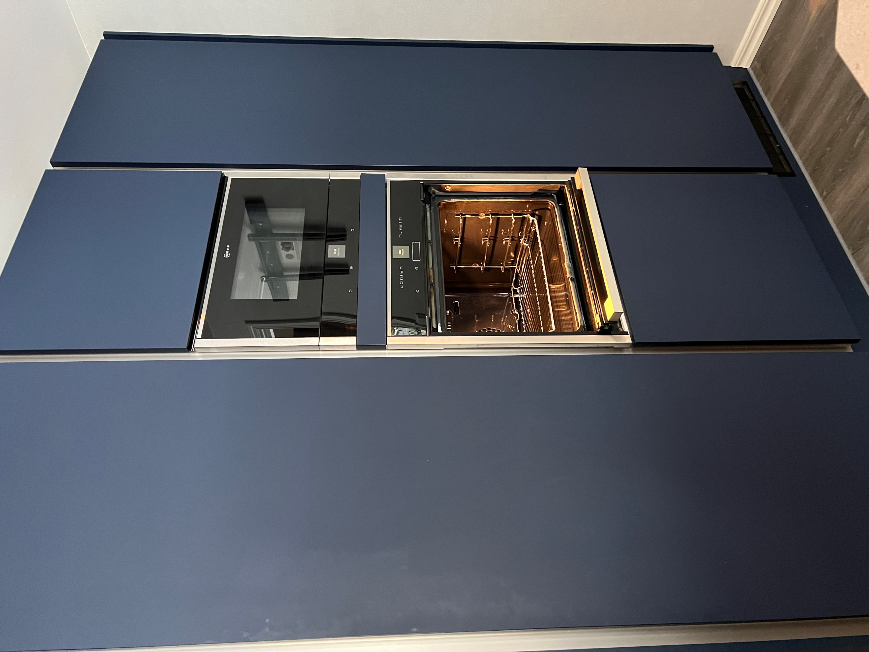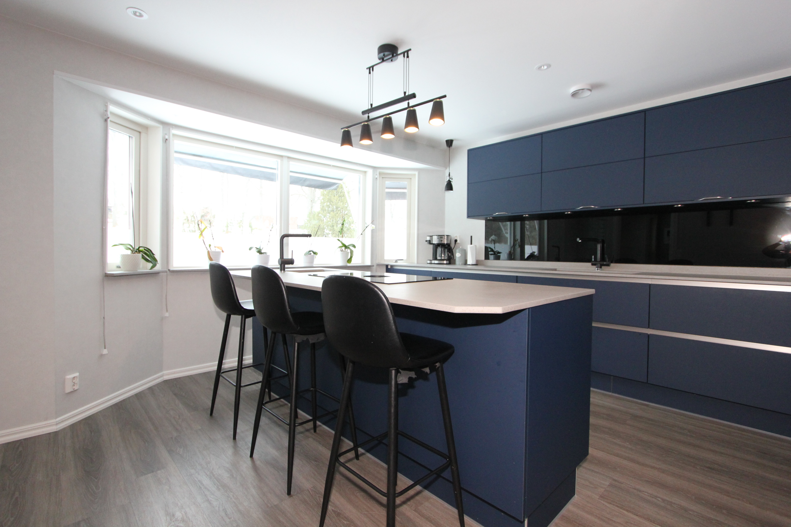 Redan när man kommer in i huset dras ögat mot det eleganta köket och nu går vi dit! Mot husets mitt. Köket är en dröm.... Det imponerande HTH-köket i midnattssblått är både elegant och funktionellt, med mycket förvaring och arbetsyta. Köket har dessutom många finesser. En rejäl köksö där många får plats; både att fika vid och jobba på har häll med infälld fläkt. Ugnens lucka går att fälla in och överskåpens luckor öppnas uppåt - alla är smarta detaljer som underlättar i köksarbetet. Och mycket förvaring - inte minst i lådorna - där ryms nämligen 2 lådor i varje! Arbetsytorna är många och med gott om plats. Köket är verkligen en social plats som samlar familj och vänner. Ljusa laminatbänkar som matchar den vackra blå färgen. Spisen är från Bora, ugn och micro från Neff, kyl och frys samt diskmaskin. I kök, matrum och entrén finner vi Kährs vinylgolv - ett slitstarkt och hållbart golv. Det vackra burspråket med 4 fönster låter ljuset flöda in på ett behagligt sätt.