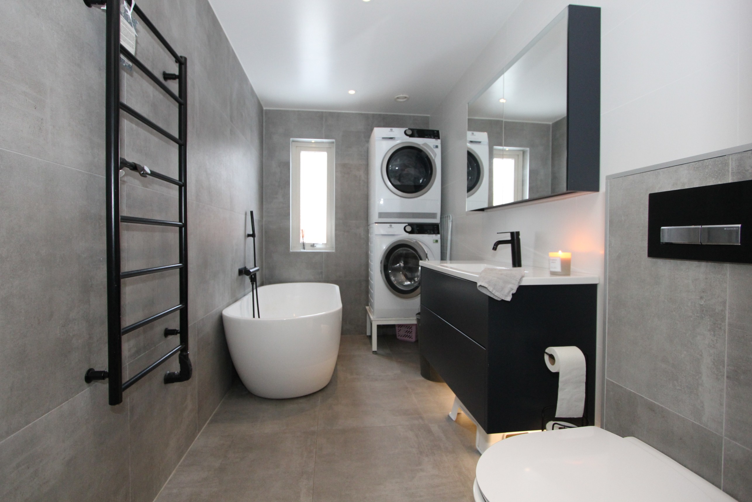 Och så har vi badrummet. Jag säger bara det....så elegant! Utrustat med stora grå kakelplattor på väggar och golv. Stilrent badkar, Huskvarna tvättmaskin och torktumlare i pelare. Handdukstork, tvättställ i kommod samt vägghängd toalett. Infällda spotar och 1 högskåp med glasdörr. 1 fönster. Givetvis golvvärme som är gott under fötterna. Som ett spa hemma!!