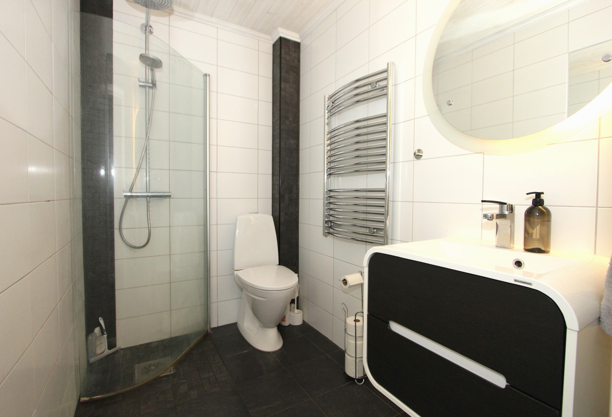 Mittemot ligger den här sovsidans badrum. Elegant med kakel och klinker, duschhörna, elektrisk handdukstork, tvättställ i kommod samt toalett. Spegel med bakomliggande belysning. Trätak med infällda spotar.