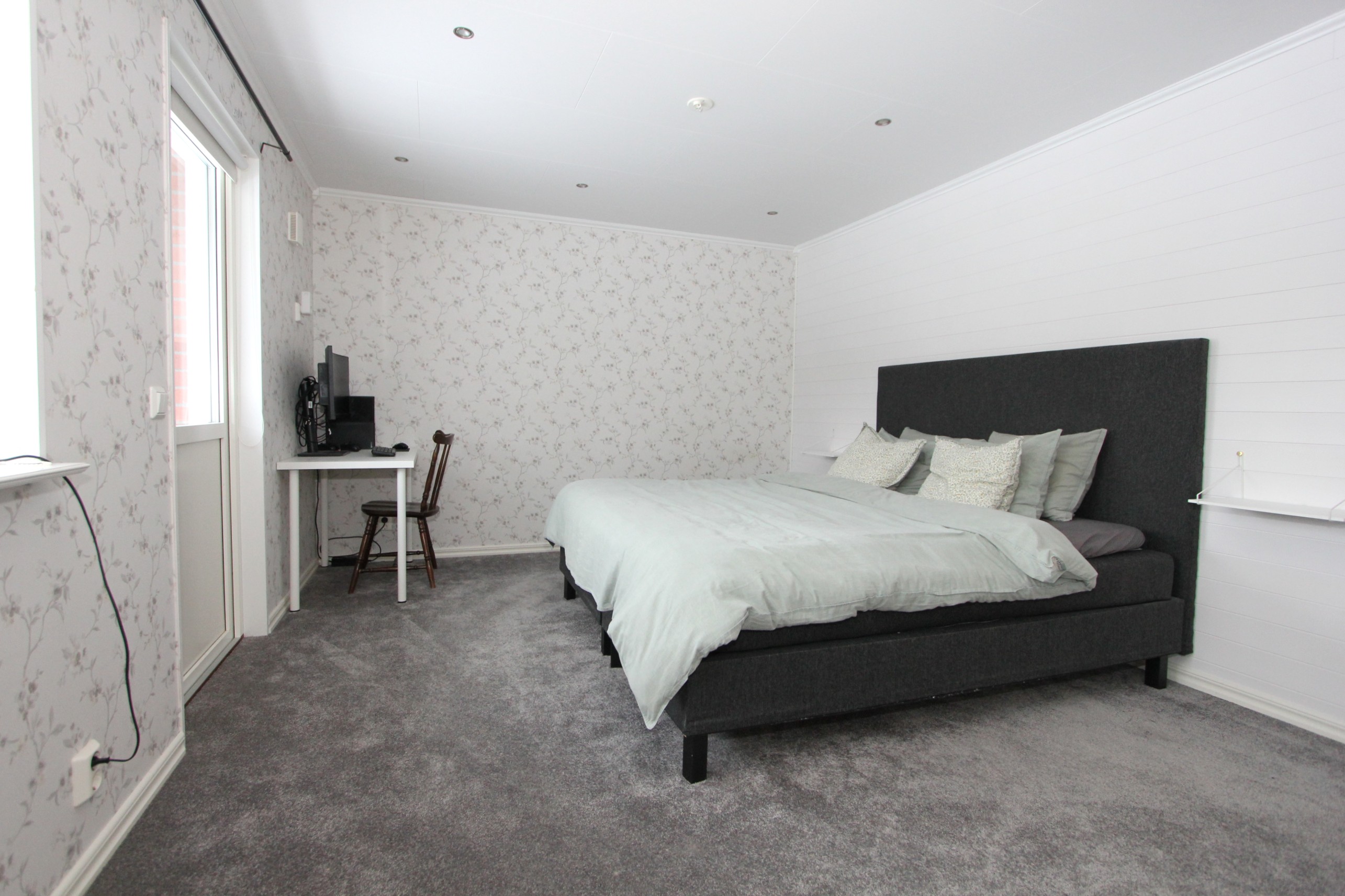Rakt fram ligger det största sovrummet; sovrum 2. Ett härligt, ljust rum med 1 fönster samt utgång till baksidans uteplats. En härlig heltäckningsmatta finner vi här. Så skönt för nakna fötter. Rymlig garderob med spegelskjutdörrar. Spotar.