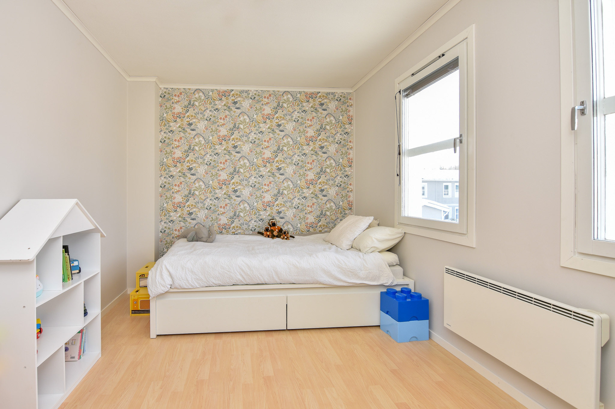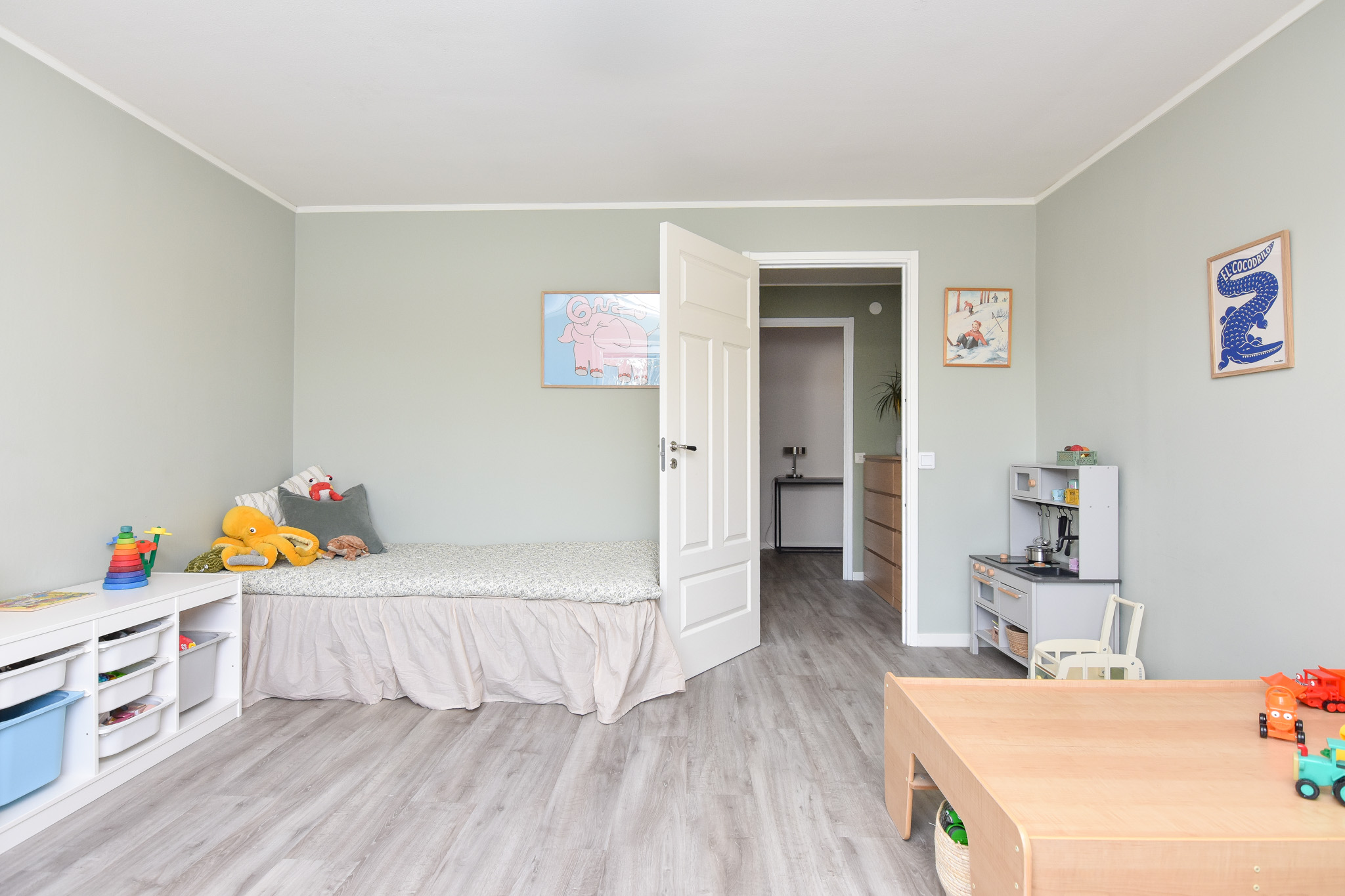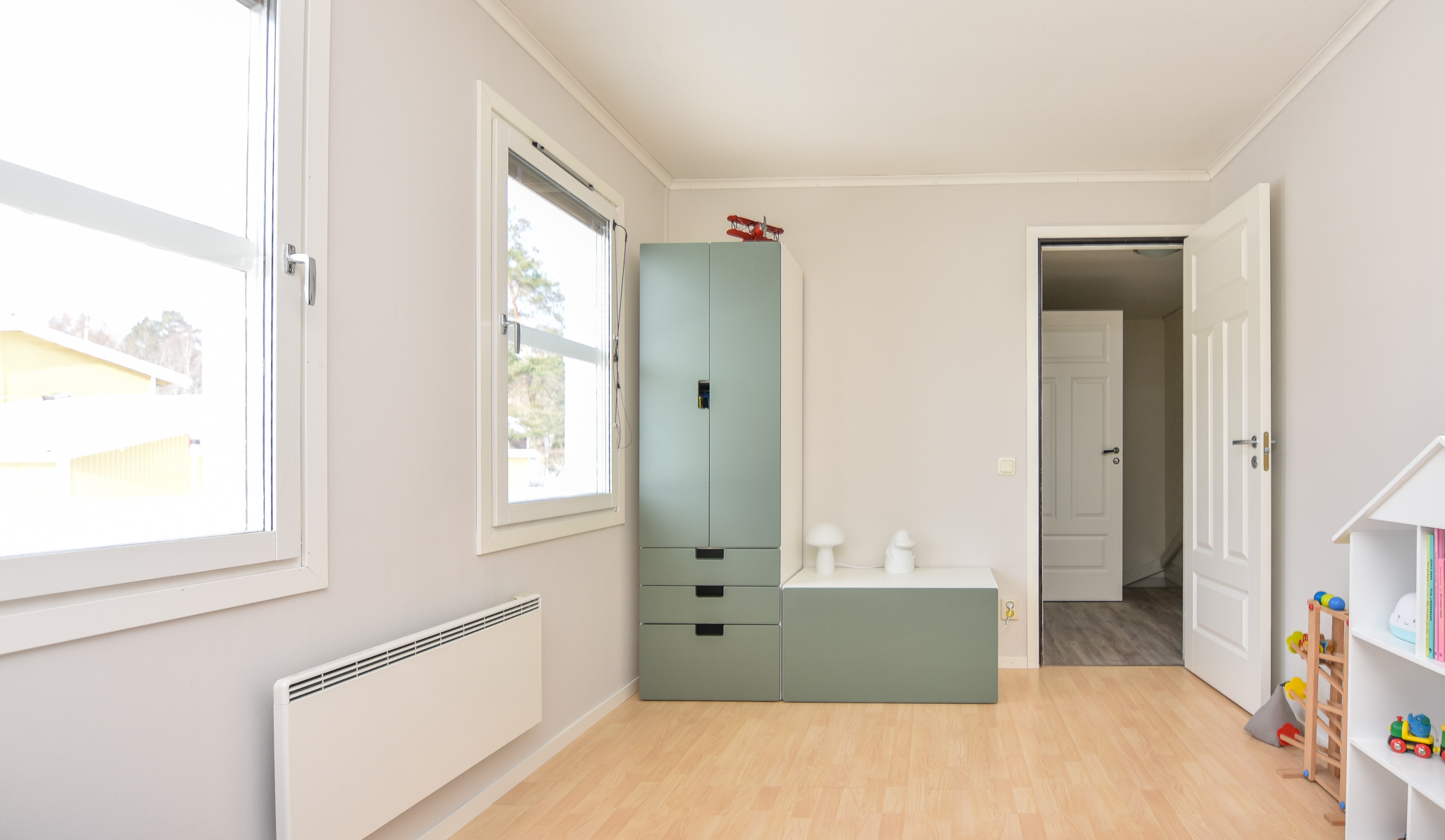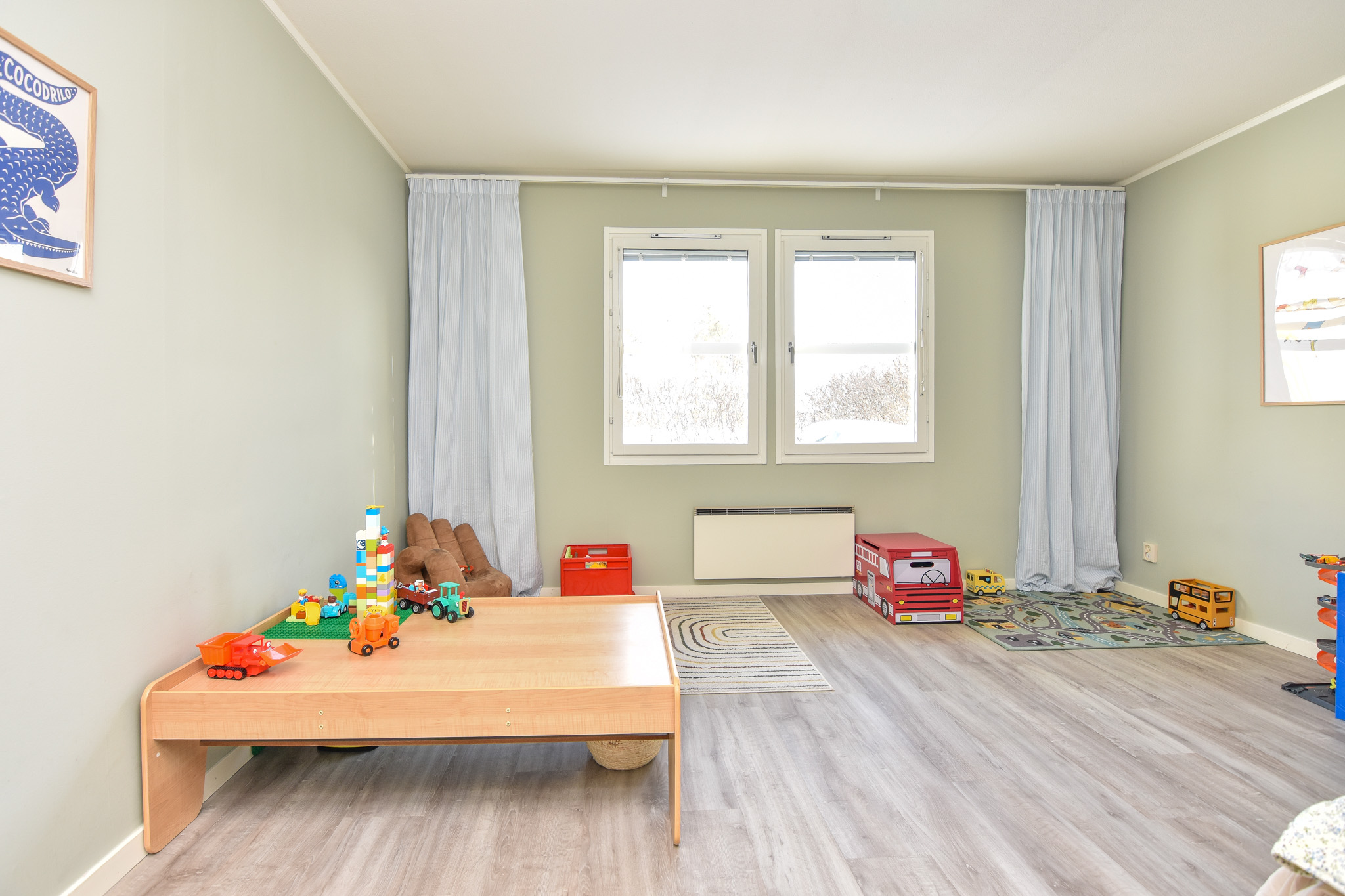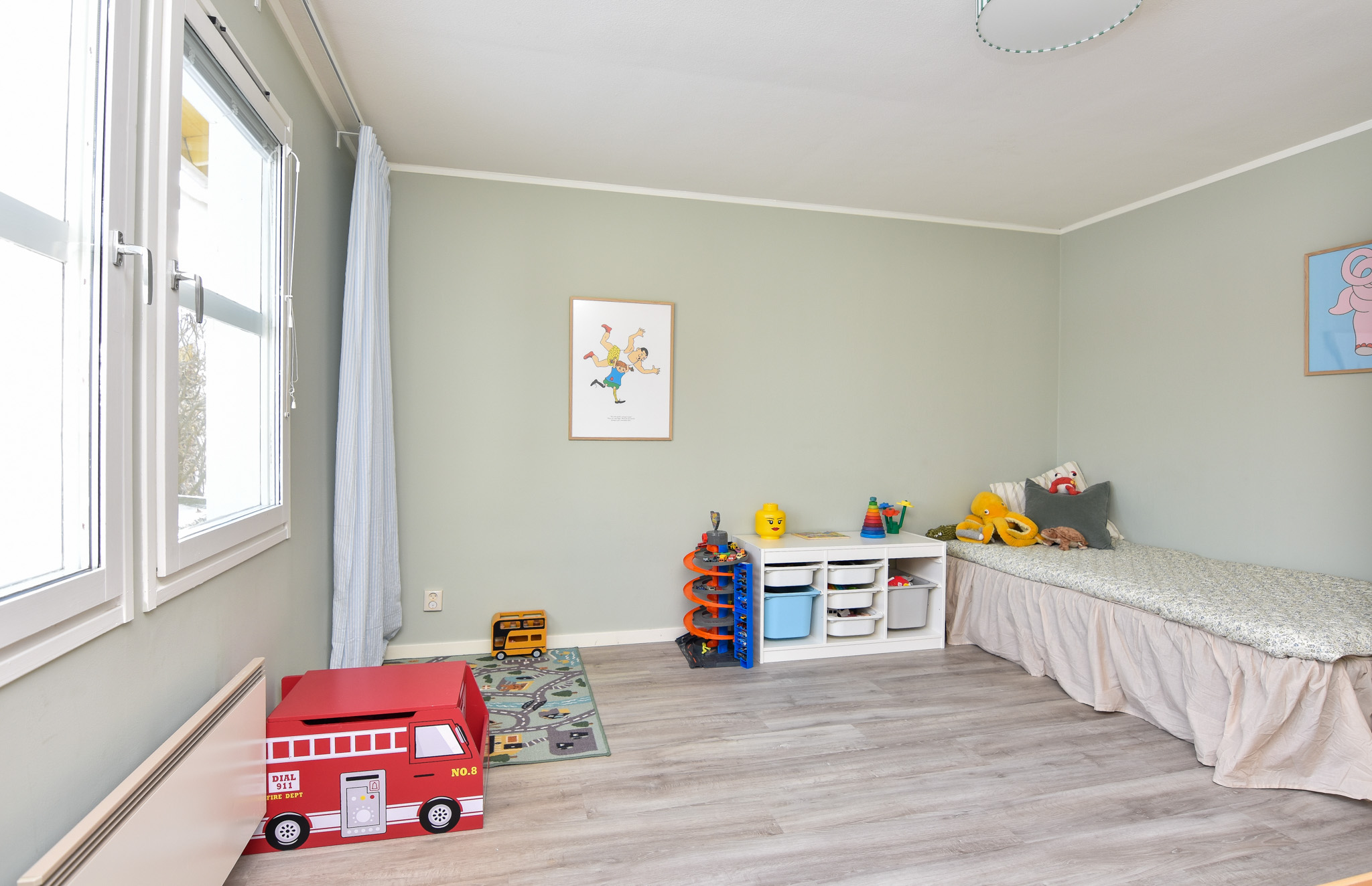 Ett större sovrum med plats för dubbelsäng. Rummet används i dagsläget som ett lekrum.