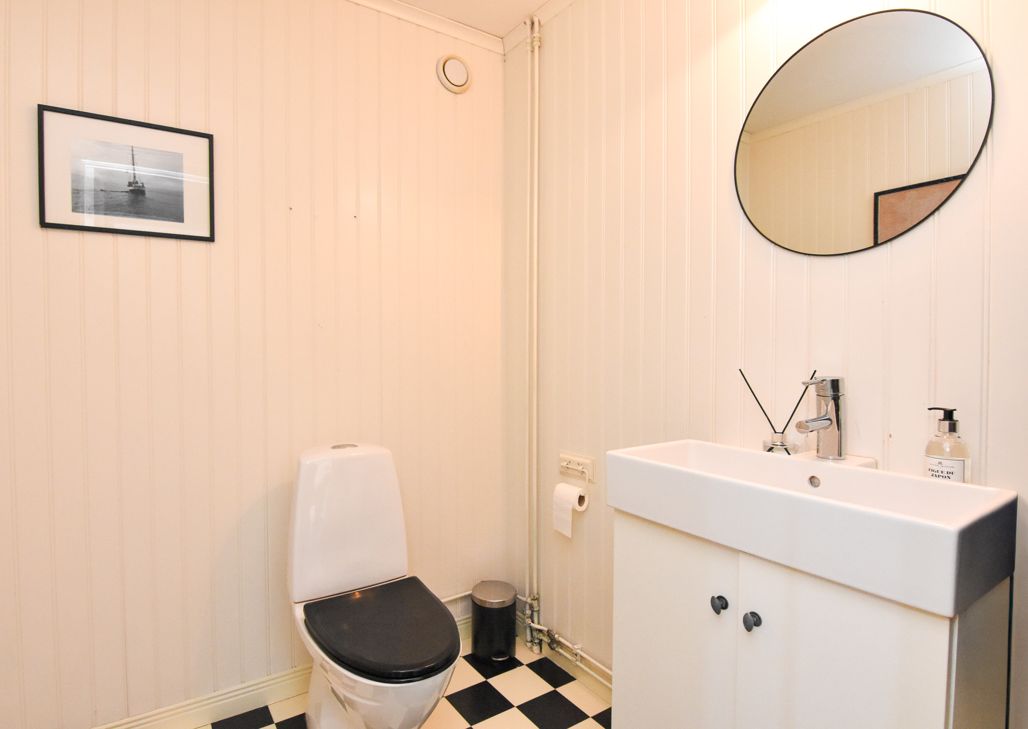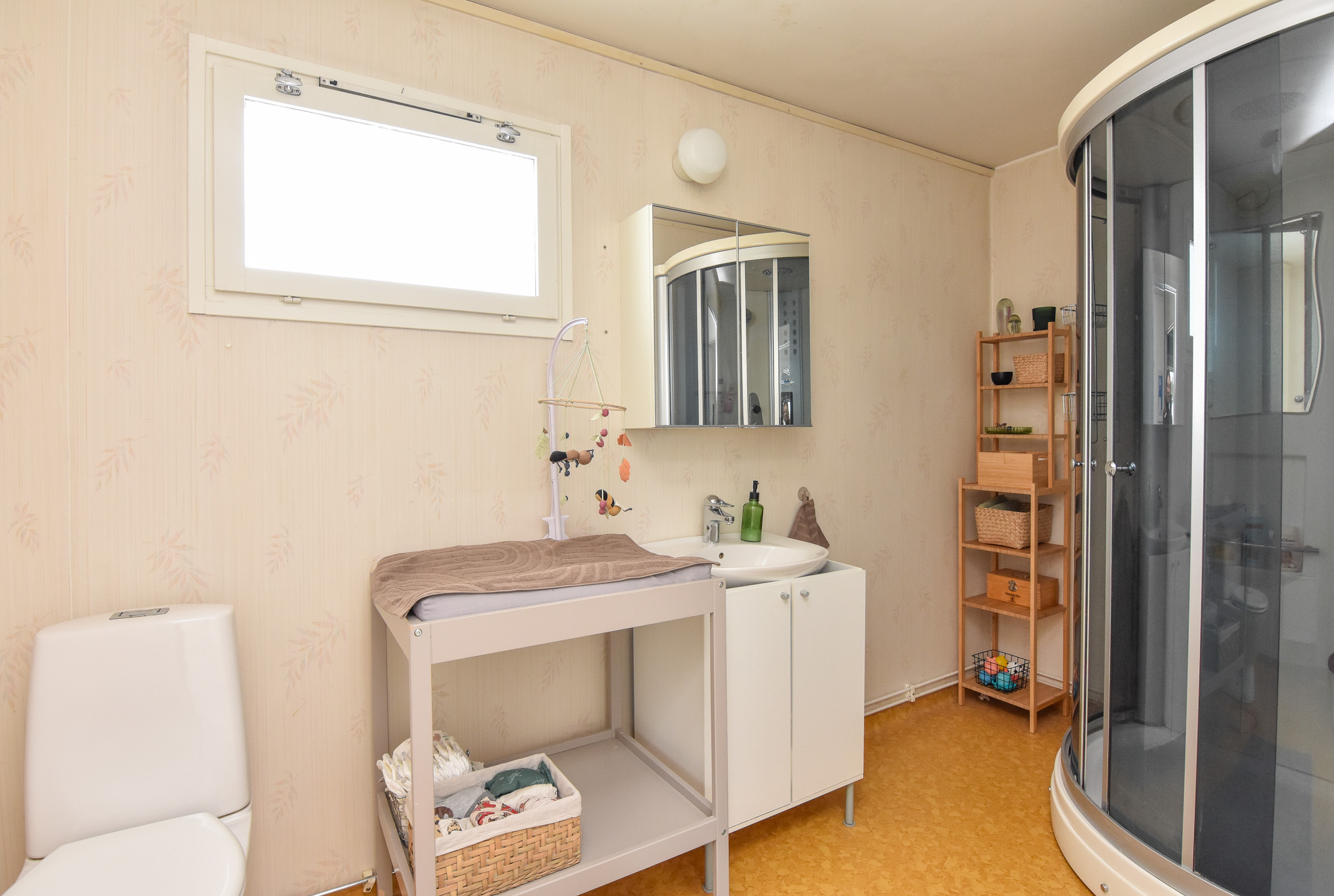 Badrum med vårtums- golv/tapet. Här finns handfat, toalett och en duschkabin.