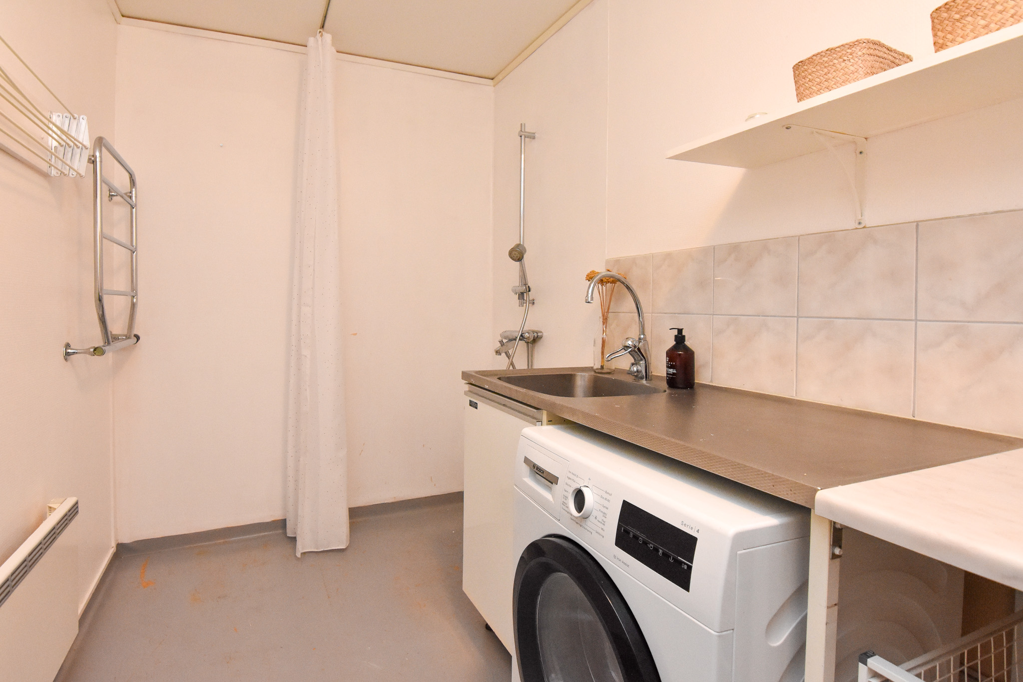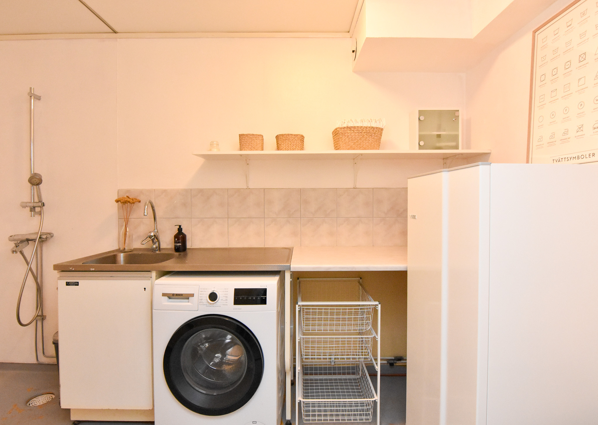 En större tvättstuga med tvättbänk, tvättmaskin samt en rymlig dusch.