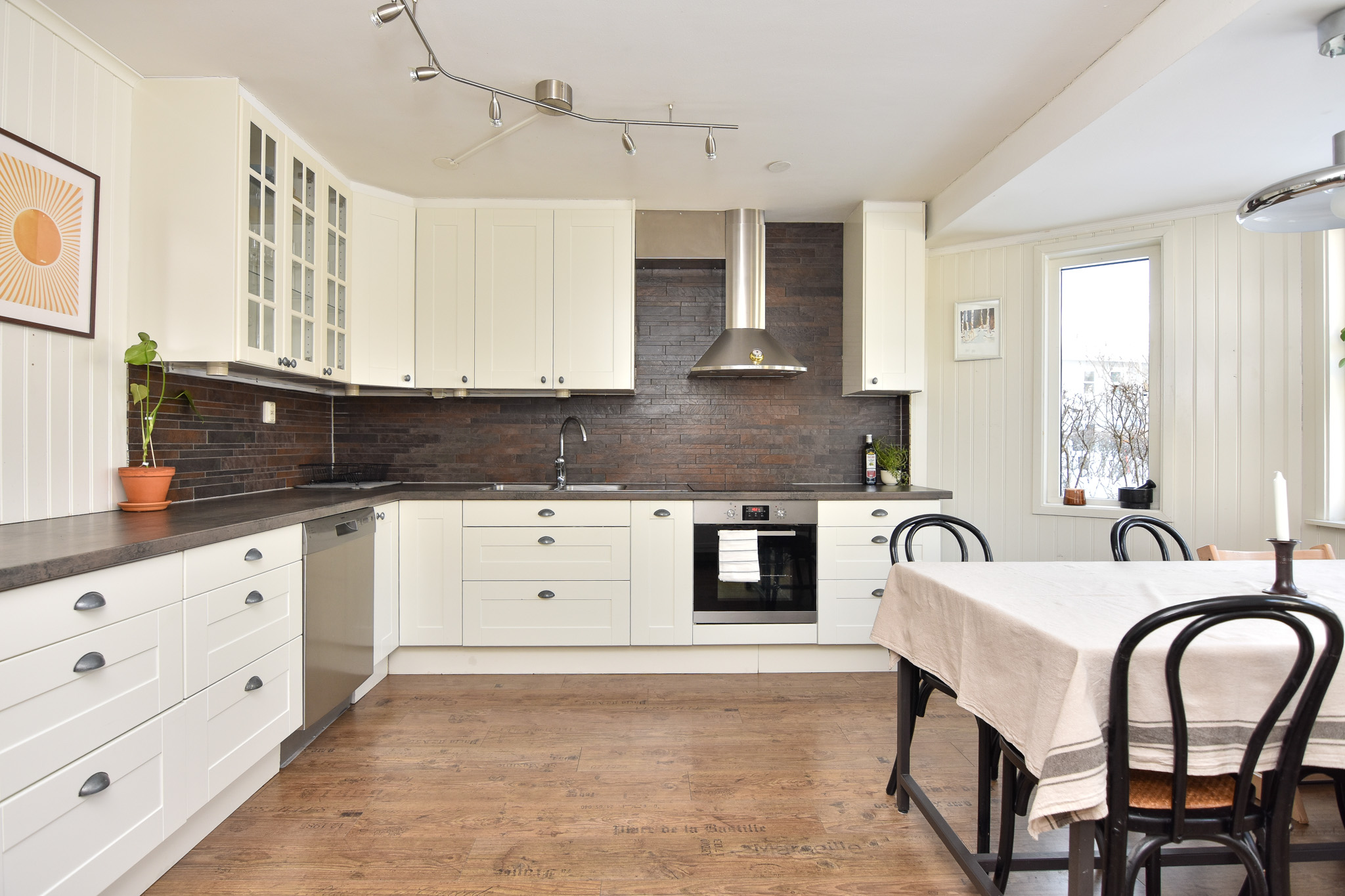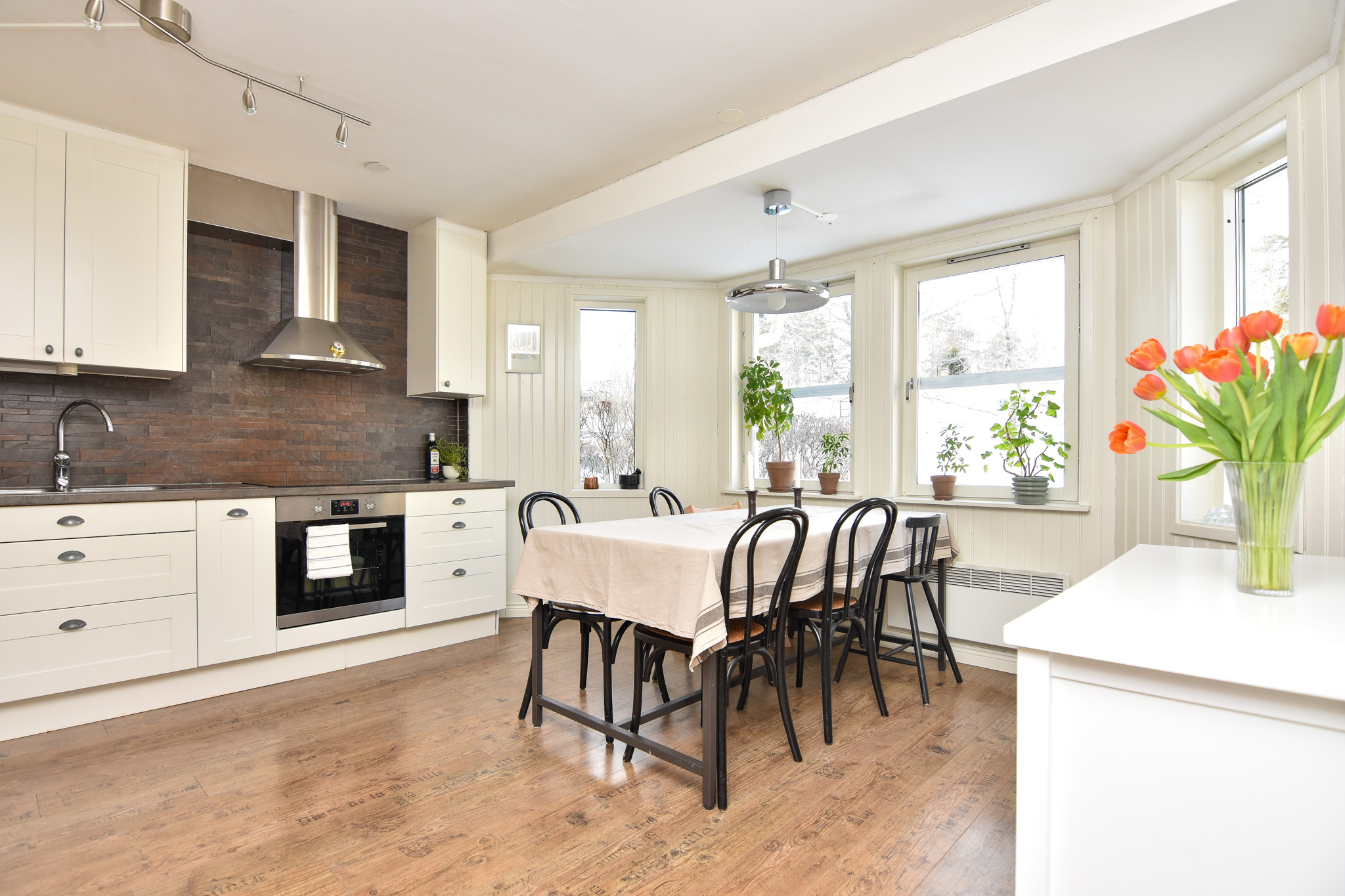 Ett ljust, trivsamt kök utbyggt med burspråk med gott om plats för en större matgupp. I köket finns hällspis, spiskåpa, varmluftsugn, diskmaskin samt kyl och frys i fullhöjd. Trivsam utsikt mot lekplats och innergård.