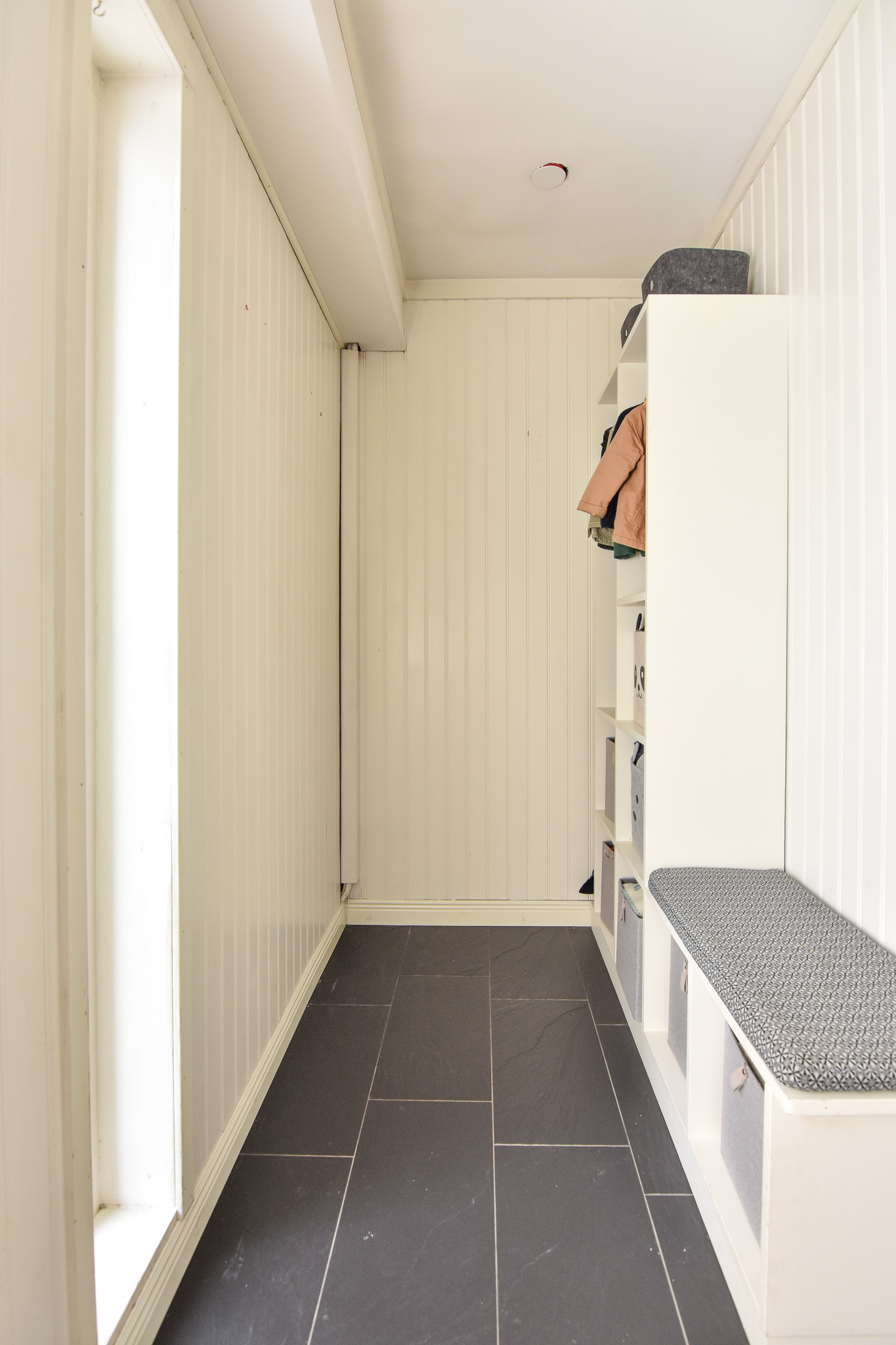 Rymlig hall med klinkergolv. Gott om plats för avhängning samt barnvagn.
