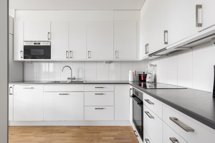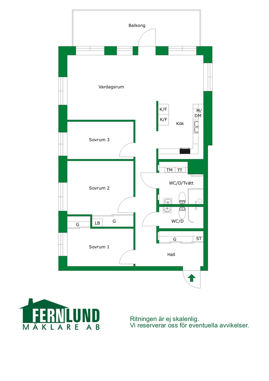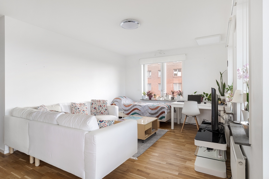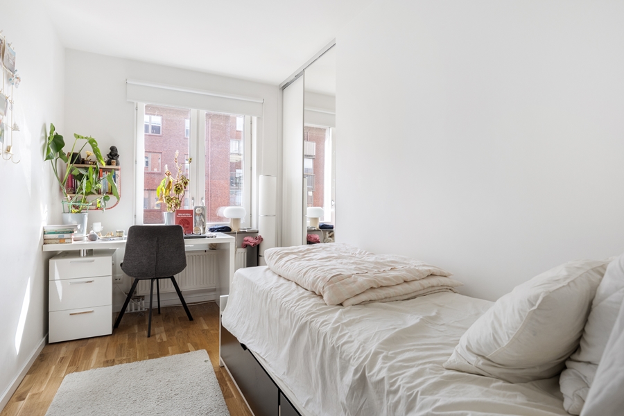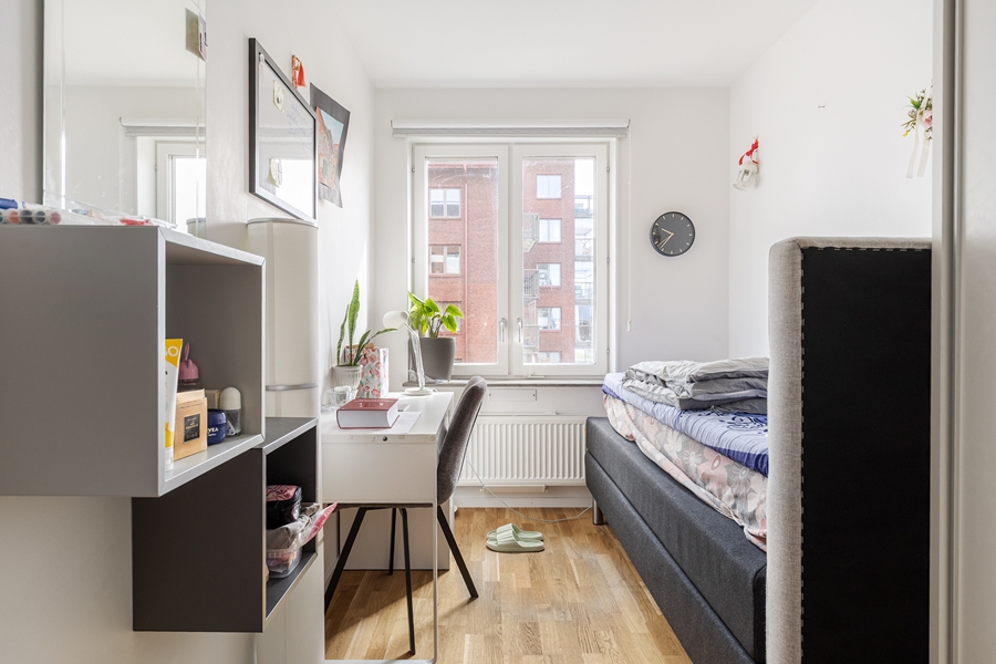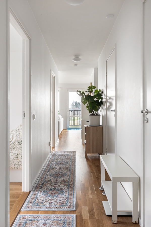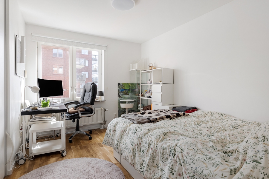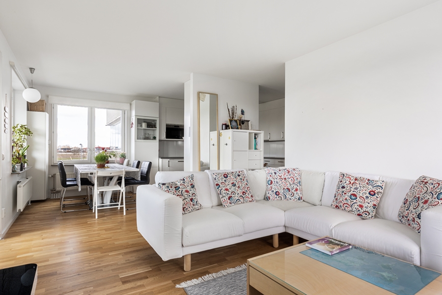 HALL med garderober. SOVRUM om 9 kvm med ekparkett. SOVRUM om 13 kvm med ekparkett. SOVRUM om 8 kvm med ekparkett. BADRUM med dusch och toalett. Klinkergolv och kaklade väggar. BADRUM med badkar sat tvättmaskin och torktumlare. Klinkergolv och kaklade väggar. Handdukstork. KÖK med vita släta luckor. Spis, fläkt, kyl, frys, diskmaskin. Öppen planlösning mot VARDAGSRUM med utgång till den generösa balkongen i väster. Fin utsikt från våning 2 av 5.