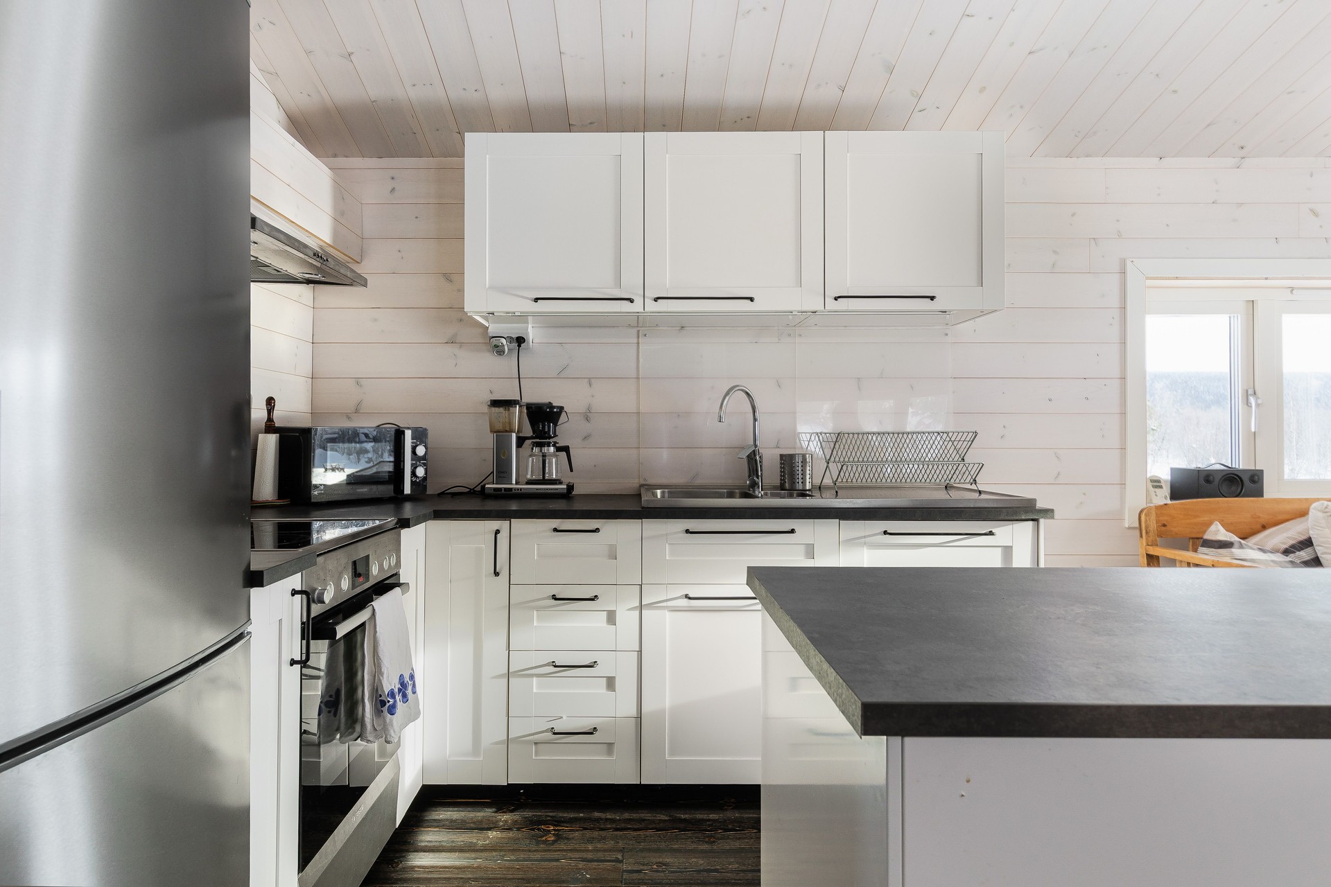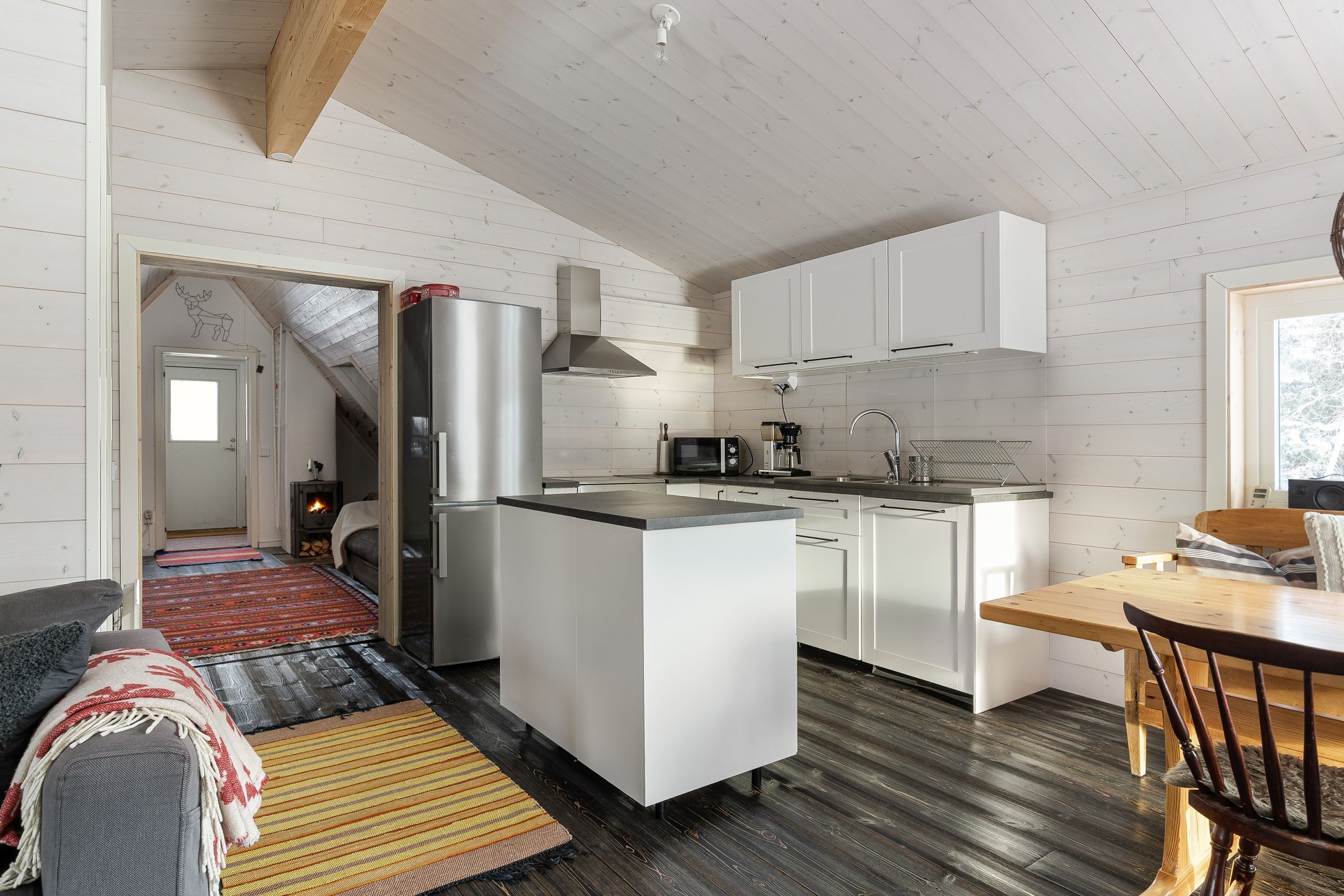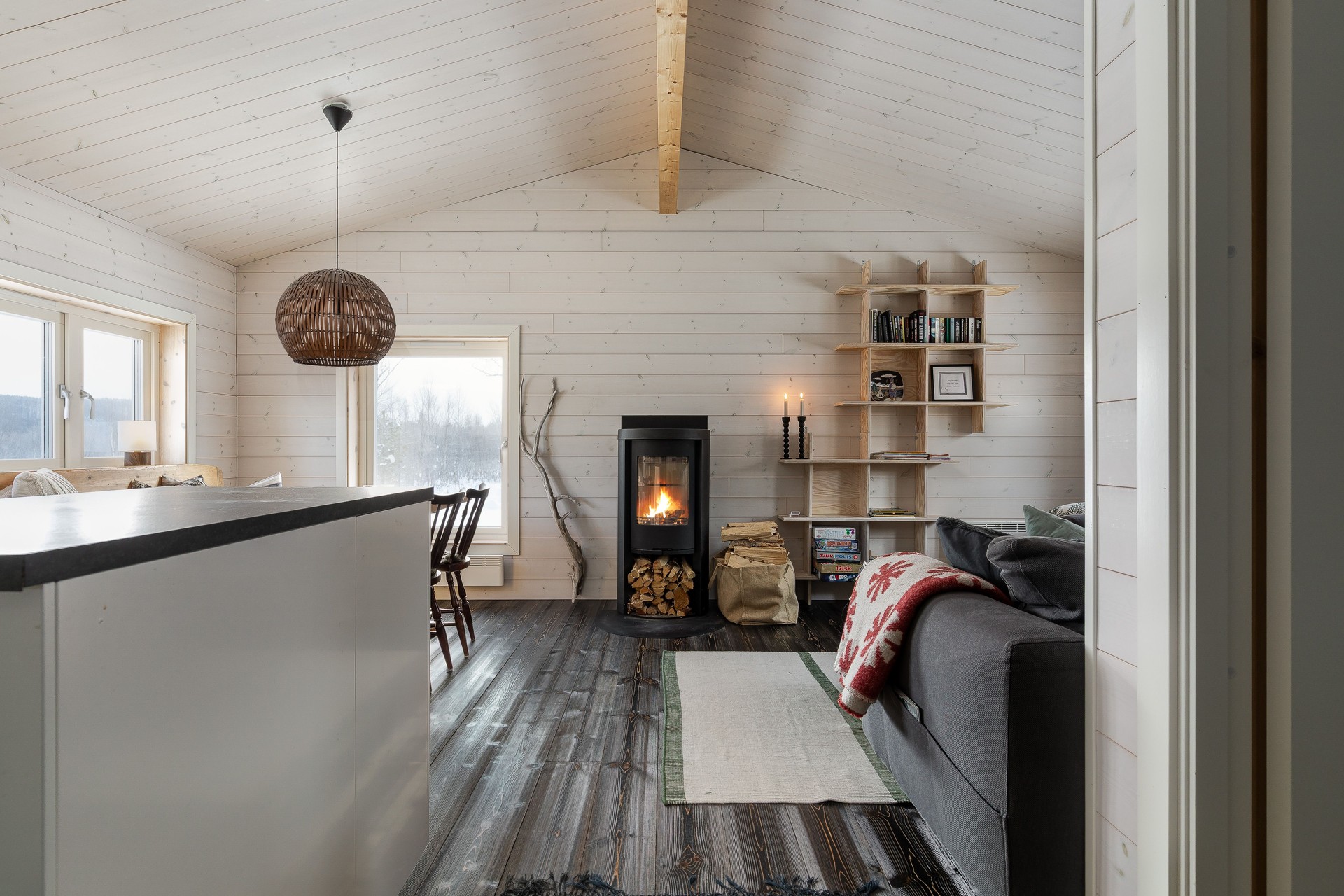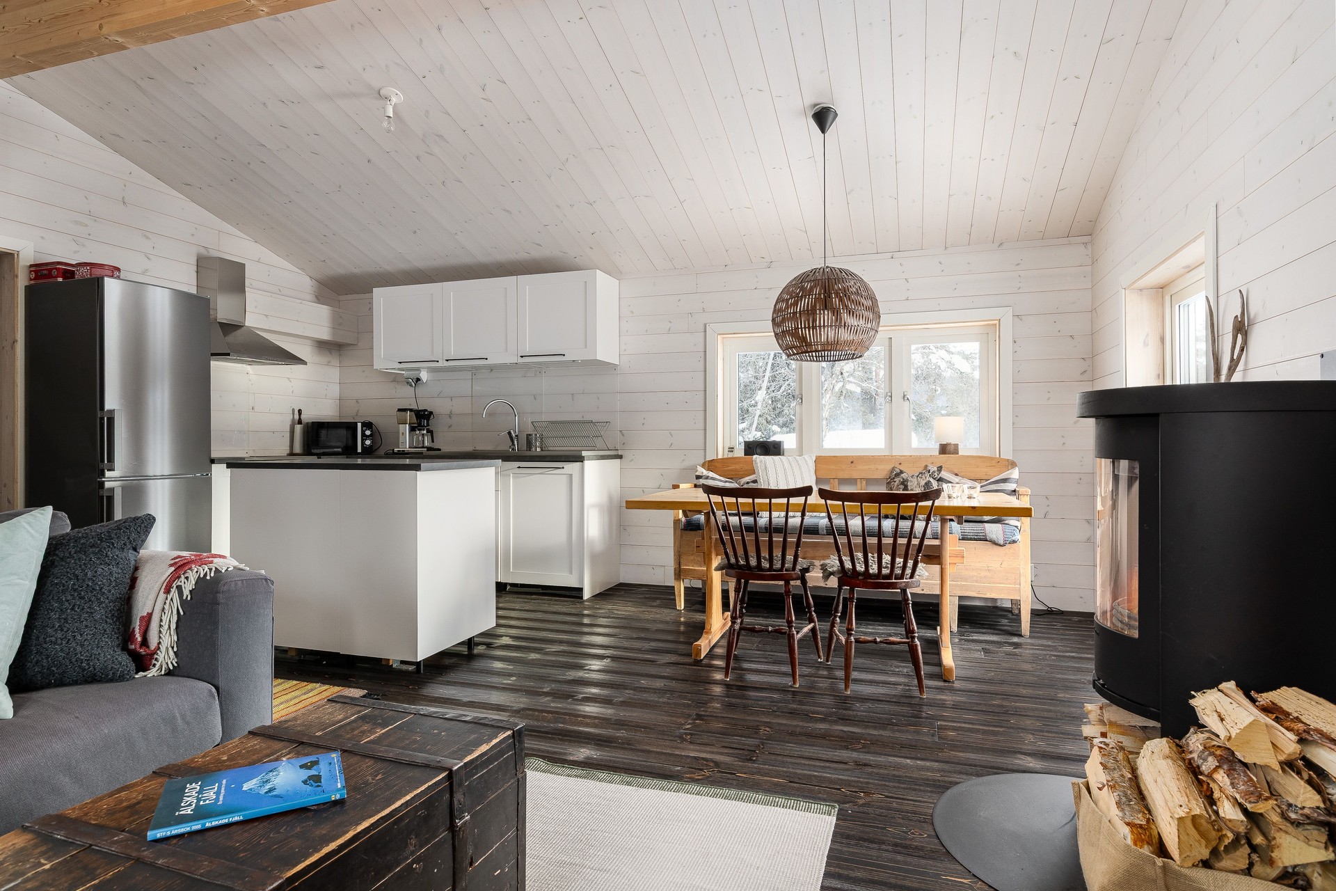 Tillbyggnaden med kök och vardagsrum är verkligen ett lyft för stugan. Här strömmar ljuset in från tre sidor av rummet och den centrerade braskaminen både värmer bra, och ger den där härliga fjällstugekänslan när mörkret omsluter på kvällarna. Brasan ser du både från matbordet, hörnsoffan och köket! Köket har bra arbetsytor med laminatskivor i vinkel och därtill köksön med bra förvaring. Här finns rostfri ho, kyl/frys, indiktionshäll, fläkt och integrerad diskmaskin. Trägolv, träpanel på väggar och i tak.