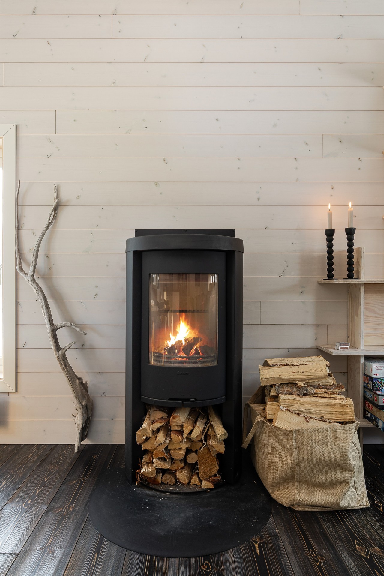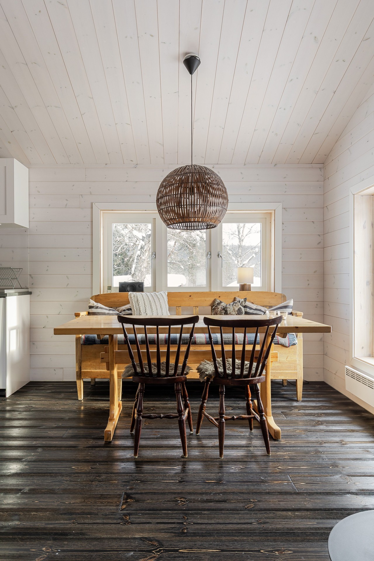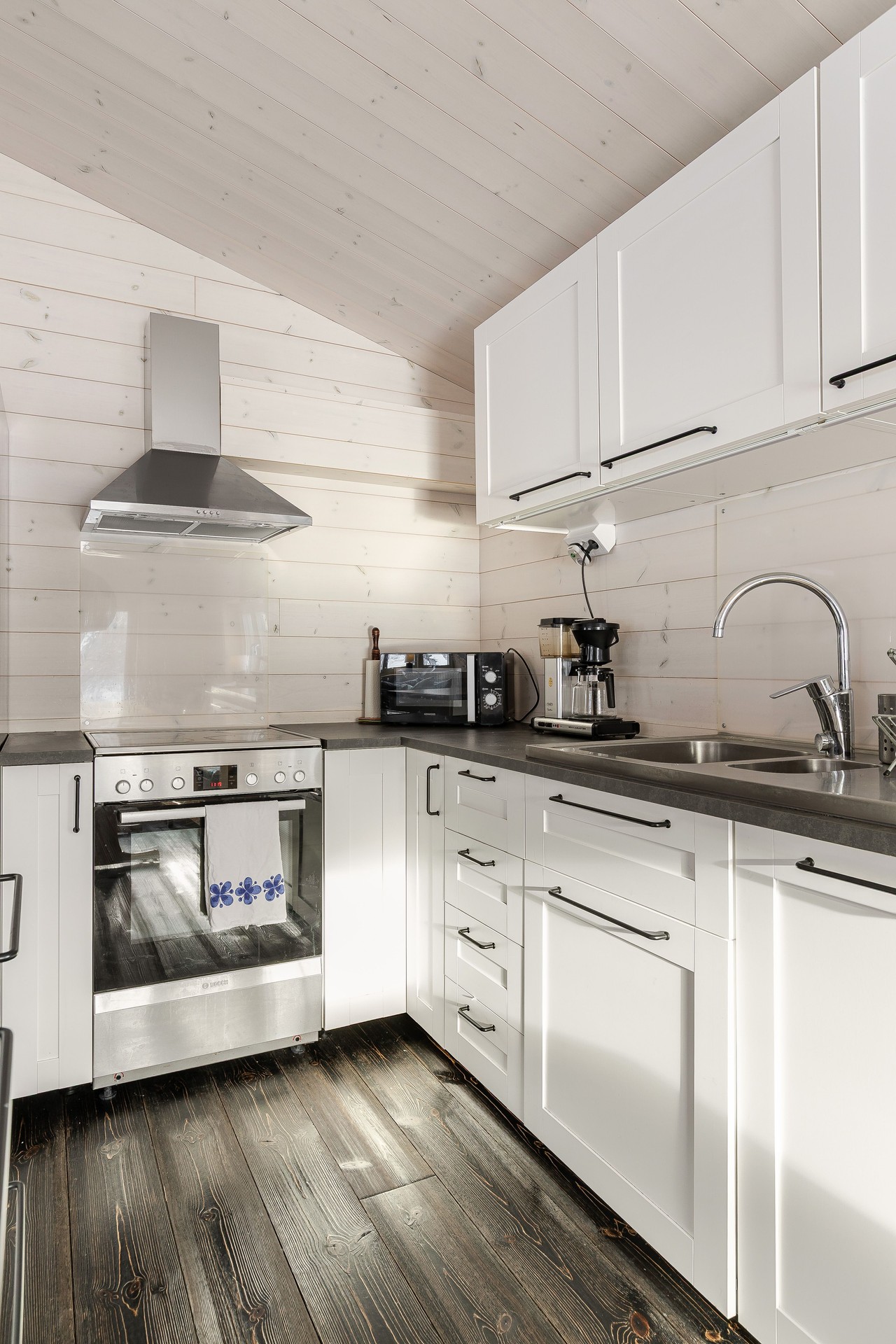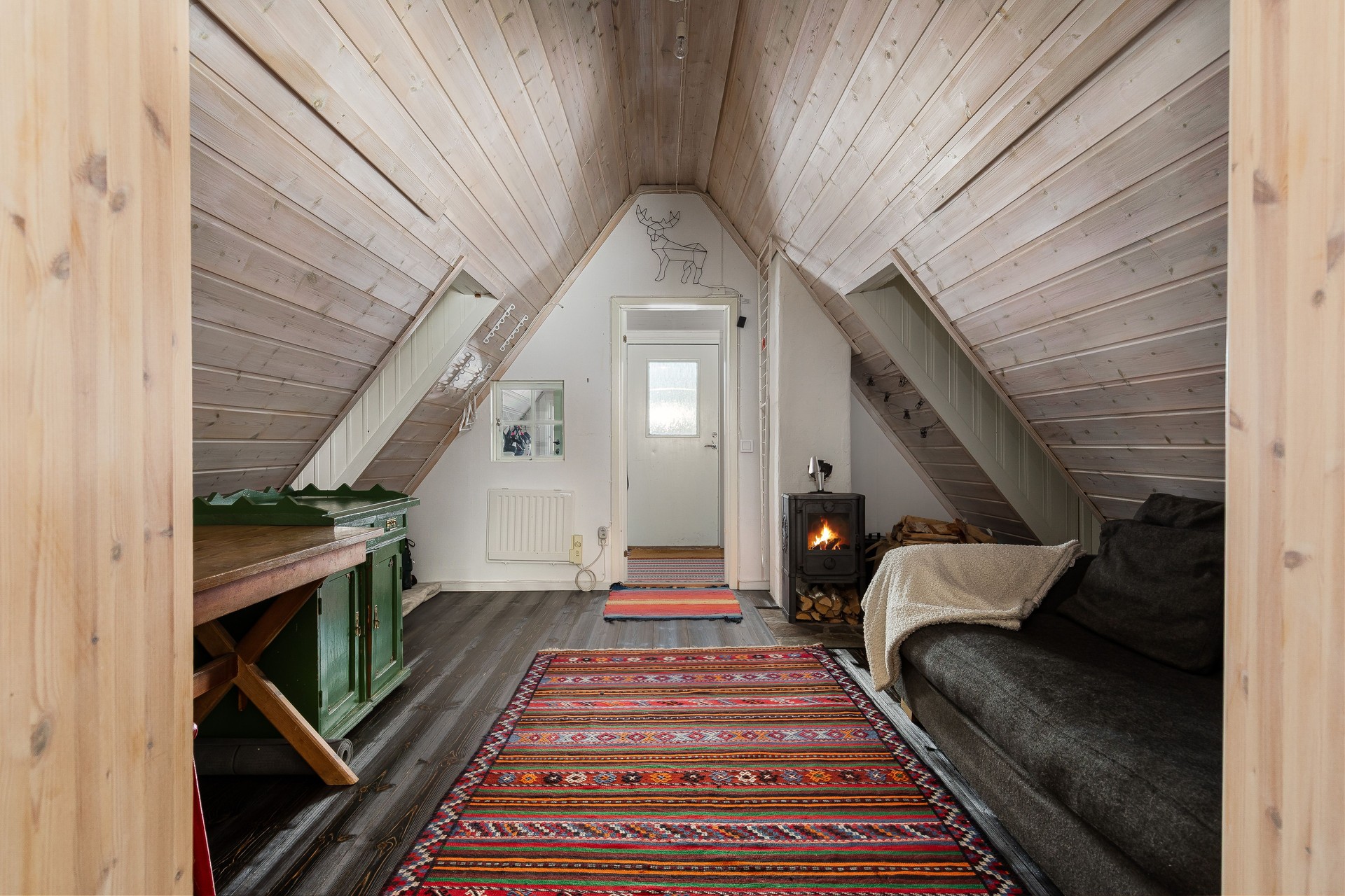 Tillbyggnaden med kök och vardagsrum är verkligen ett lyft för stugan. Här strömmar ljuset in från tre sidor av rummet och den centrerade braskaminen både värmer bra, och ger den där härliga fjällstugekänslan när mörkret omsluter på kvällarna. Brasan ser du både från matbordet, hörnsoffan och köket! Köket har bra arbetsytor med laminatskivor i vinkel och därtill köksön med bra förvaring. Här finns rostfri ho, kyl/frys, indiktionshäll, fläkt och integrerad diskmaskin. Trägolv, träpanel på väggar och i tak.
