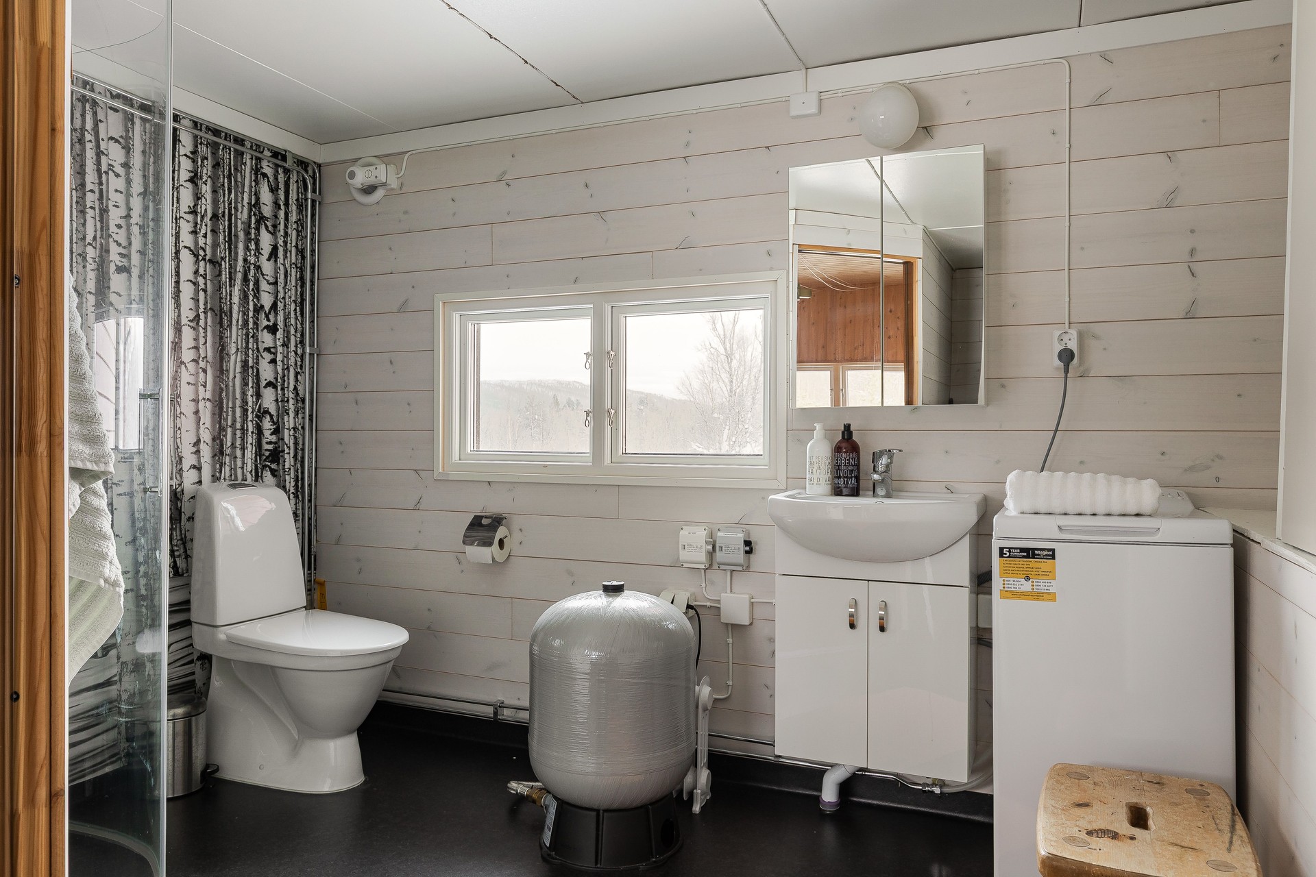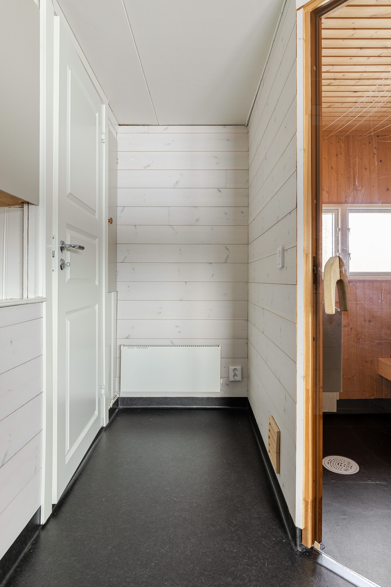 Till vänster om den större hallen finns badrum med wc, handfat och underskåp, spegelskåp samt dusch med glasväggar. Rummet gjorde 2017 om till badrum med nya ytskikt, ny bastu och nya fönster. Plastmatta på golv. Plastmatta på väggar vid dusch, annars träpanel. Målade skivor i tak. Bastun har elektriskt aggregat. Under bastulaven finns varmvattenberedare. Plastmatta på golv, träpanel på väggar och i tak.