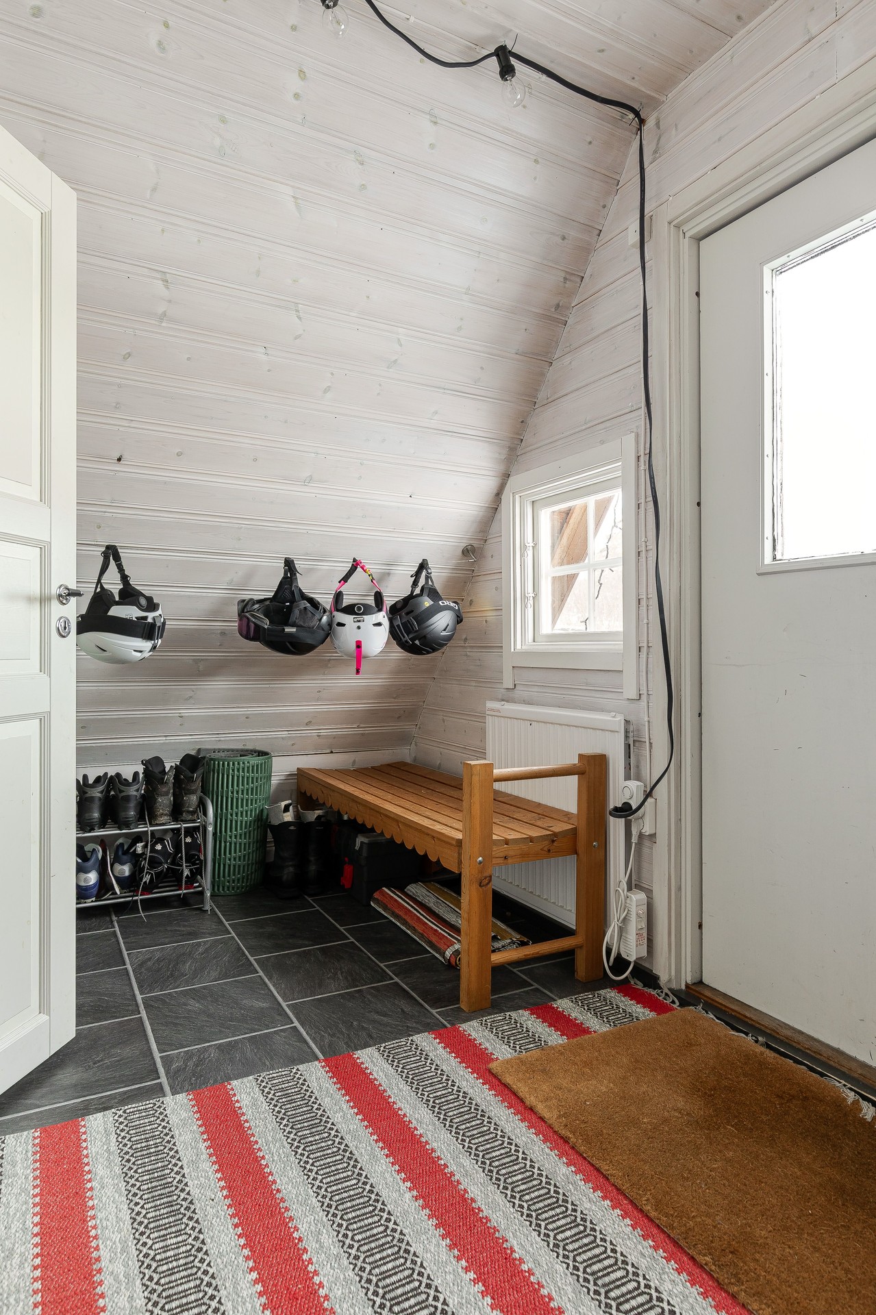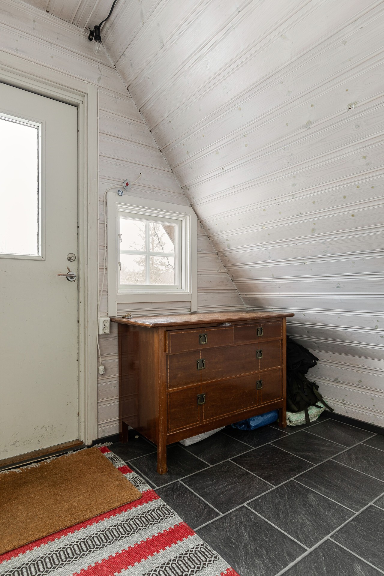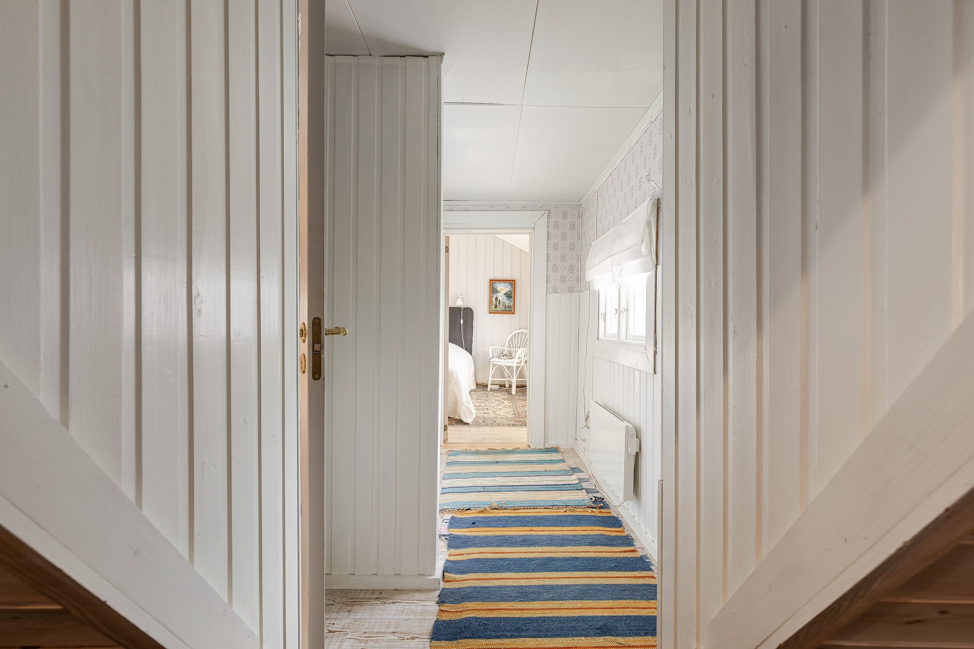 Hallrummet är praktiskt med möjlighet till förvaring på båda sidor av ytterdörren. Rummet har sluttande tak mot gavelväggarna. Laminatgolv, vitmålad träpanel och målade skivor på väggar. Träpanel i tak.