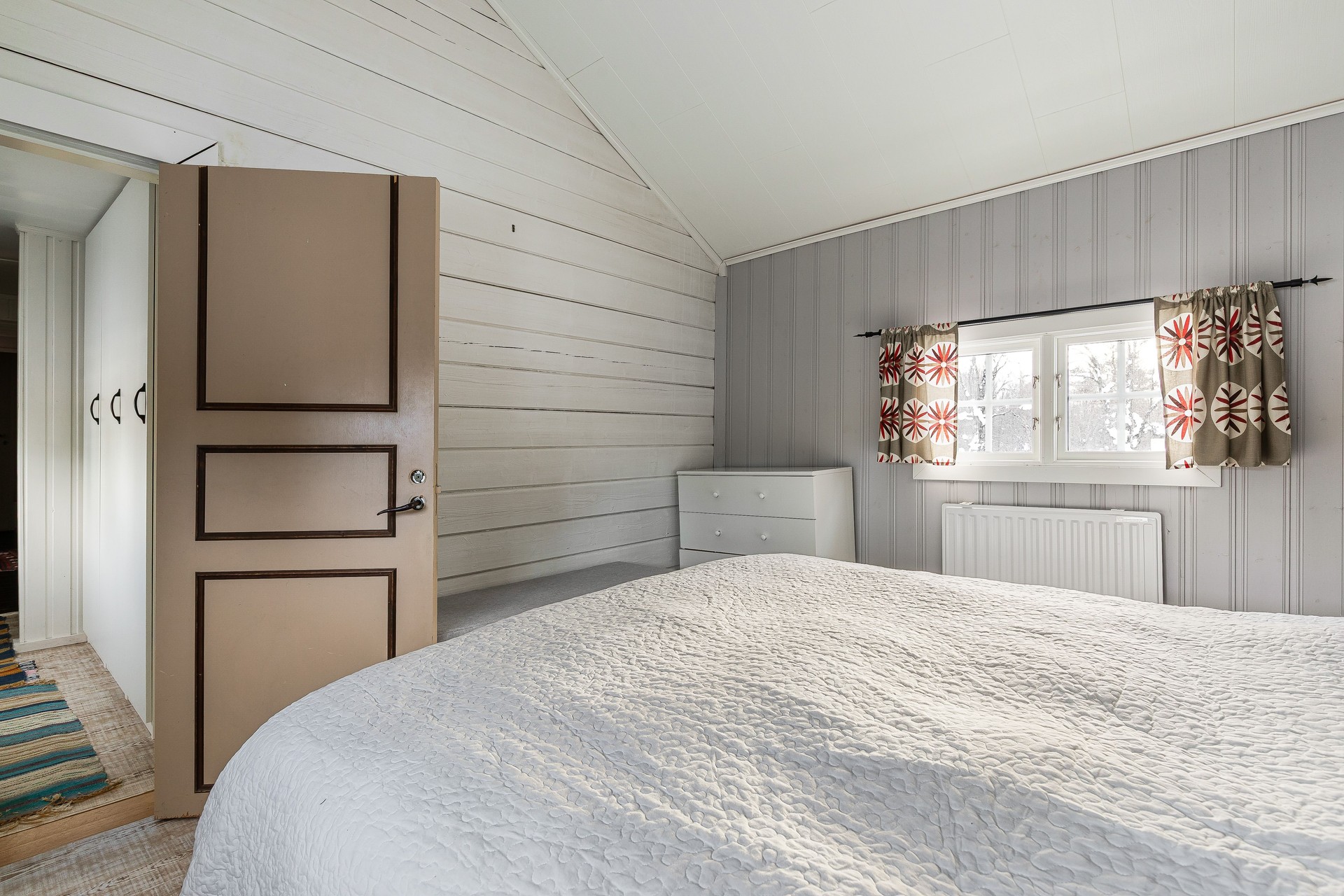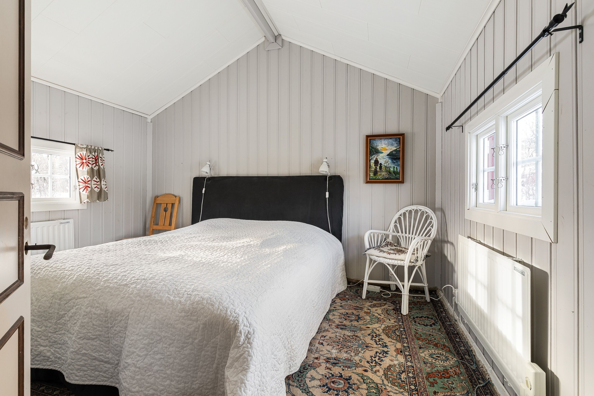 Det största sovrummet med dubbelsäng och fönster i två väderstreck. Plastmatta på golv, träpanel på väggar och i tak.