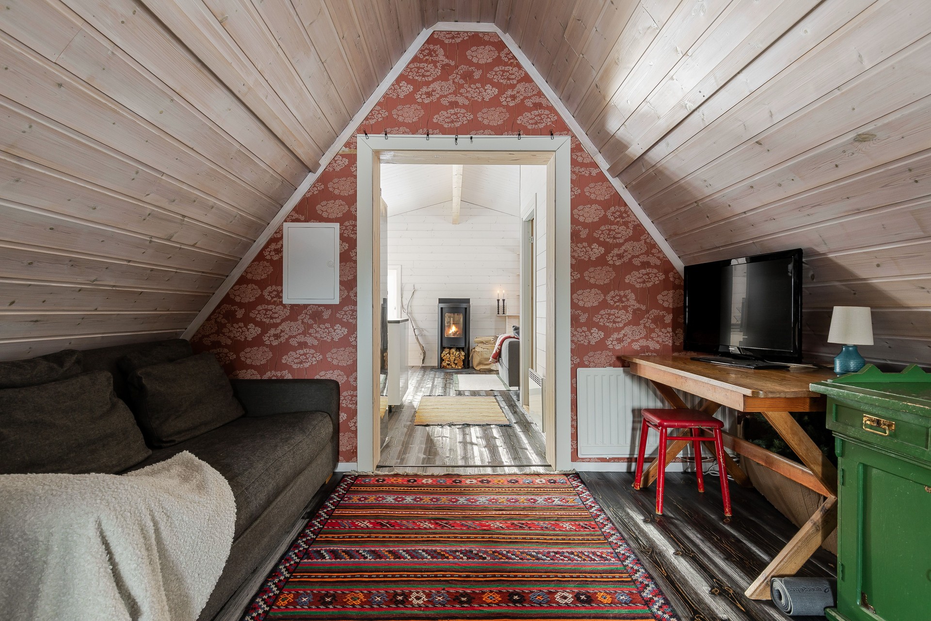 Rakt genom hallen nås, en större hall som även fungerar som passage mellan kök/vardagsrum, badrum och sovrummen. I rummet finns en vedkamin till vänster vid ingången till badrummet. Takhöjd upp till nock som sluttar brant mot långsidorna av rummet. Trägolv. Skiffer på golv under vedkamin. Tapet och träpanel på väggar samt träpanel i tak.
