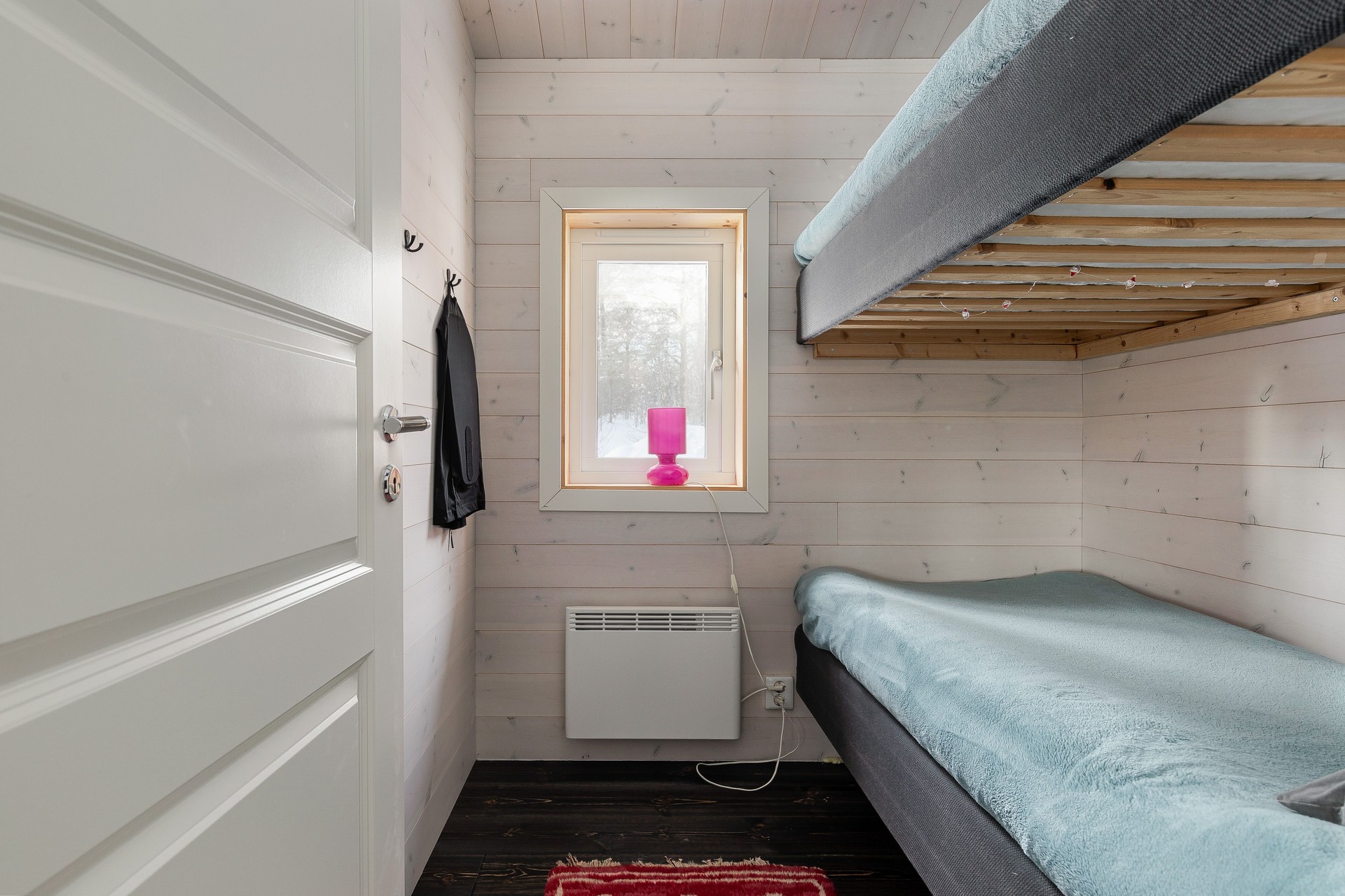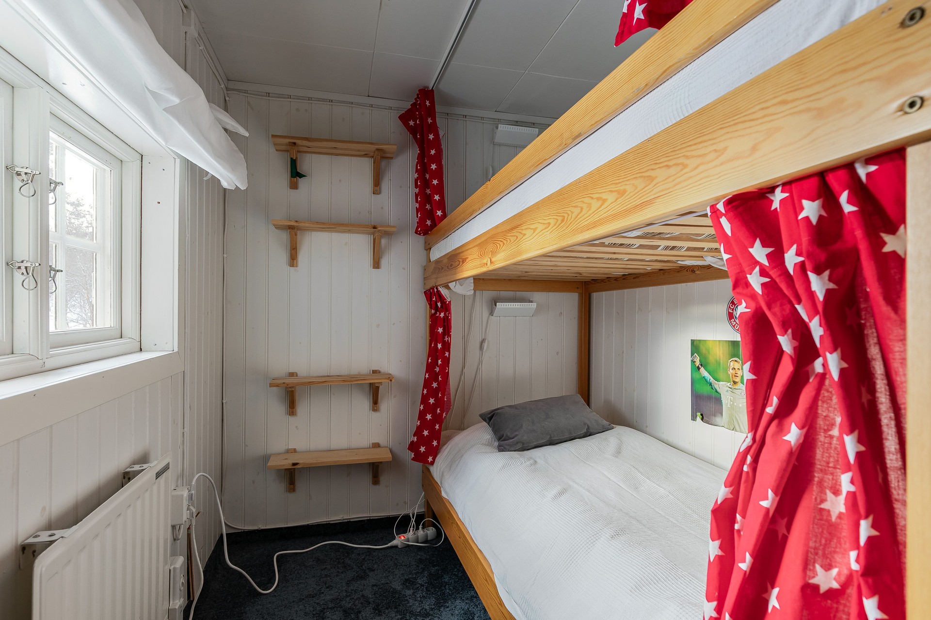 Sovrum med våningssäng och hyllförvaring. Mjuk matta på golv, träpanel på väggar och målade skivor i tak.