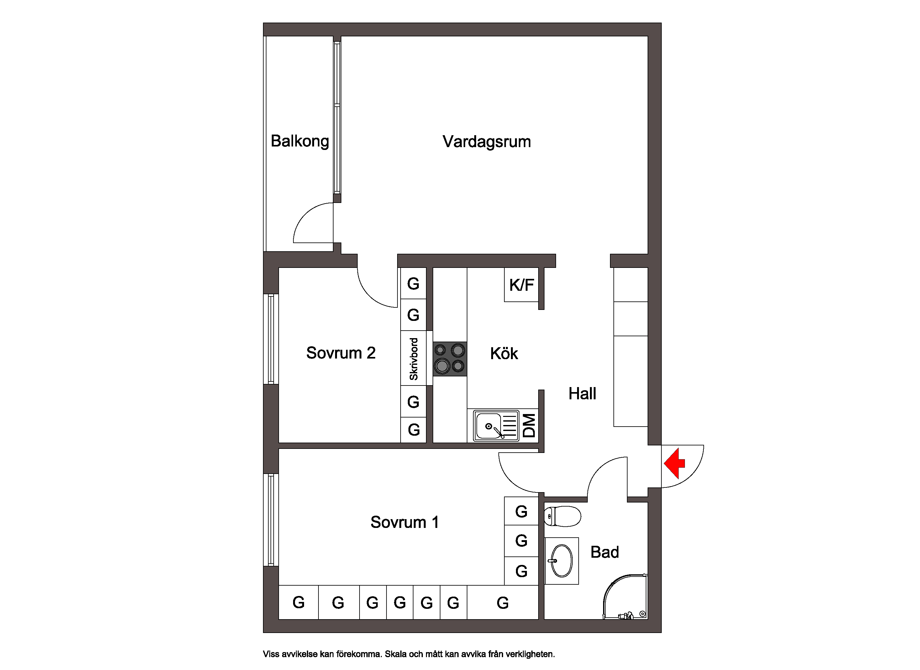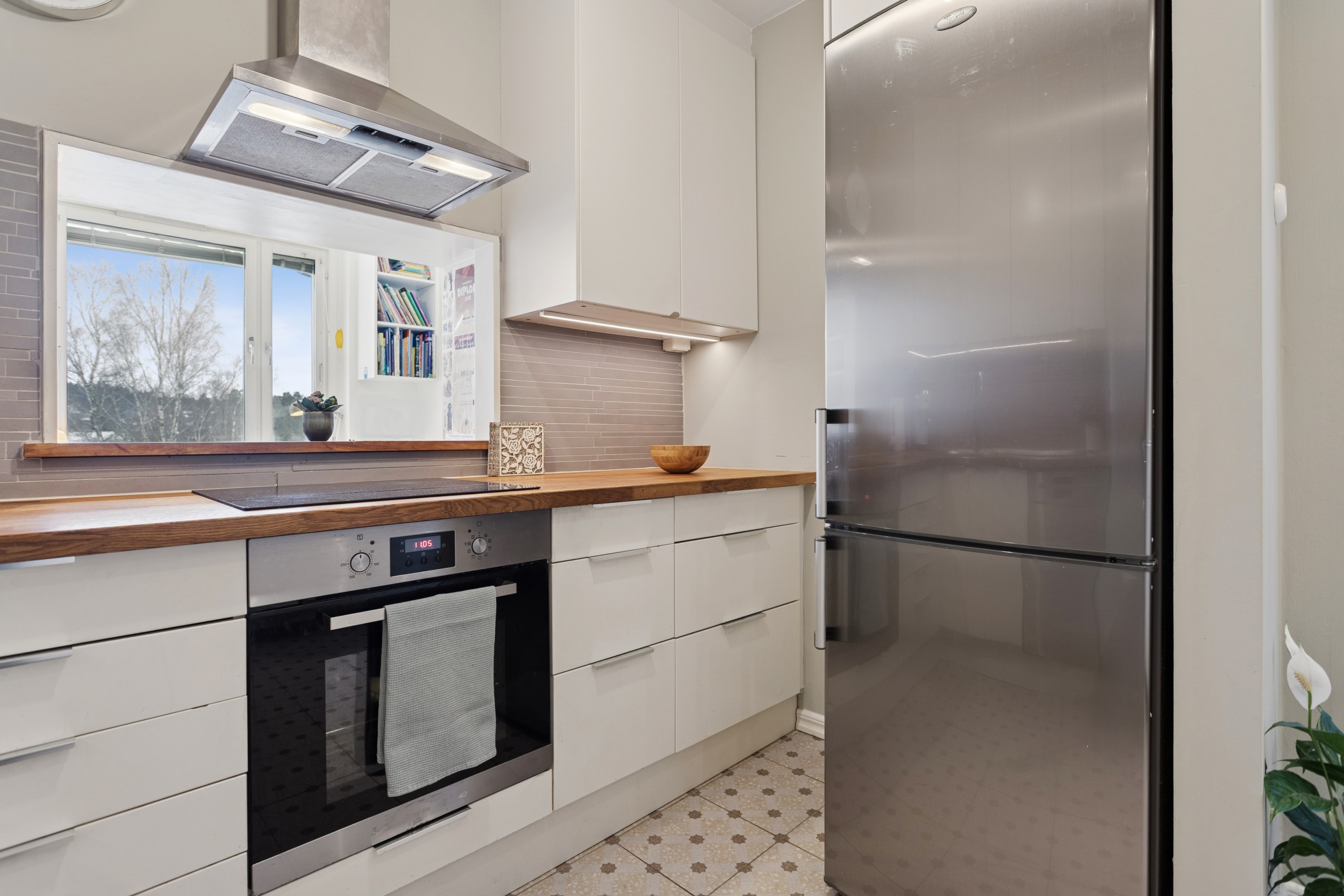 Köket gjordes om för några år sedan för att få till ett extra sovrum. Det är praktiskt utformat med arbetsytor och förvaringsmöjligheter som sträcker sig ända ut i hallen. Rostfri diskbänk med fint kakel ovan fungerar utmärkt som stänkskydd. Här finns även kombinerad kyl/frys, inbyggnadsugn, glaskeramikhäll samt spisfläkt. Öppet ut mot sovrum 2 för att få in ljusinsläpp i köket. Genomskinlig skiva finns om man vill sätta in en sådan mellan kök och sovrum 2. Precis utanför köket i hallen finns det platsbyggda skåp. Dessa kan nyttjas till extra förvaring/skafferi om man så önskar. Möjlighet finns även att sätta in fullstor frys och fullstor kyl i halldelen precis vid köket och sätta in ett skafferi där kombinerad kyl/frys står idag. Så möjligheter finns att justera vissa delar i köket så önskar.