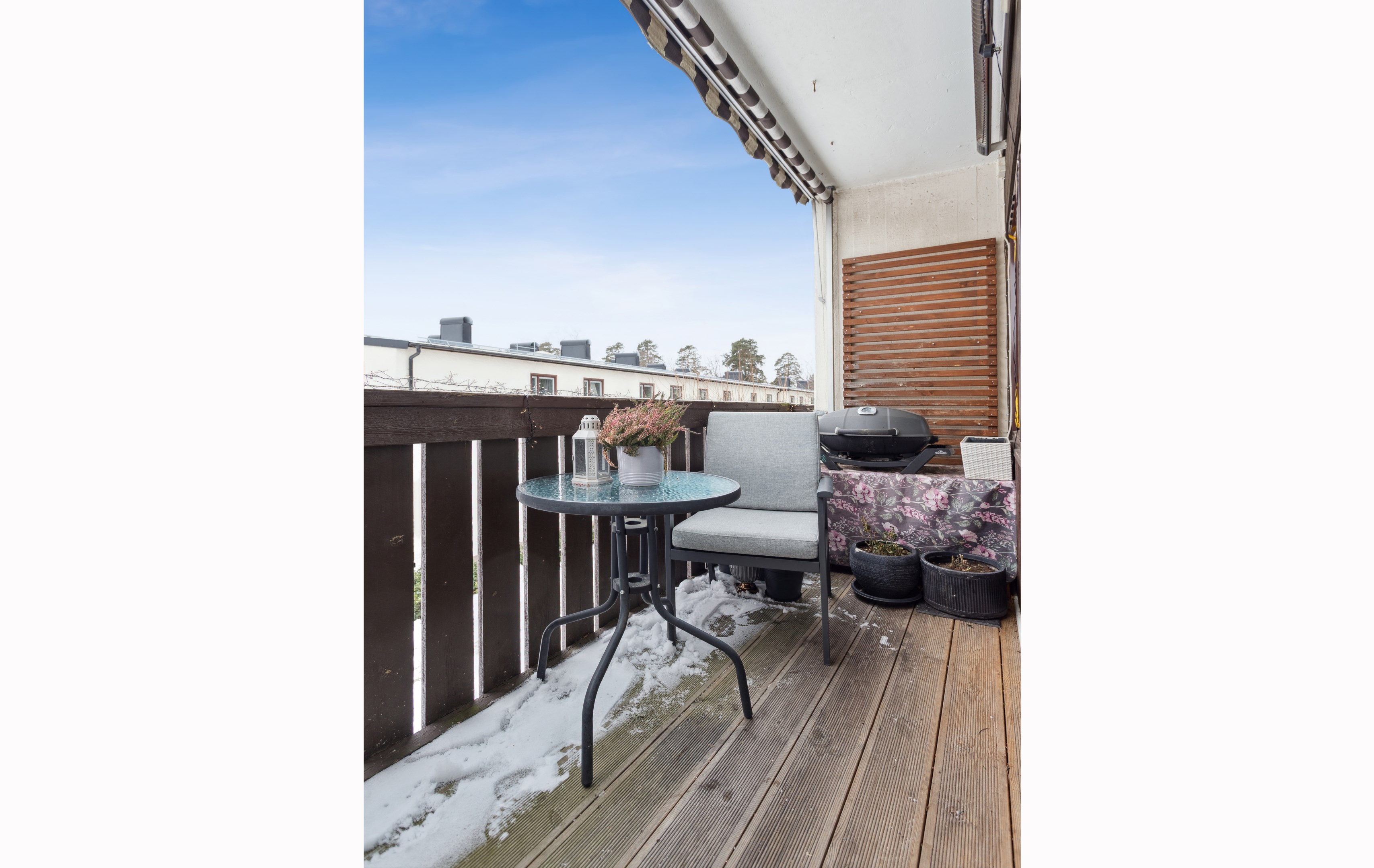 Mysig balkong i soligt söderläge med trätrall samt utsikt mot Segersjön. Bra med plats för caféset eller andra utemöbler. Utfällbar markis finns om solen skulle ligga på för mycket.