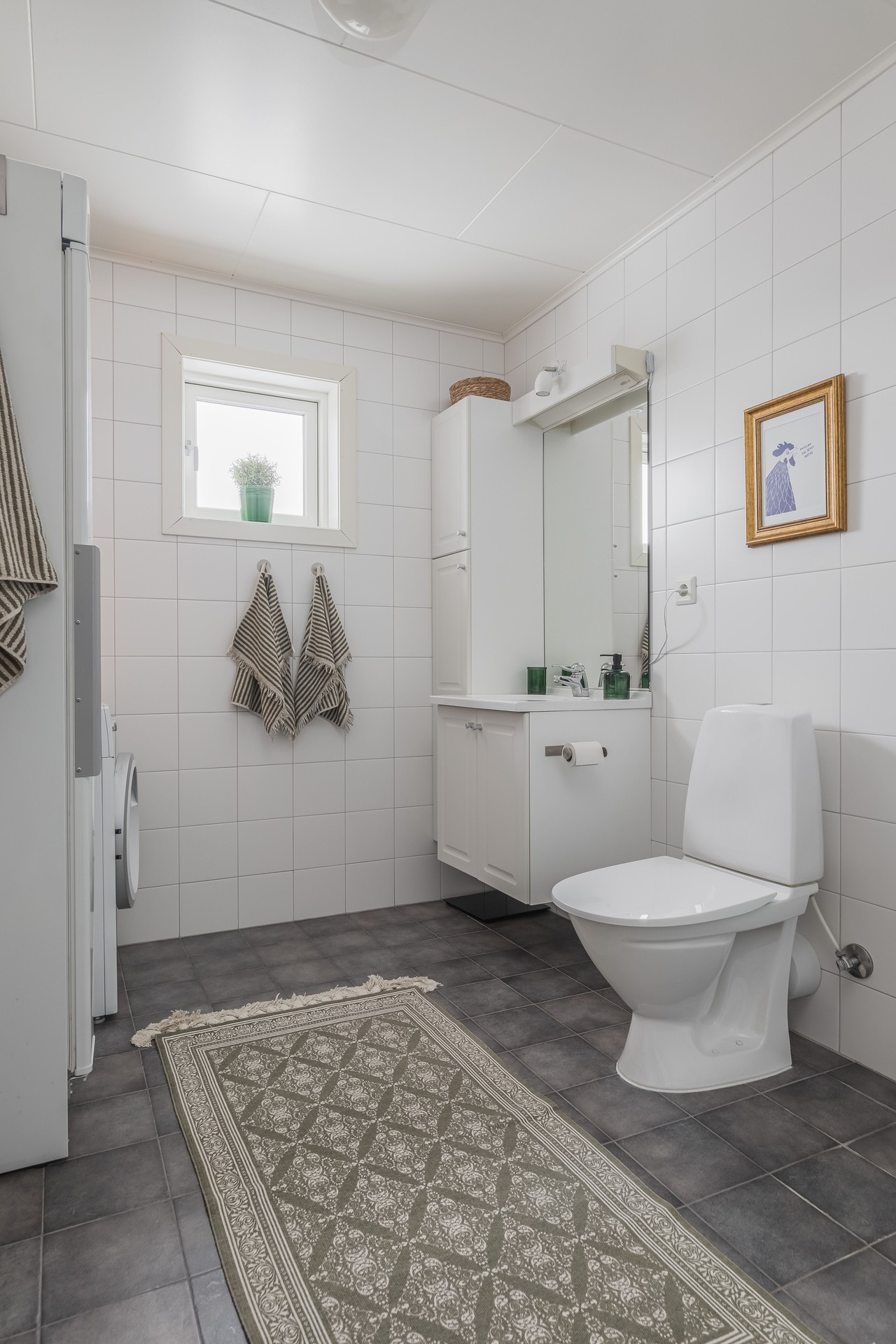 Entrén, en trappa upp i det gemensamma trapphuset leder till hallen med avhängningsdel direkt till höger innanför ytterdörren följt av två garderober. Till vänster i lägenheten ligger badrummet och två av sovrummen. Badrummet med dusch och vikbara glasdörrar, tvättmaskin, wc, handfat och torkskåp har ingång i halldelen och är rymligt med helkaklade väggar och klinker på golv. Den ljusa allrumsdelen med fönster i två väderstreck nås rakt fram från hallen med köket i vinkel till höger. Lägenheten är i grundutförande en 3:a med två sovrum. 2010 gjorde ägaren ett extra sovrum, eller walk in closet utav en del av vardagsrummet. På långsidan av rummet finns plats för matbord vid fönstret mitt emot köksdelen och utgången till den rymliga balkongen. Från kök, allrum och balkong ser du Anåfjällen som en vacker tavla genom fönstren, vid klart väder. Köksdelen är väldimensionerad för lägenhetens storlek med gott om skåpförvaring, och arbetsbänkar. Den maskinella köksutrustningen består av spis med glashäll och ugn, köksfläkt integrerad med ventilationssystemet i huset, kyl/frys och diskmaskin. Ytskikten består av klinkergolv i hall och badrum. Ekparkett i sovrum samt kök/vardagsrum. Vit- och gråmålade pärlspontskivor med undantag av badrum med kakel. Vitmålade skivor i tak. Under ägotiden har ägarna bytt ut torkskåp och tvättmaskin.