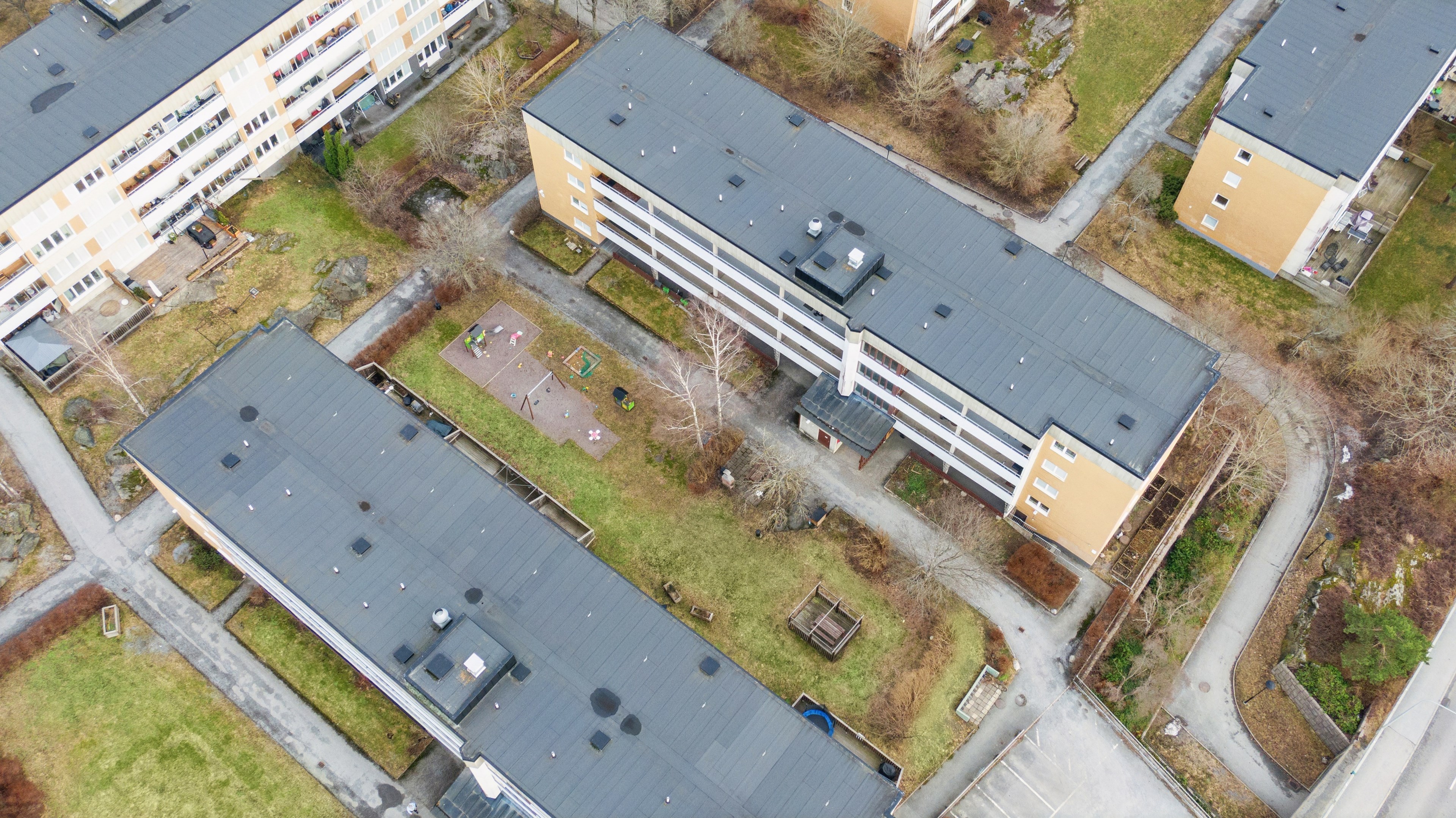 Lugn innegård med lekplats