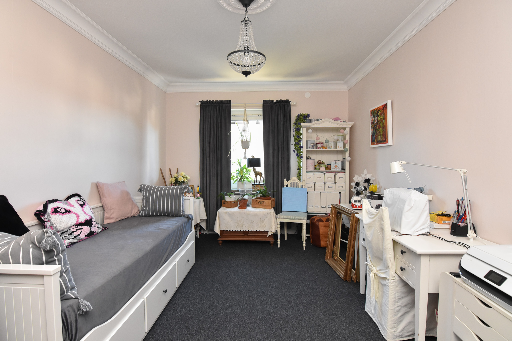 Ett trivsamt större sovrum med mörkgrå heltäckningsmatta (ny). Här finns plats för såväl bäddsoffa som skrivbord och extra förvaring. I rummet finns även linneskåp med överskåp.