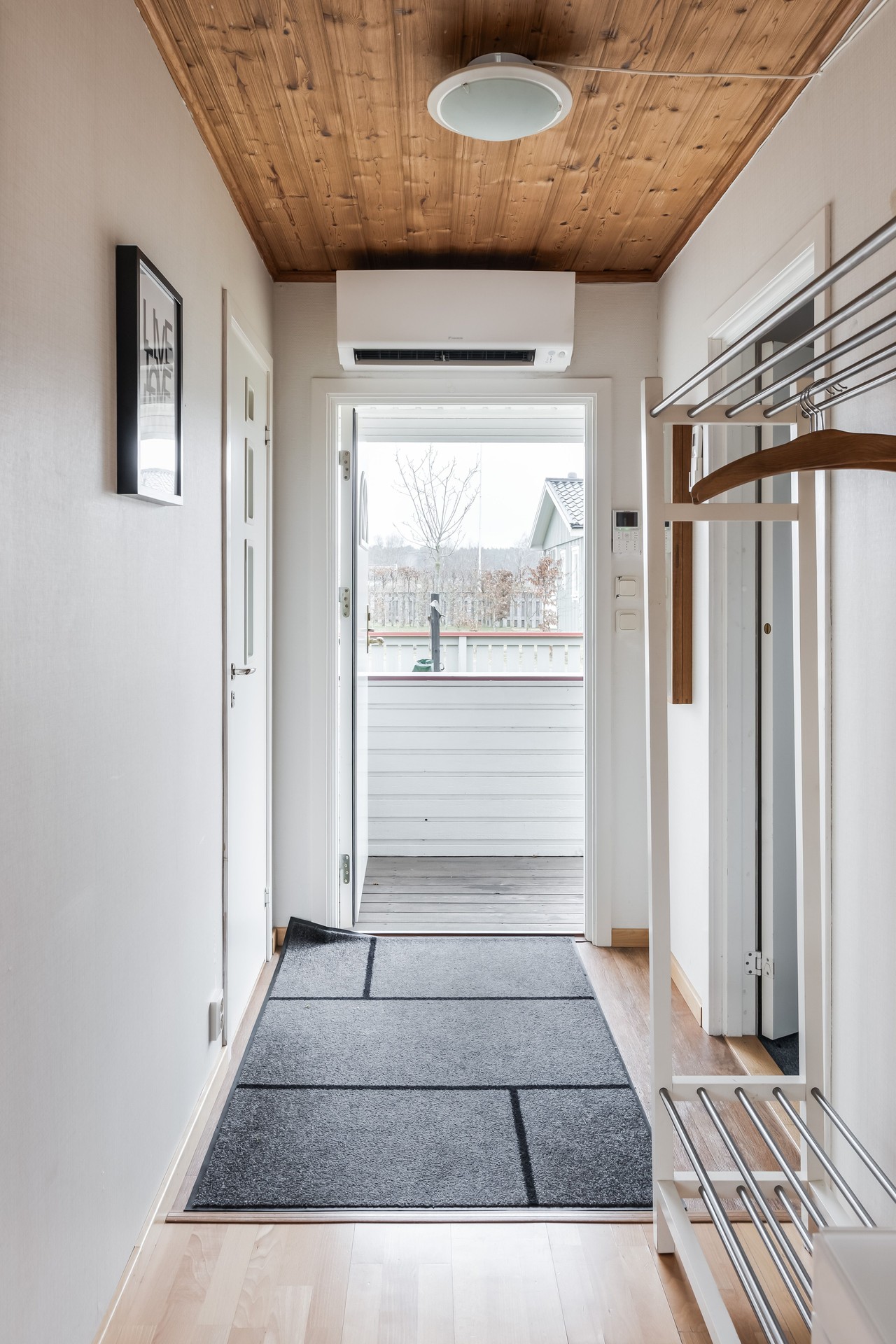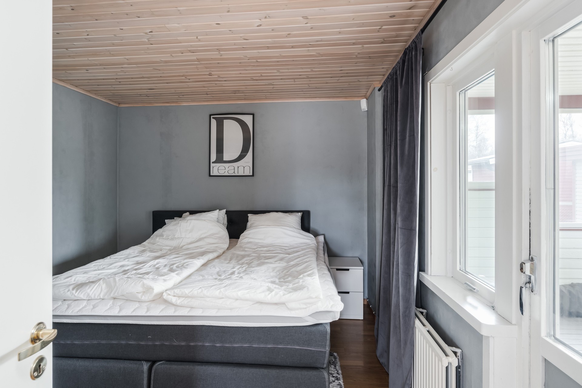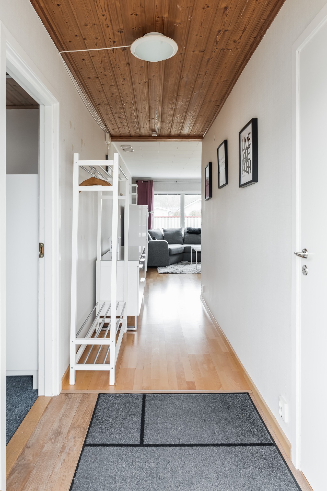 Entré via farstukvist in i hall med passage in i huset. Härifrån nås direkt det mindre sovrummet samt badrummet. Badrummet går i ljusa behagliga toner och är utrustat med dusch, toalett, kommod med tvättställ och tvättmaskin. Vidare in möter vi vardagsrum och kök i öppen planlösning. Vardagsrummet har stora fönsterpartier mot söder med fina ljusinsläpp, och köket har inredning i modernt grönt. Kök med goda arbetsytor i vinkel och en långbänk med ytterligare gott om förvaringsmöjligheter. Det stora vardagsrummet rymmer en stör dubbelsäng och har flera garderober samt egen utgång mot uterummet och vidare passage ut mot trädgården i söder.