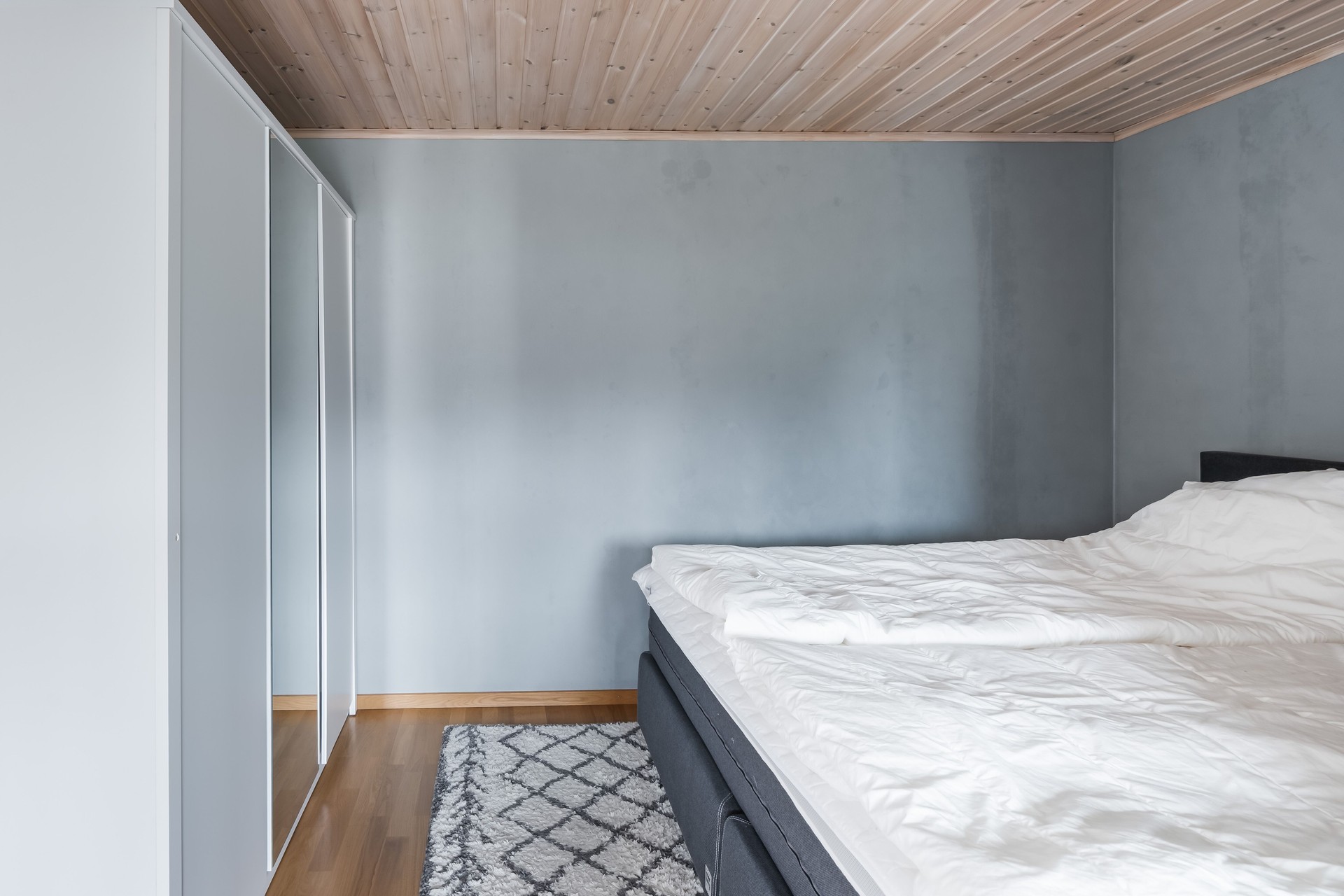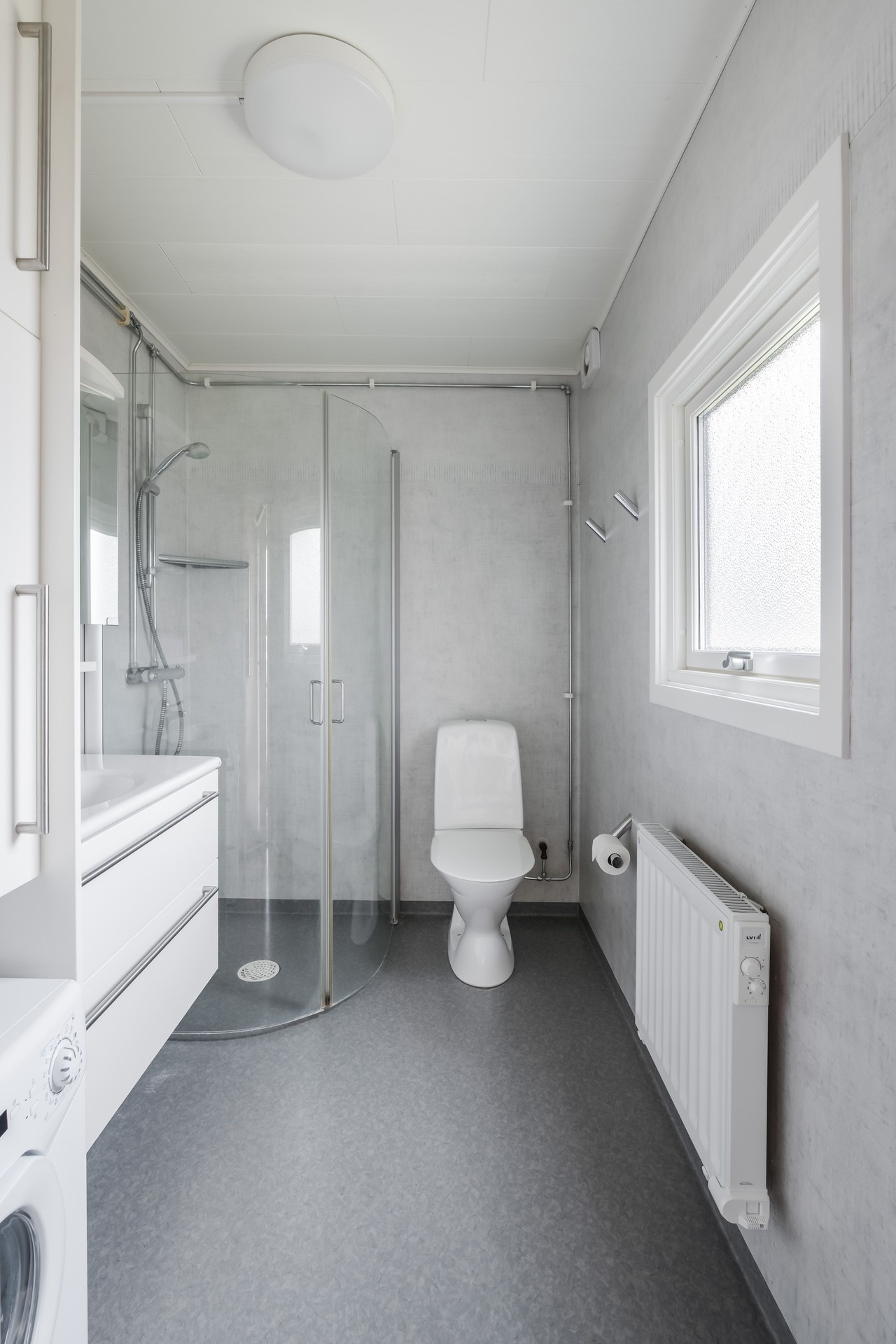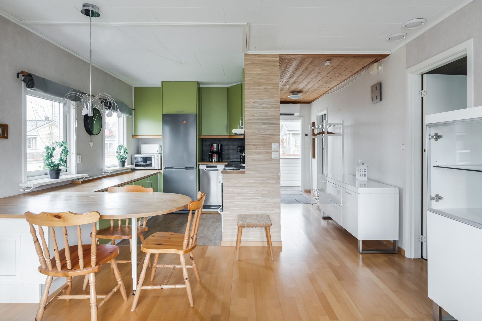 Entré via farstukvist in i hall med passage in i huset. Härifrån nås direkt det mindre sovrummet samt badrummet. Badrummet går i ljusa behagliga toner och är utrustat med dusch, toalett, kommod med tvättställ och tvättmaskin. Vidare in möter vi vardagsrum och kök i öppen planlösning. Vardagsrummet har stora fönsterpartier mot söder med fina ljusinsläpp, och köket har inredning i modernt grönt. Kök med goda arbetsytor i vinkel och en långbänk med ytterligare gott om förvaringsmöjligheter. Det stora vardagsrummet rymmer en stör dubbelsäng och har flera garderober samt egen utgång mot uterummet och vidare passage ut mot trädgården i söder.