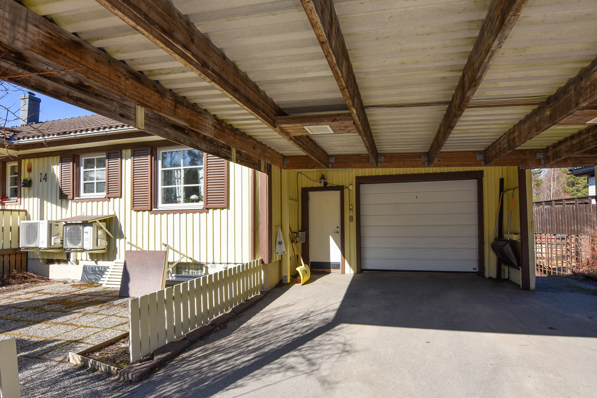 Vidbyggt isolerat garage med vatten, avlopp och elport, plats för 1 bil. Carport för 2 bilar utanför garaget.Bredband