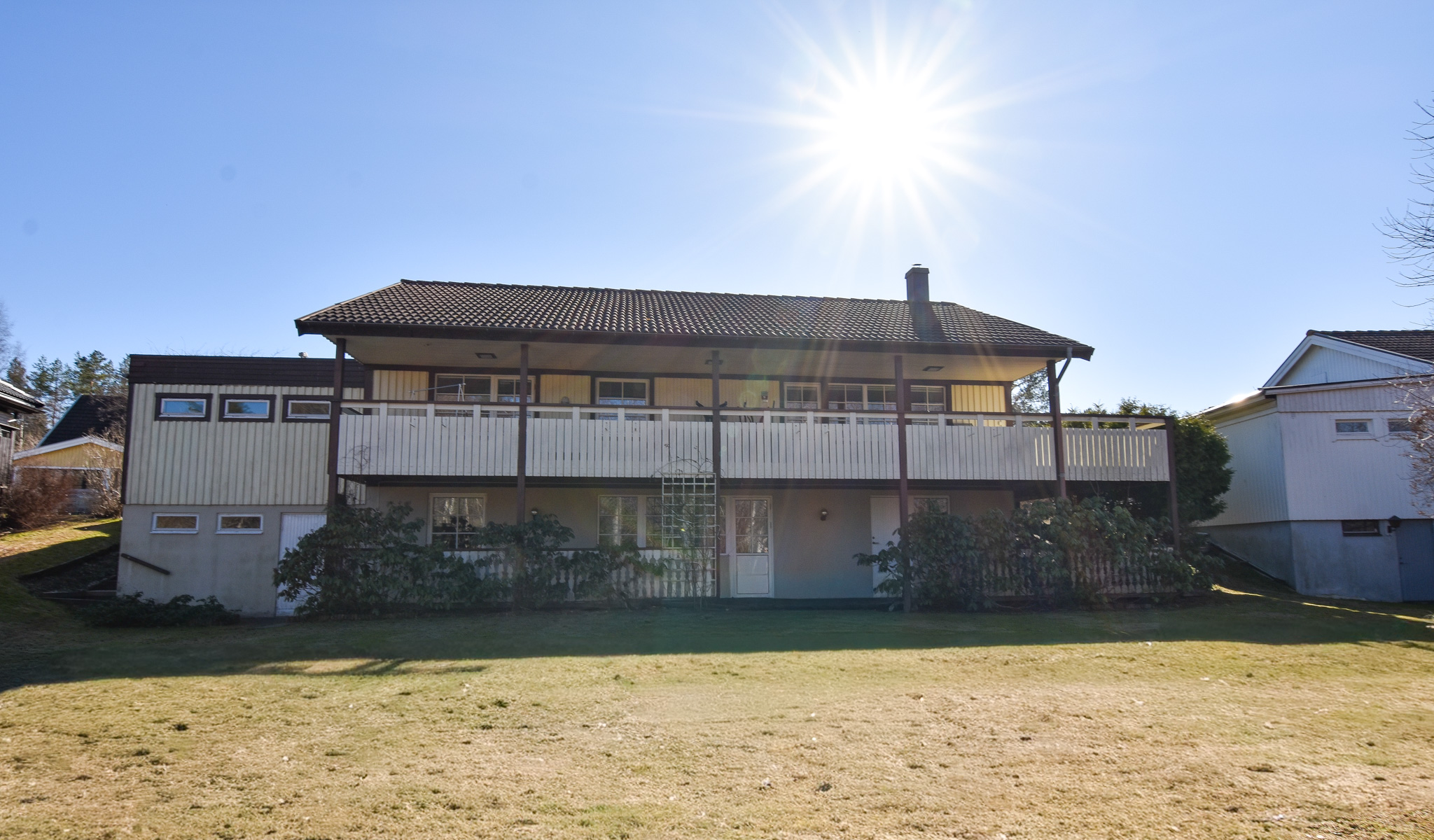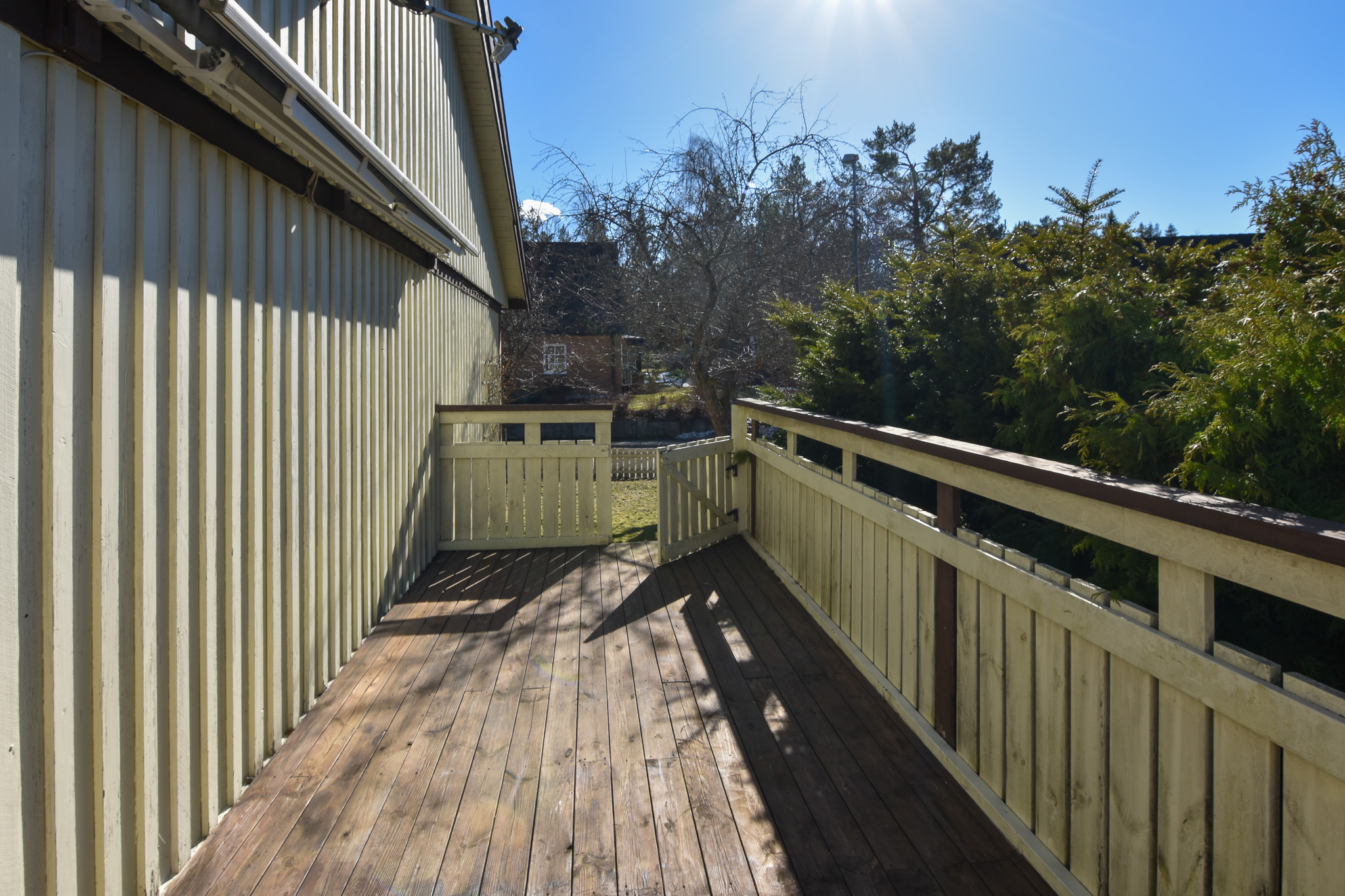 Takad balkong längs husets långsida (baksida) i vinkel med en öppen altan (med markis) i väster med kvällssol. Takad altan längs huset långsida (baksida). Stensatt uteplats till höger om husets entré i soligt söderläge.