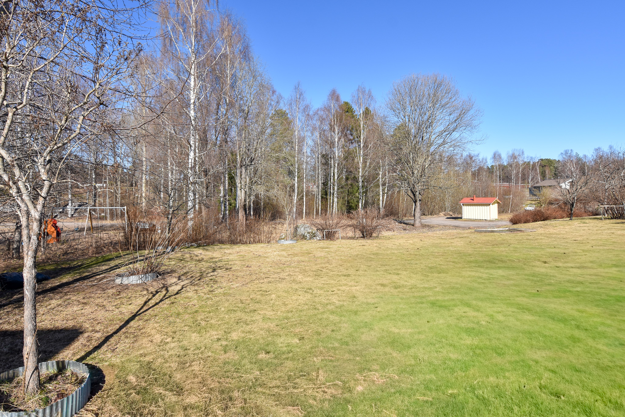 Trädgårdstomt med fina gräsytor (gräsklippar-robbot ingår i köpet), trädgårdsland, bärbuskar, fruktträd och perenna växter.