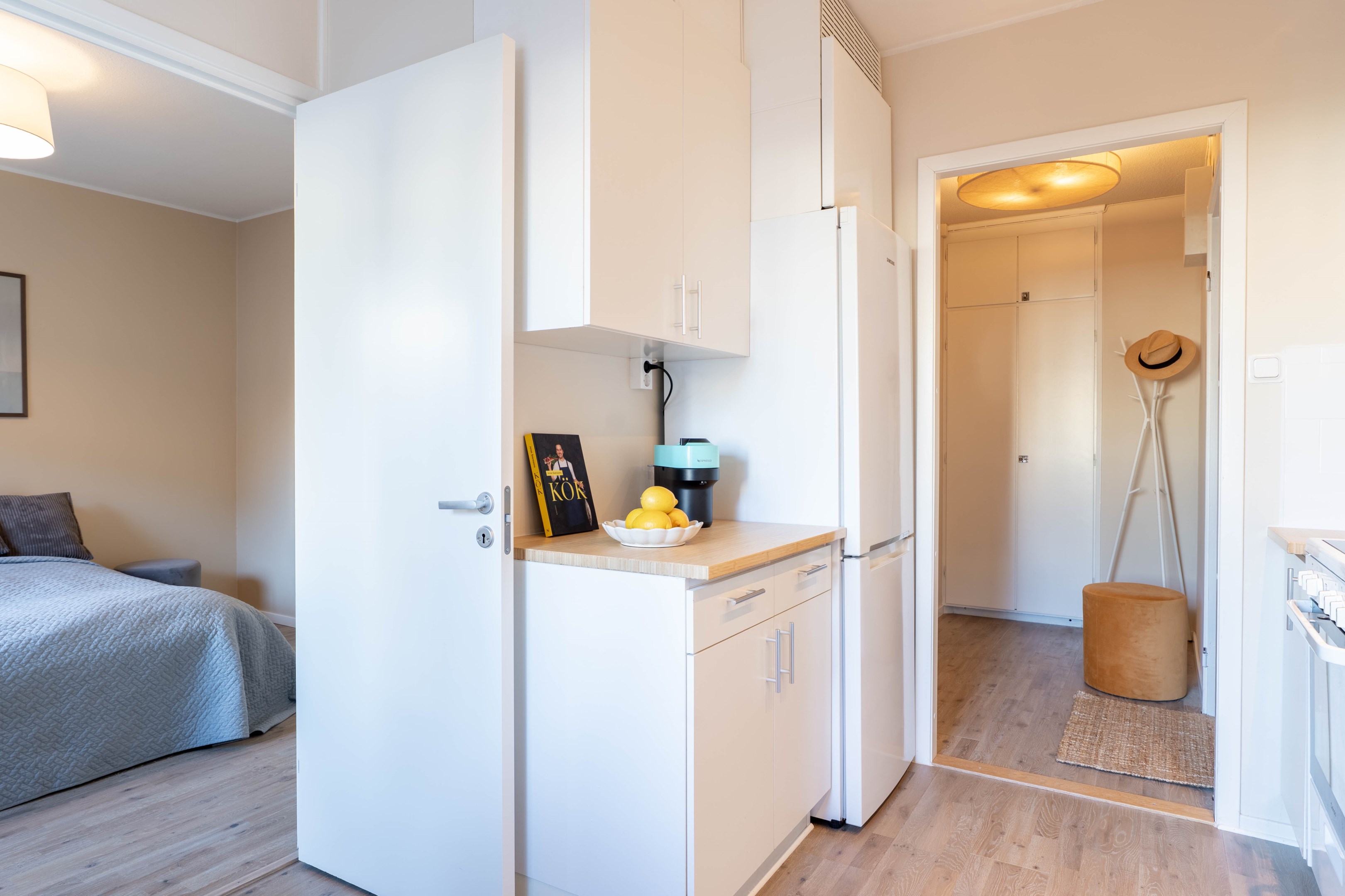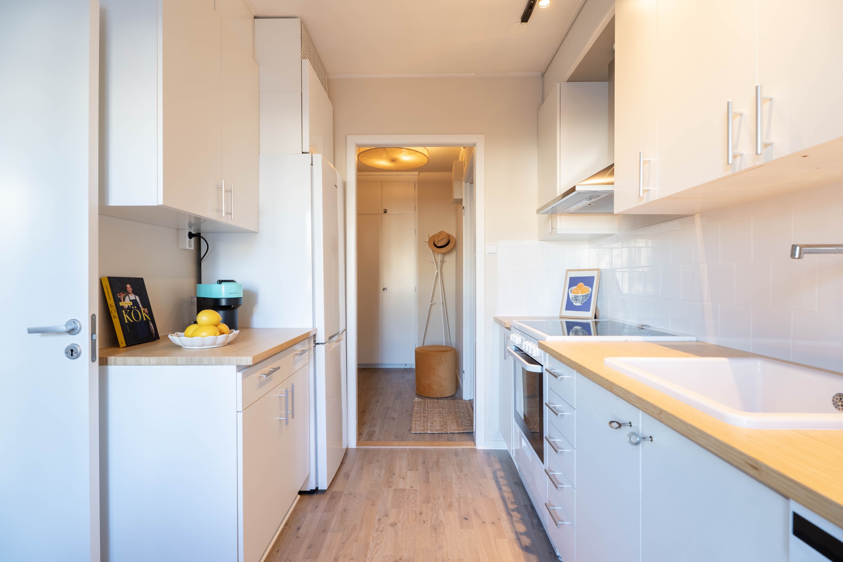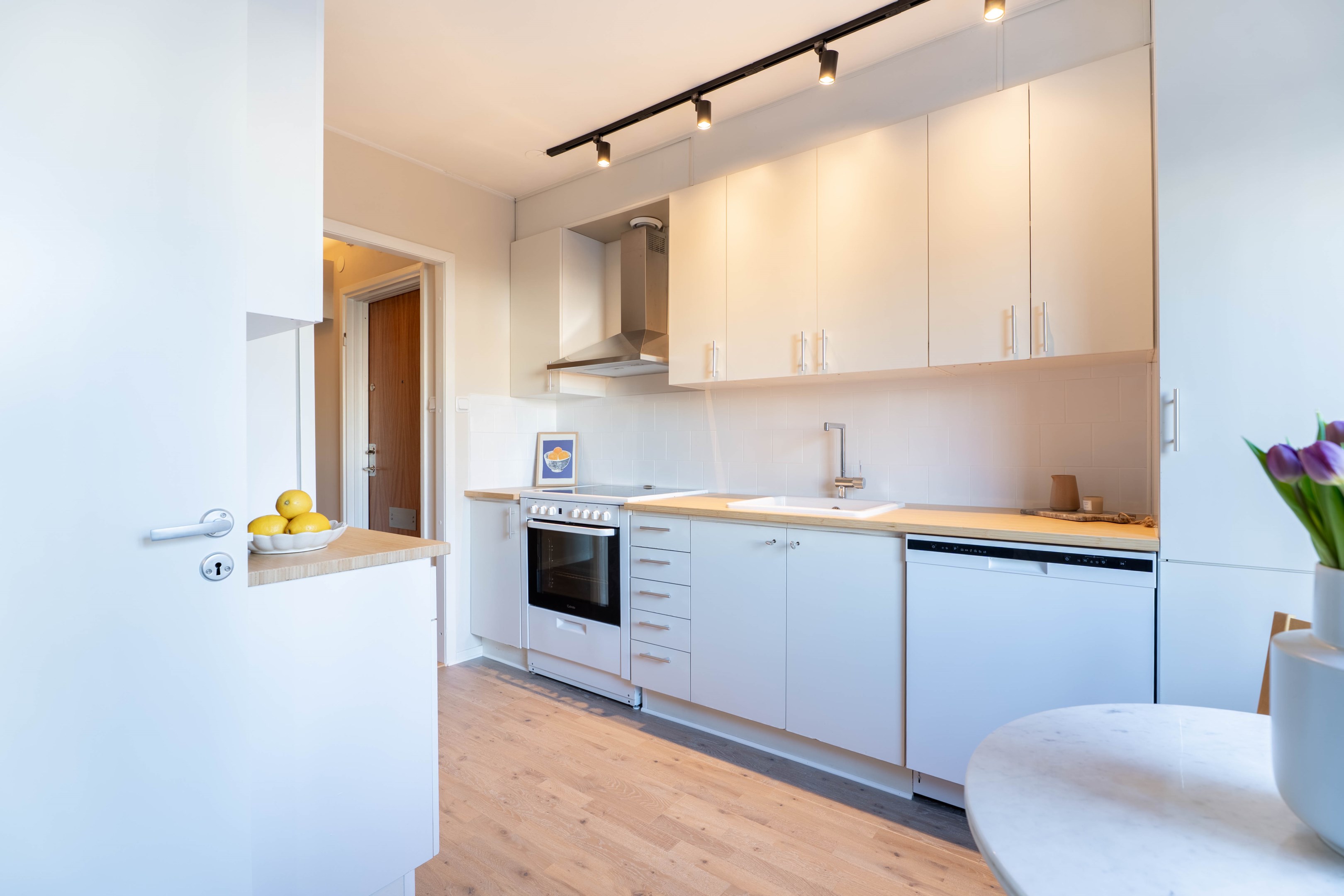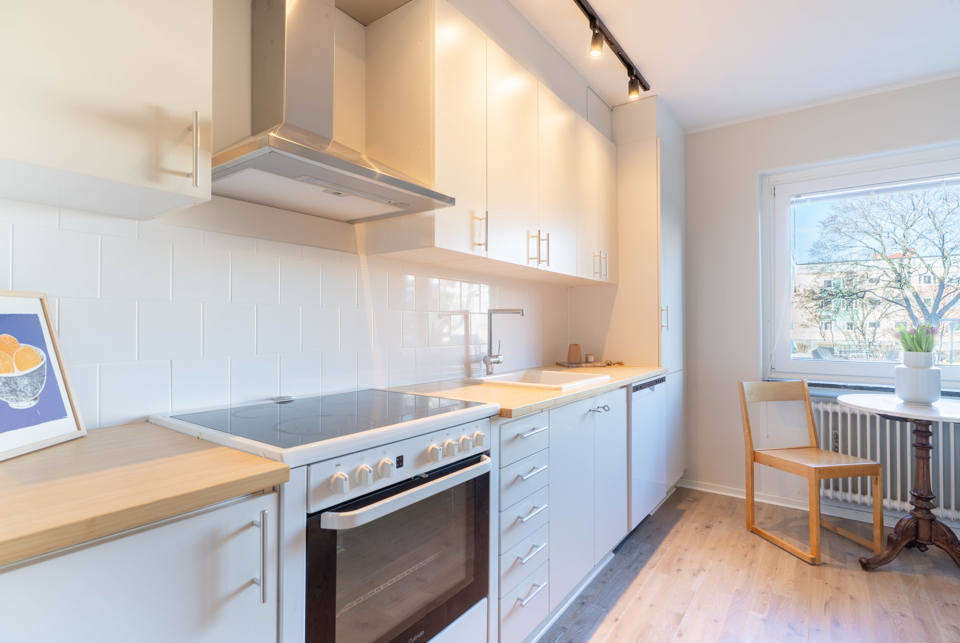 Varmt välkommen till denna stilrena och inbjudande tvåa på eftertraktade Norr – ett hem som kombinerar smart planlösning med moderna och fräscha ytskikt! Redan i hallen möts du av en ljus och välkomnande atmosfär med generösa ytor för avhängning samt utmärkt förvaring i en praktisk klädkammare. Vidare in i bostaden finner du det smakfulla köket som går i ljusa, tidlösa nyanser. Här flödar dagsljuset in och skapar en trivsam miljö med gott om plats för matbord – perfekt för både vardagsmiddagar och sociala tillställningar. Förvaringsmöjligheterna är rikliga med både skåp och lådor & diskmaskinen förenklar vardagen. Det nyligen renoverade badrummet erbjuder en modern och stilren känsla med dusch bakom eleganta vikbara glasdörrar, kommod med handfat, wc samt bekvämligheten av egen kombinerad tvättmaskin/torktumlare. Sovrummet är rofyllt och generöst tilltaget med plats för en dubbelsäng och möjlighet att komplettera med garderob efter behov. Det luftiga vardagsrummet blir hemmets naturliga samlingspunkt – en social yta med gott om plats för en större soffgrupp, matbord och övrigt möblemang om det önskas. Härifrån når du även den mysiga inglasade balkongen, som vetter lugnt mot föreningens grönskande innergård och erbjuder plats för utemöbler – en perfekt oas för avkoppling. Bostaden har dessutom nyligen uppdaterats med nya ytskikt i form av ett enhetligt golv och nymålade väggar i ljusa, moderna färgval, vilket skapar ett genomgående fräscht och harmoniskt intryck.