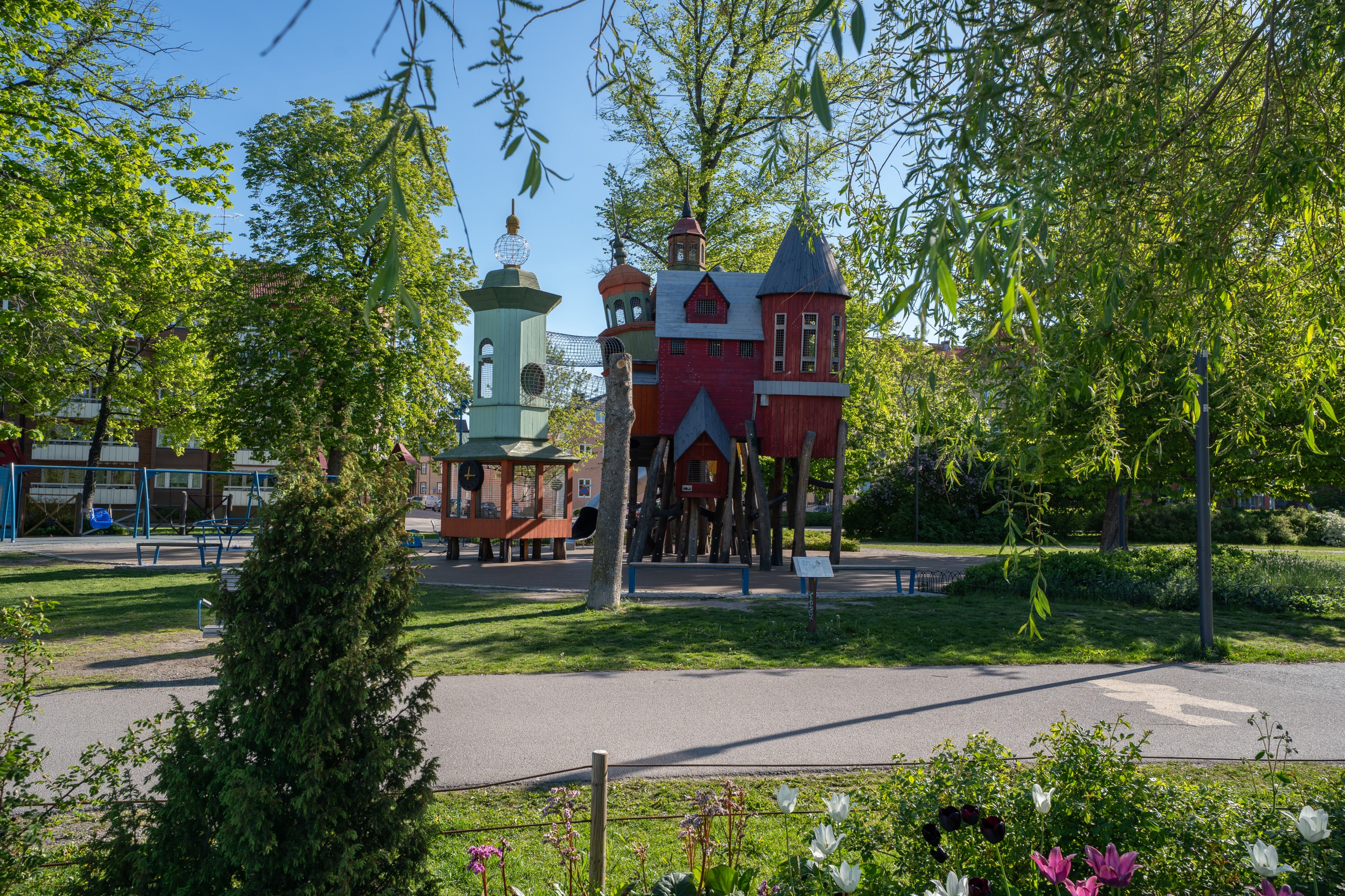 Stor grön innergård med lekplats och trevliga grillplatser. Här finns även soprum.