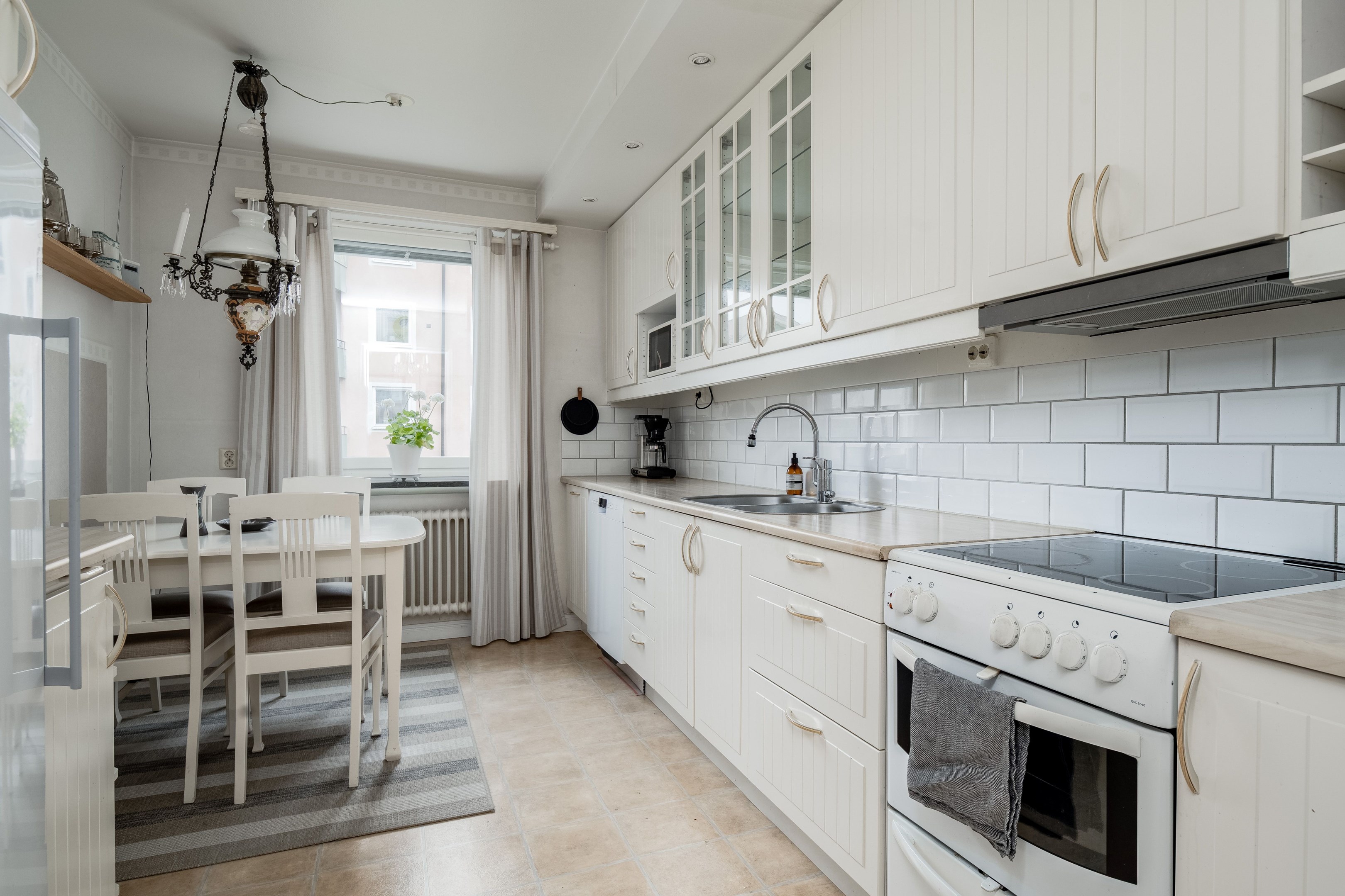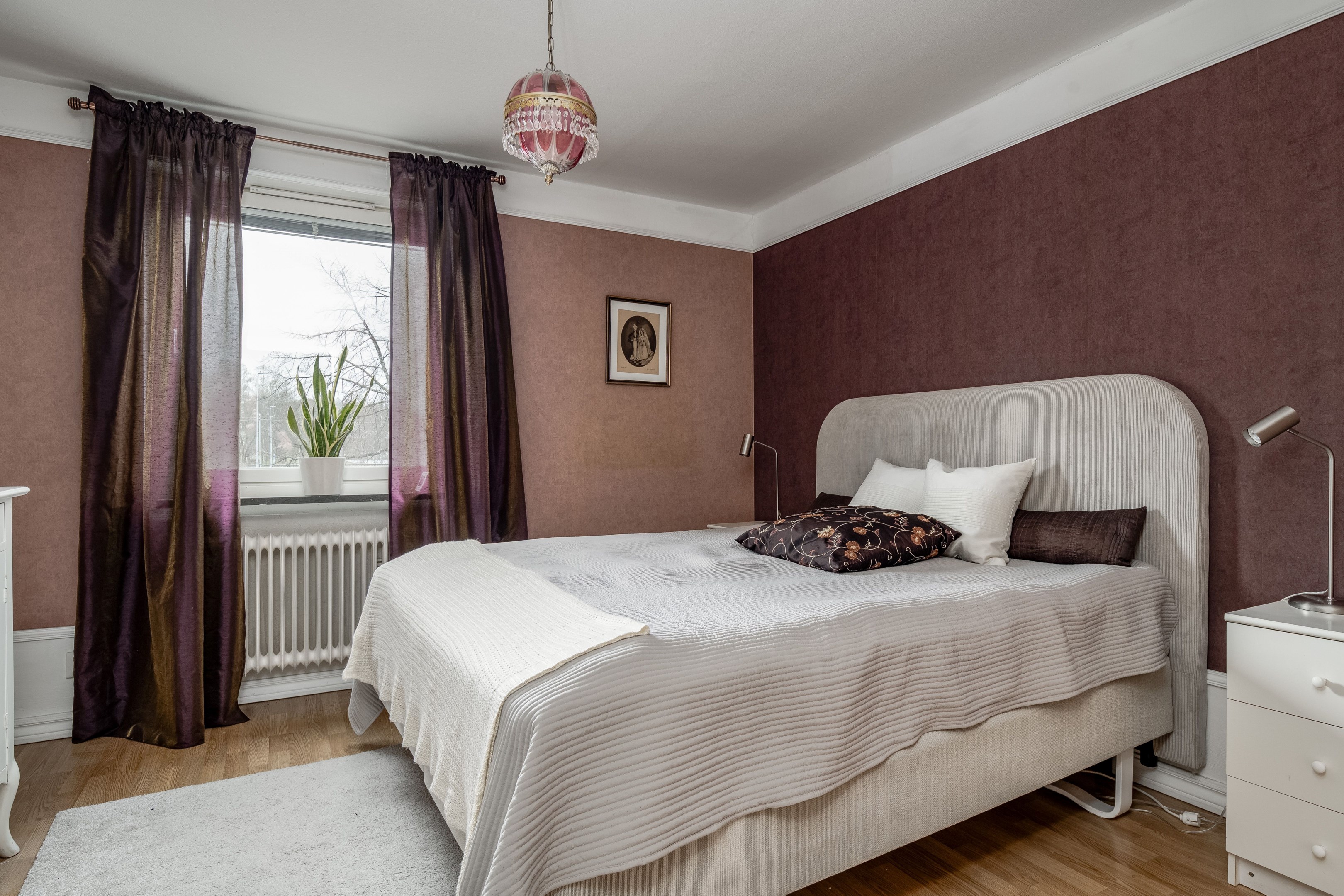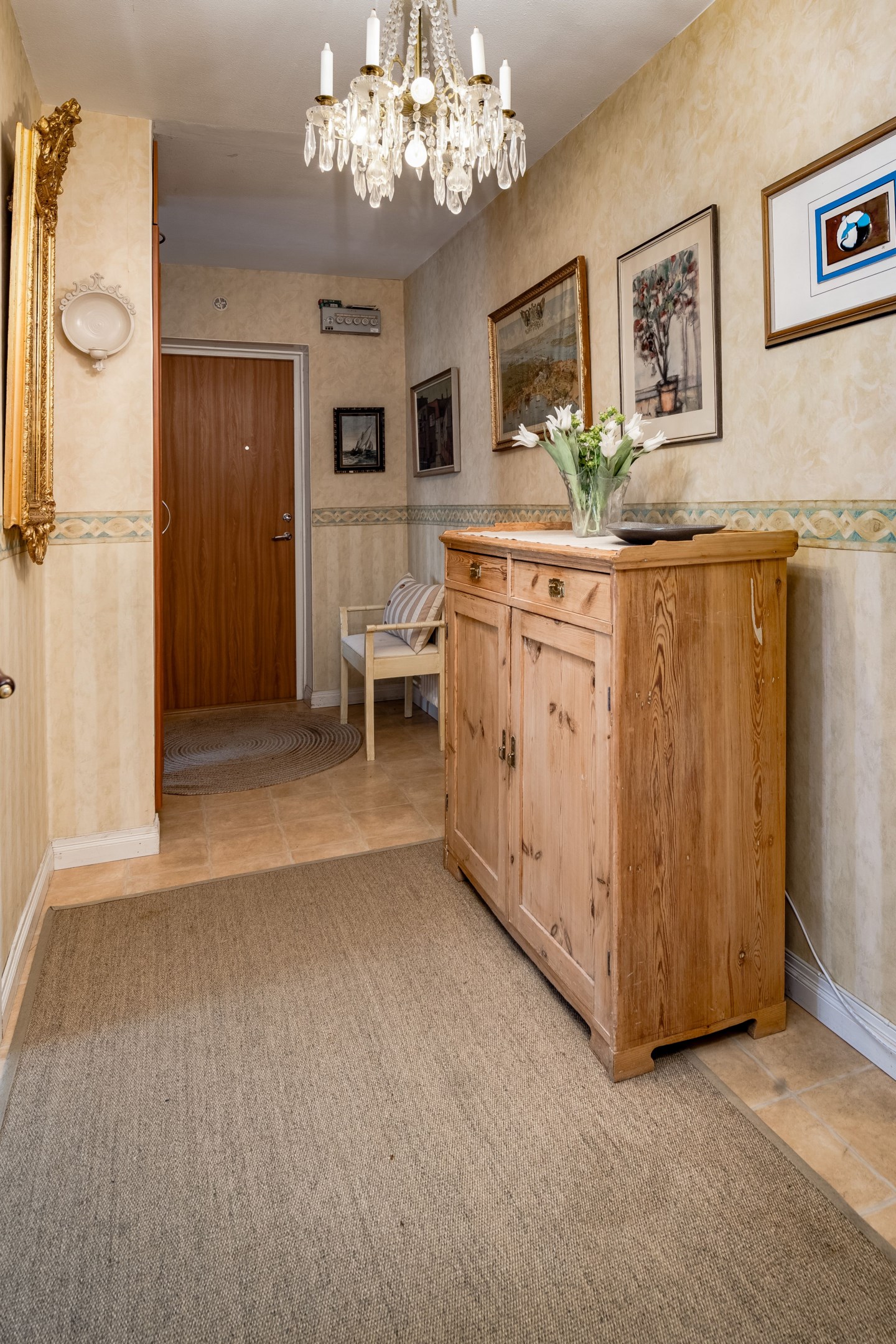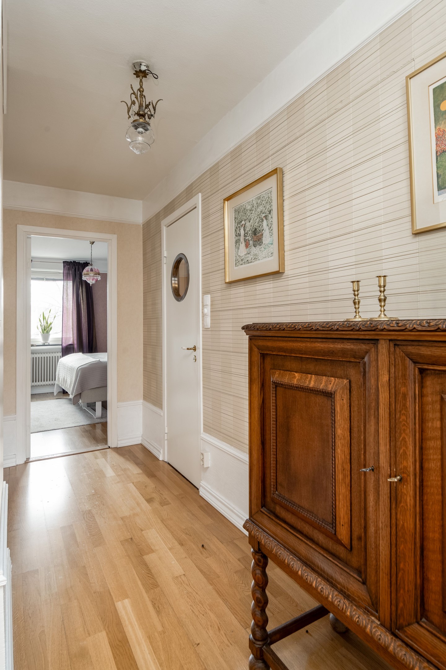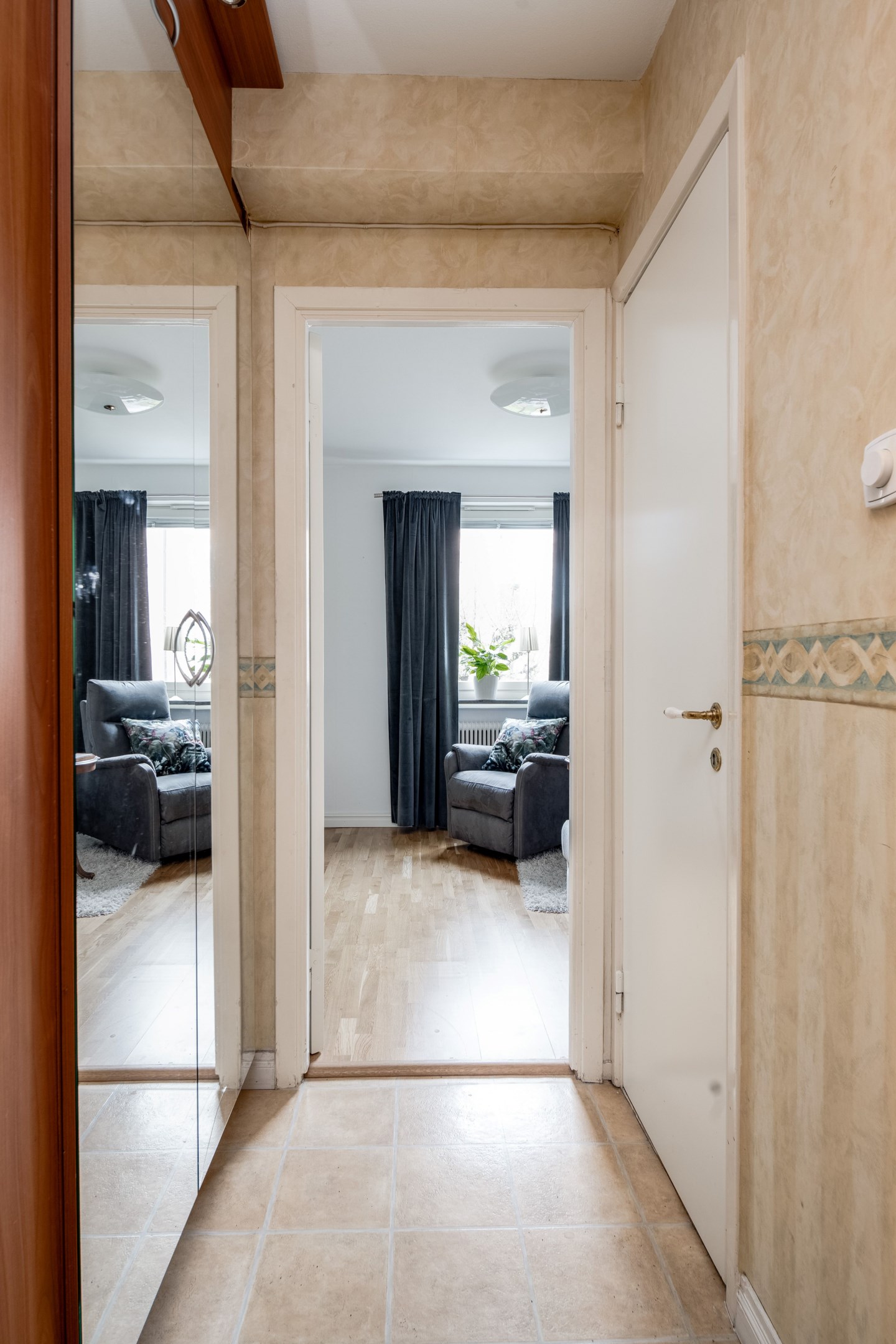 Möblerbar hall med dubbelgarderob med spegeldörrar. Plastmatta och tapet. Gästtoalett med handfat. Kakel och klinker. Del av vägg är framtaget tegel. Sovrum med ekparkett och tapet. Ljust kök med matplats för fyra personer. Utrustat med: hel kyl och frys, spis, diskmaskin och fläkt. Plastmatta och tapet. Stort vardagsrum som ger plats åt både soff- och matgrupp. Utgång till balkong mot sydost. Ekparkett och tapet. (tidigare var del av rummet bostadens tredje sovrum, men en vägg har tagits bort och kan givetvis återställas) Renoverat badrum 2015 med kakel och klinker. Utrustat med: duschväggar, toalett, handfat och handdukstork. I utrymmet finns även två rymliga garderober. Sovrum med ekparkett och tapet. Förråd finns både på vinden och i källaren .