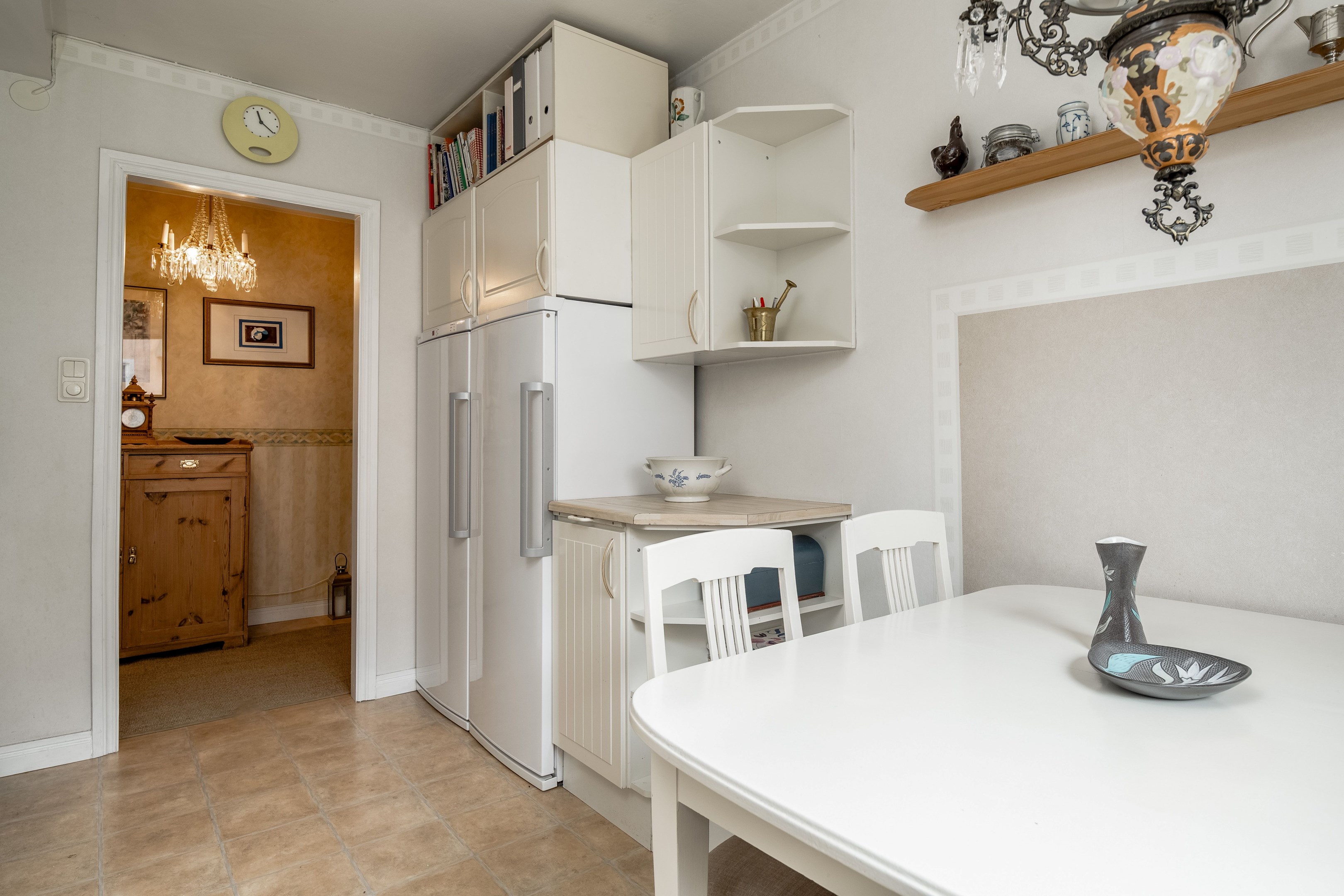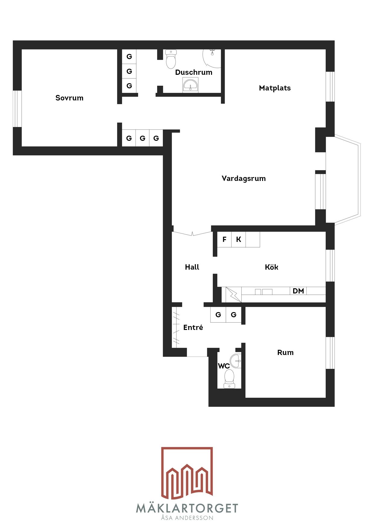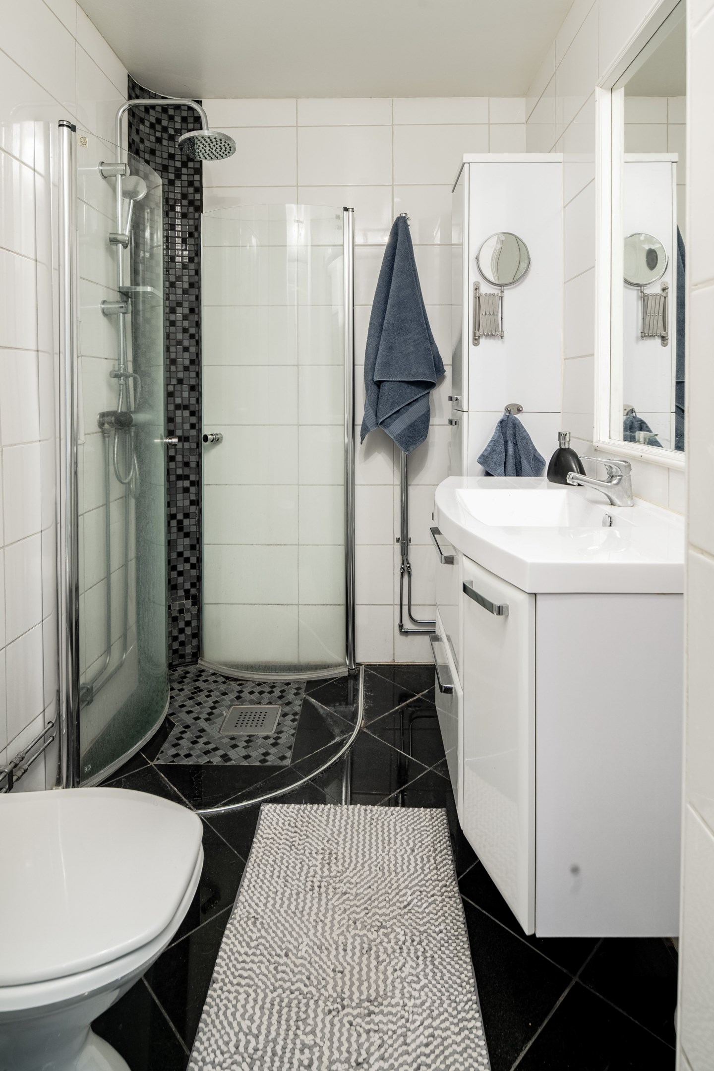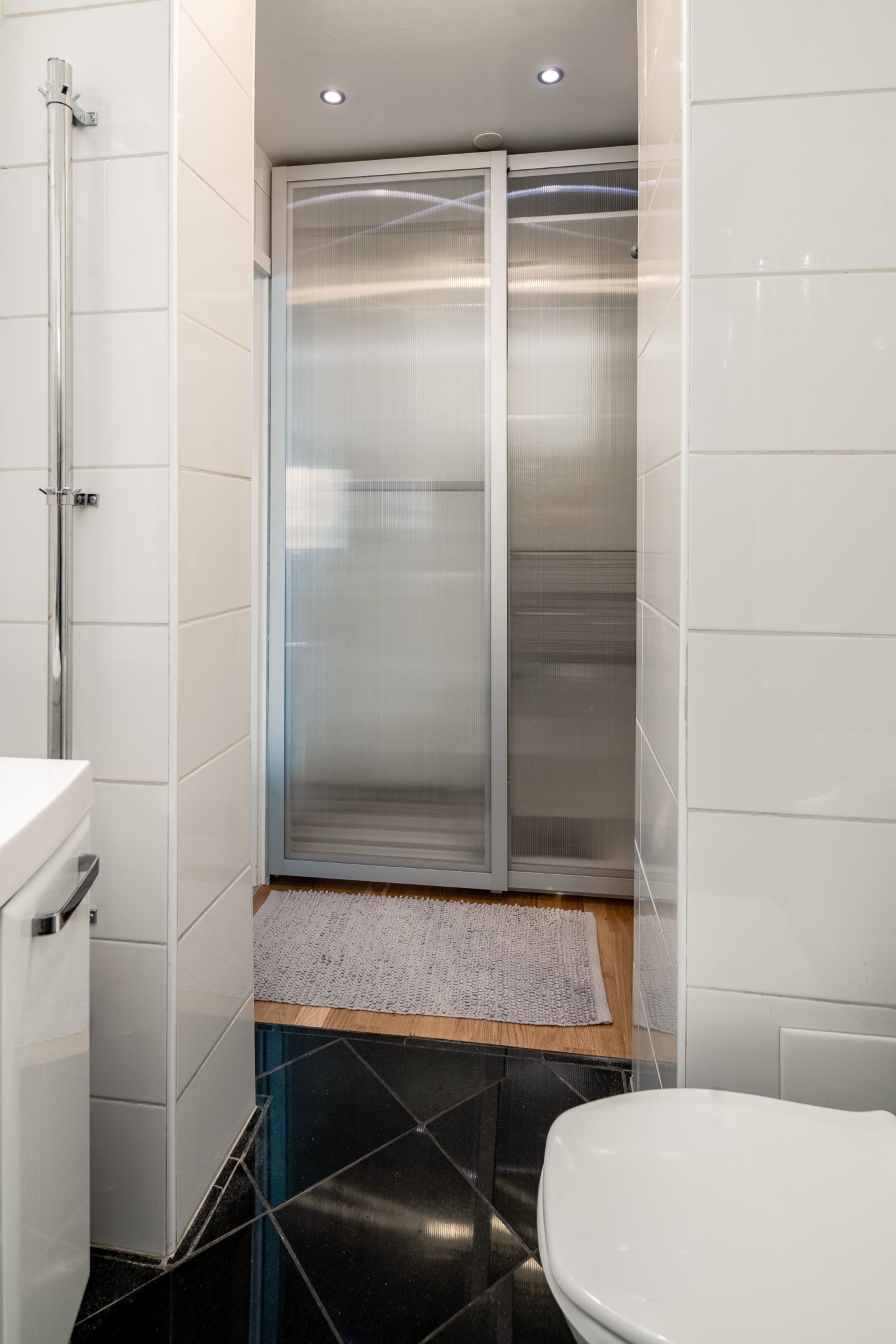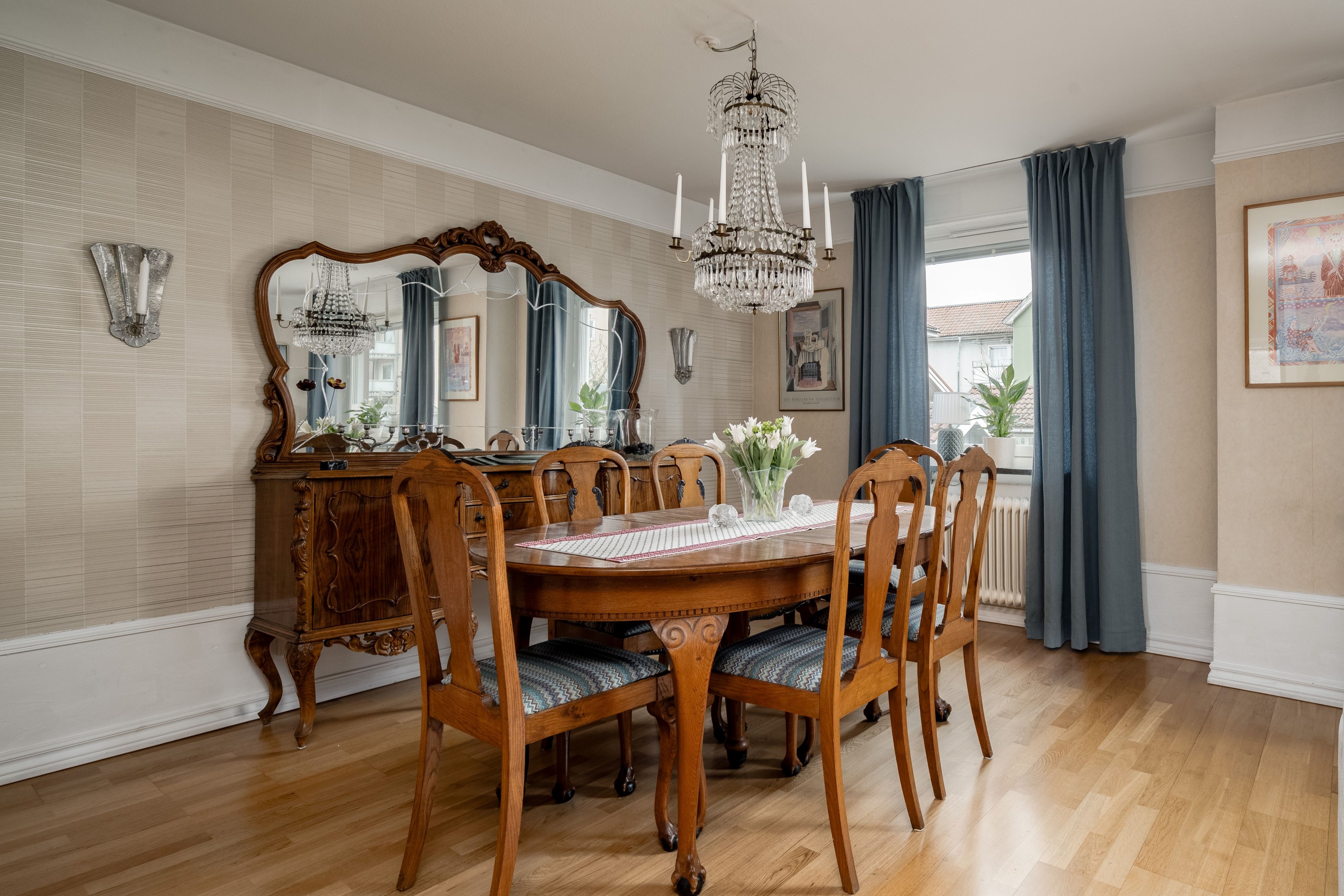 Möblerbar hall med dubbelgarderob med spegeldörrar. Plastmatta och tapet. Gästtoalett med handfat. Kakel och klinker. Del av vägg är framtaget tegel. Sovrum med ekparkett och tapet. Ljust kök med matplats för fyra personer. Utrustat med: hel kyl och frys, spis, diskmaskin och fläkt. Plastmatta och tapet. Stort vardagsrum som ger plats åt både soff- och matgrupp. Utgång till balkong mot sydost. Ekparkett och tapet. (tidigare var del av rummet bostadens tredje sovrum, men en vägg har tagits bort och kan givetvis återställas) Renoverat badrum 2015 med kakel och klinker. Utrustat med: duschväggar, toalett, handfat och handdukstork. I utrymmet finns även två rymliga garderober. Sovrum med ekparkett och tapet. Förråd finns både på vinden och i källaren .