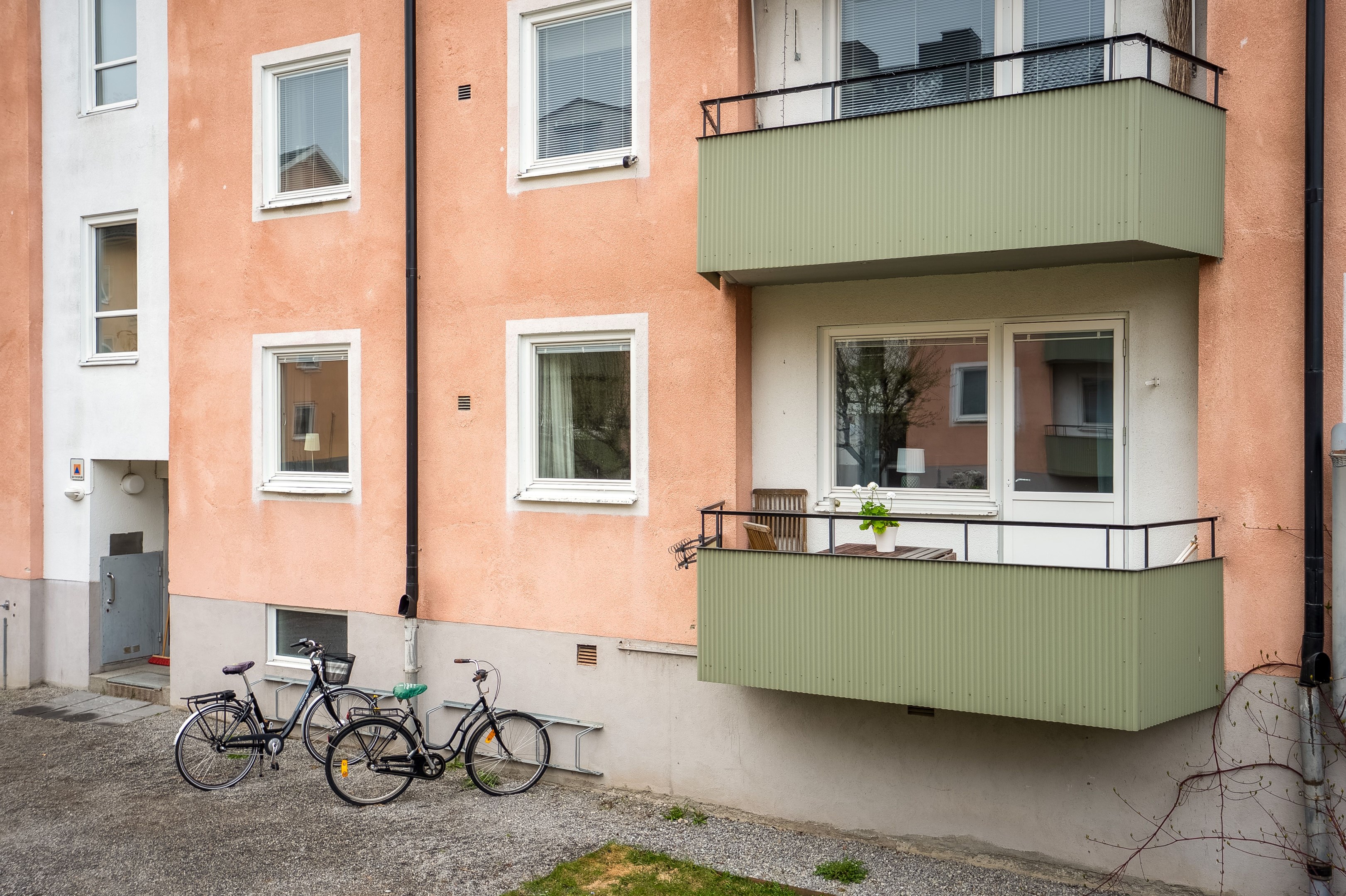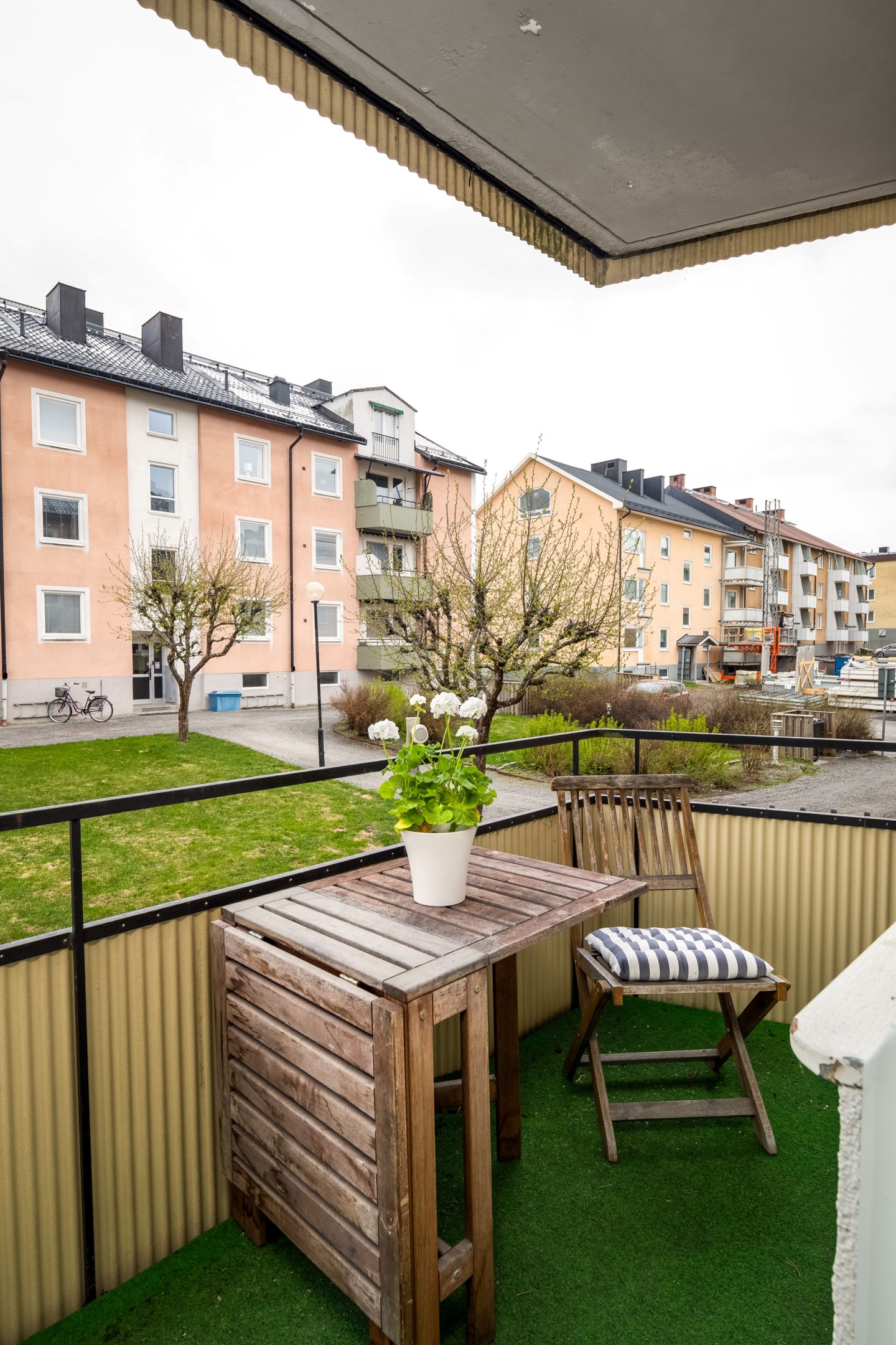 Balkong mot öster, sol fram till 13.30 ca. Det finns även gemensam uteplats på innergården.